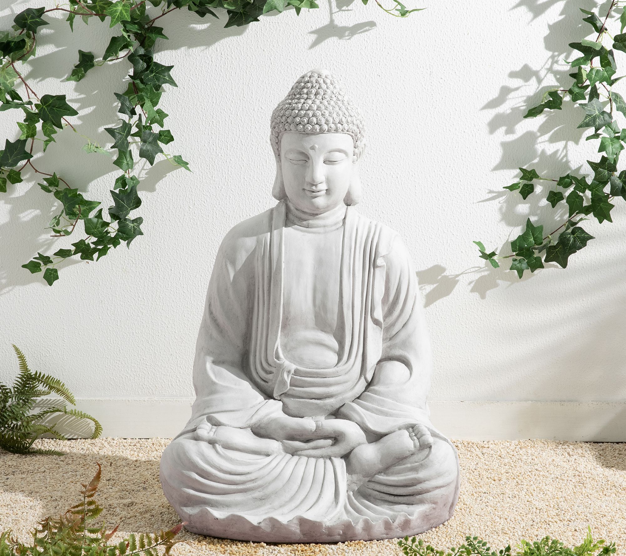 Bring a peaceful ambience to your garden, patio, or meditation space with this oversized Buddha statue. Finished in a smooth white with bronzetone accents, this sculptural piece welcomes serenity wherever it's displayed, while the classic meditating pose and flowing robe details evoke a sense of calm that soothes the soul. From Glitzhome.