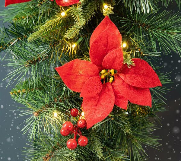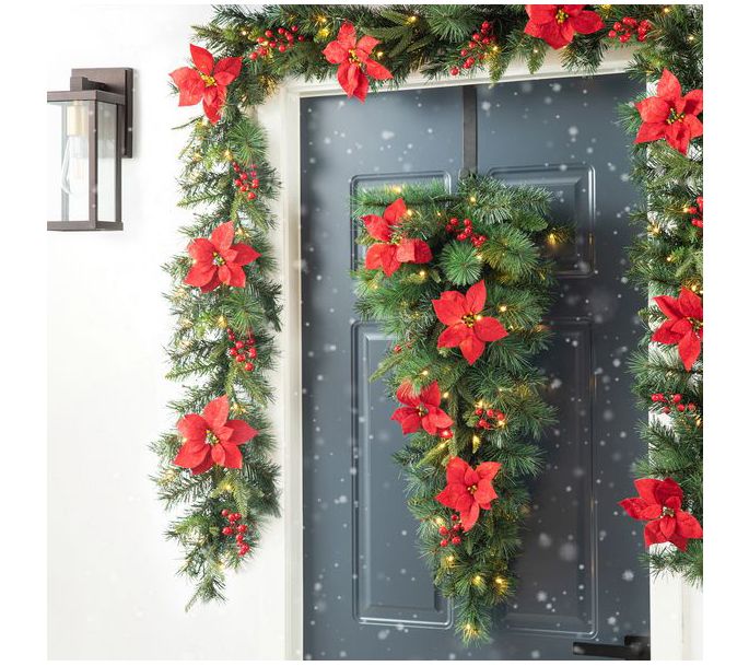 Brighten your holiday home with this poinsettia-dotted swag featuring glowing lights that add festive atmosphere to any space. From Glitzhome.
