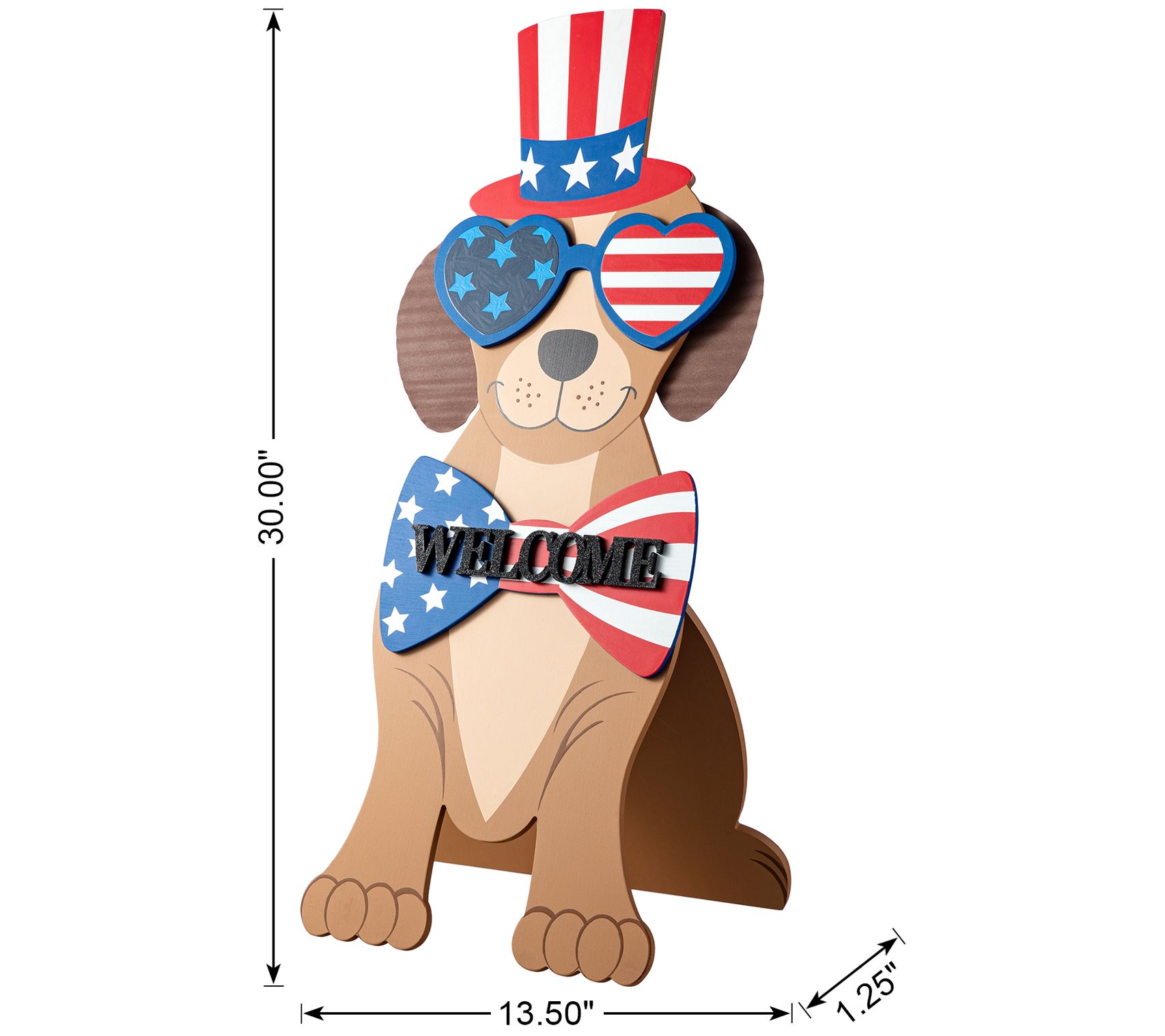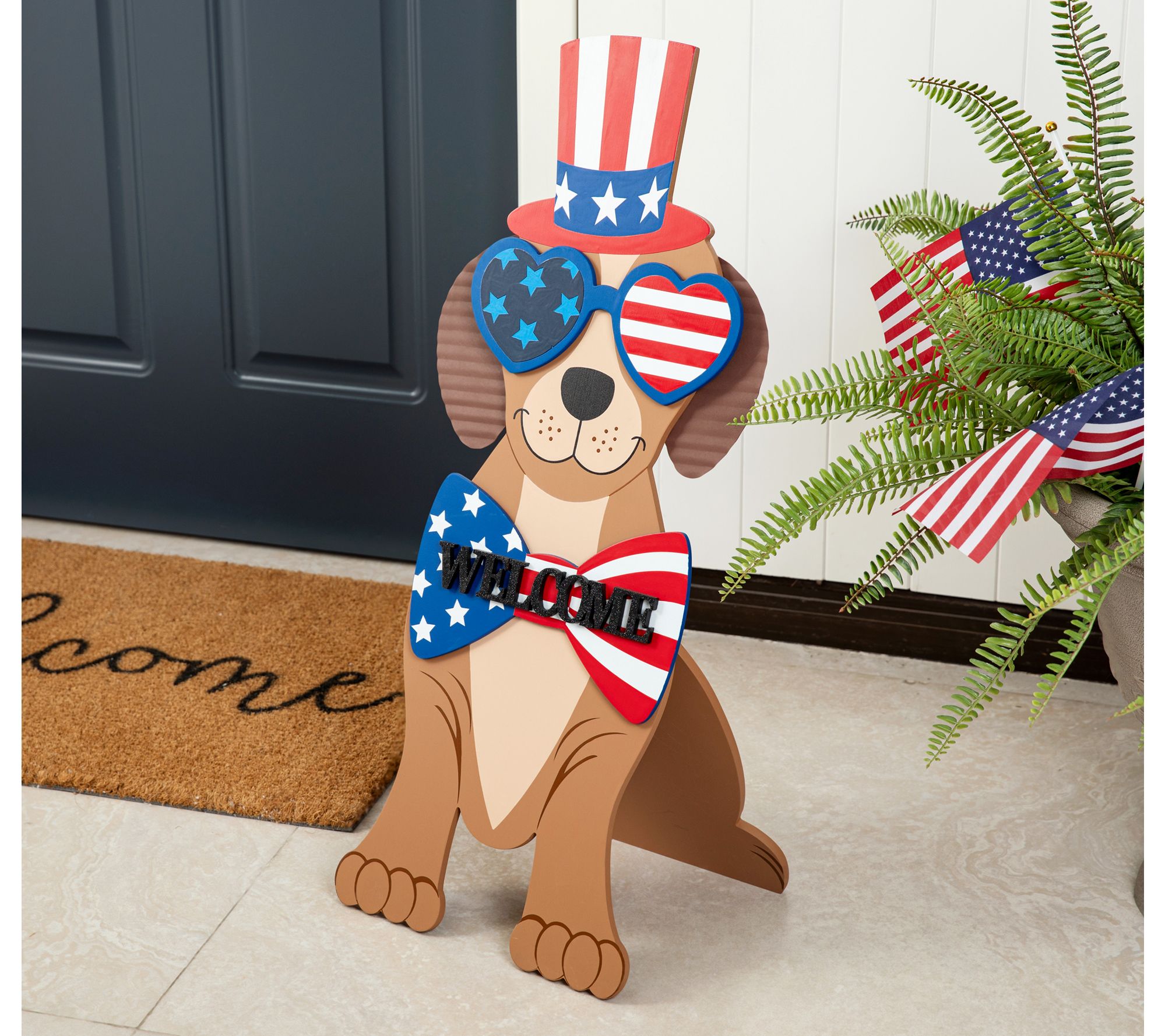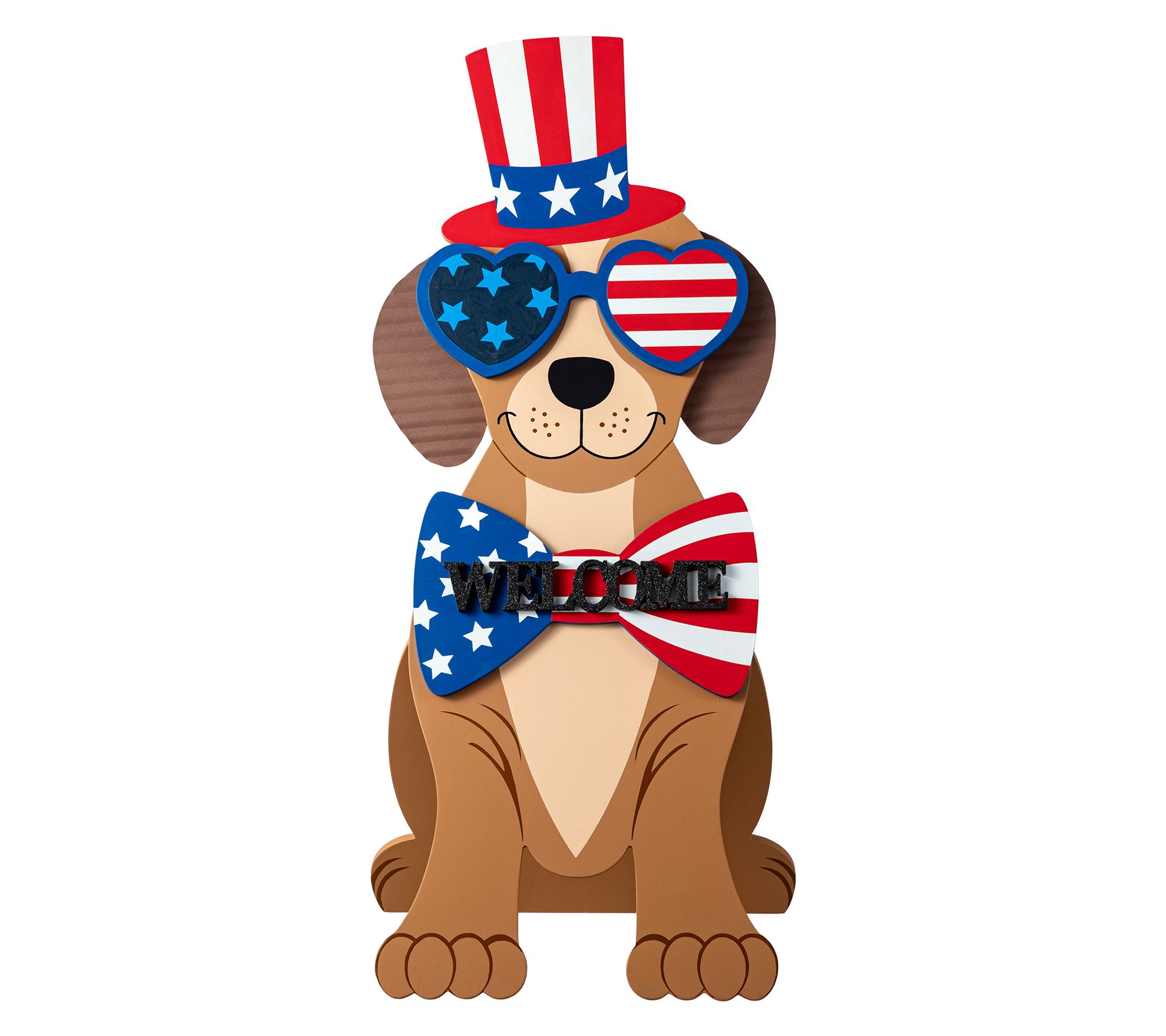 Show off your patriotic spirit with this charming Labrador Retriever porch sign. Featuring a dapper top hat, stylish sunglasses, and a bow tie, it is perfect for adding a touch of joy to any holiday home. From Glitzhome.