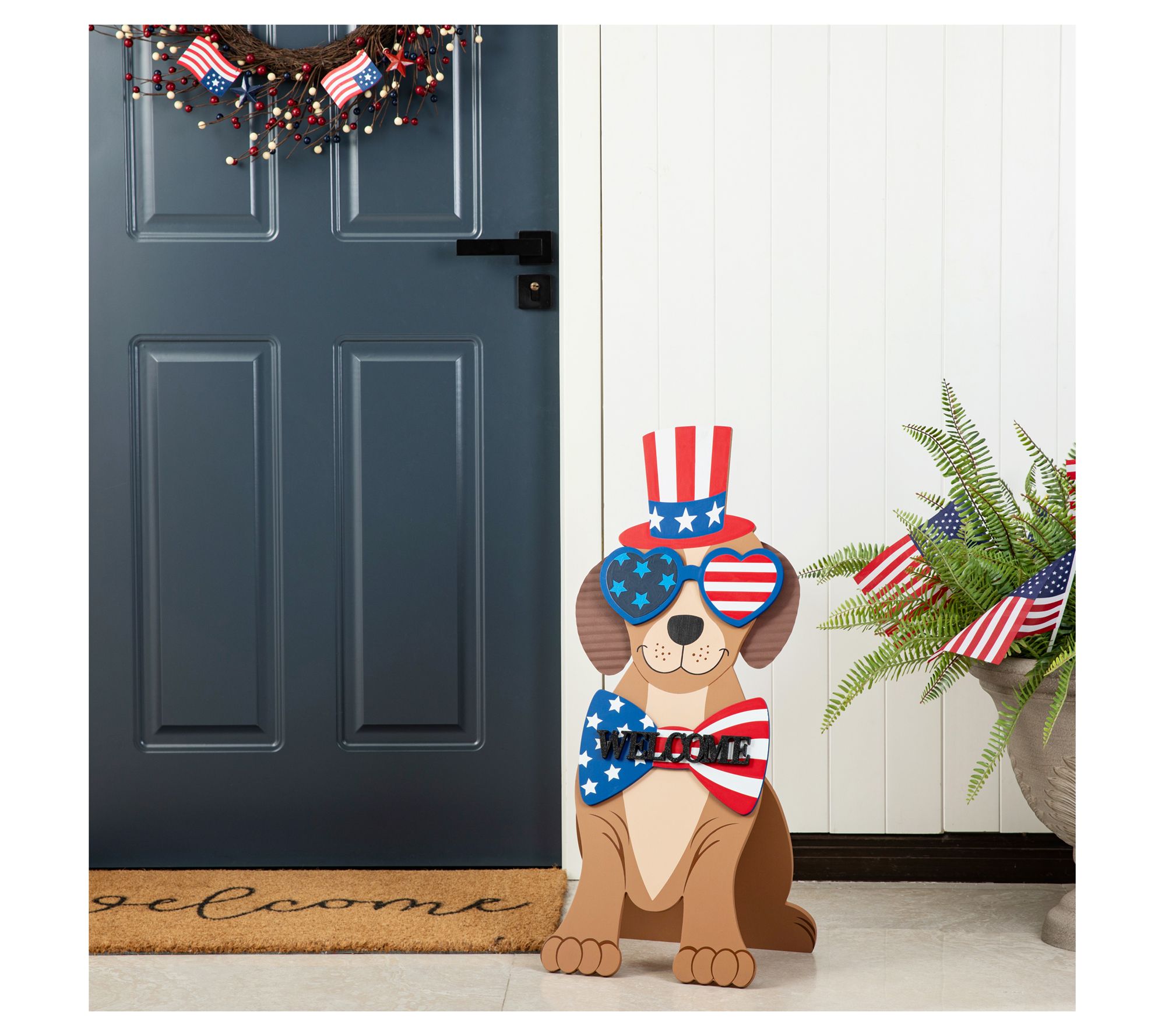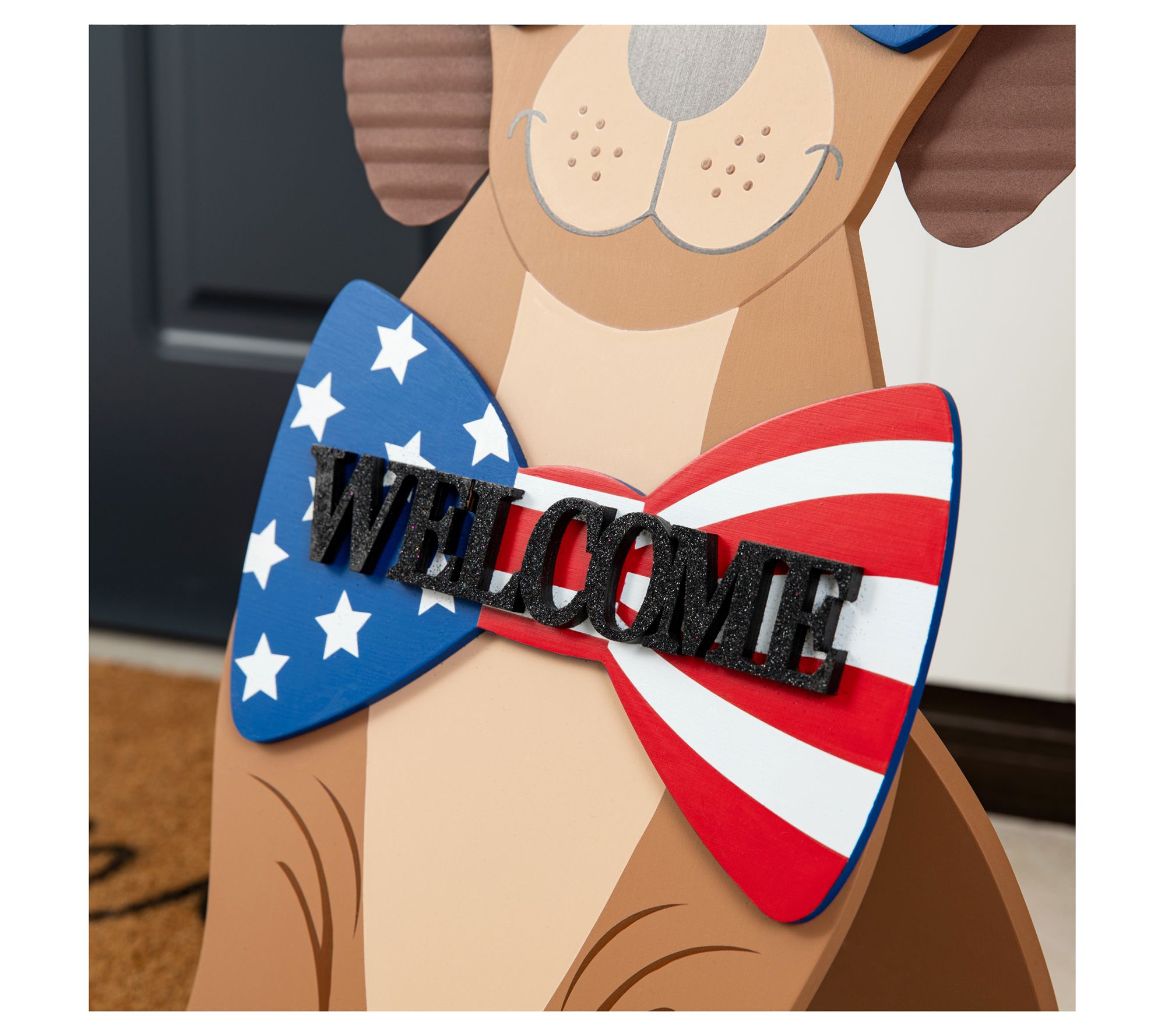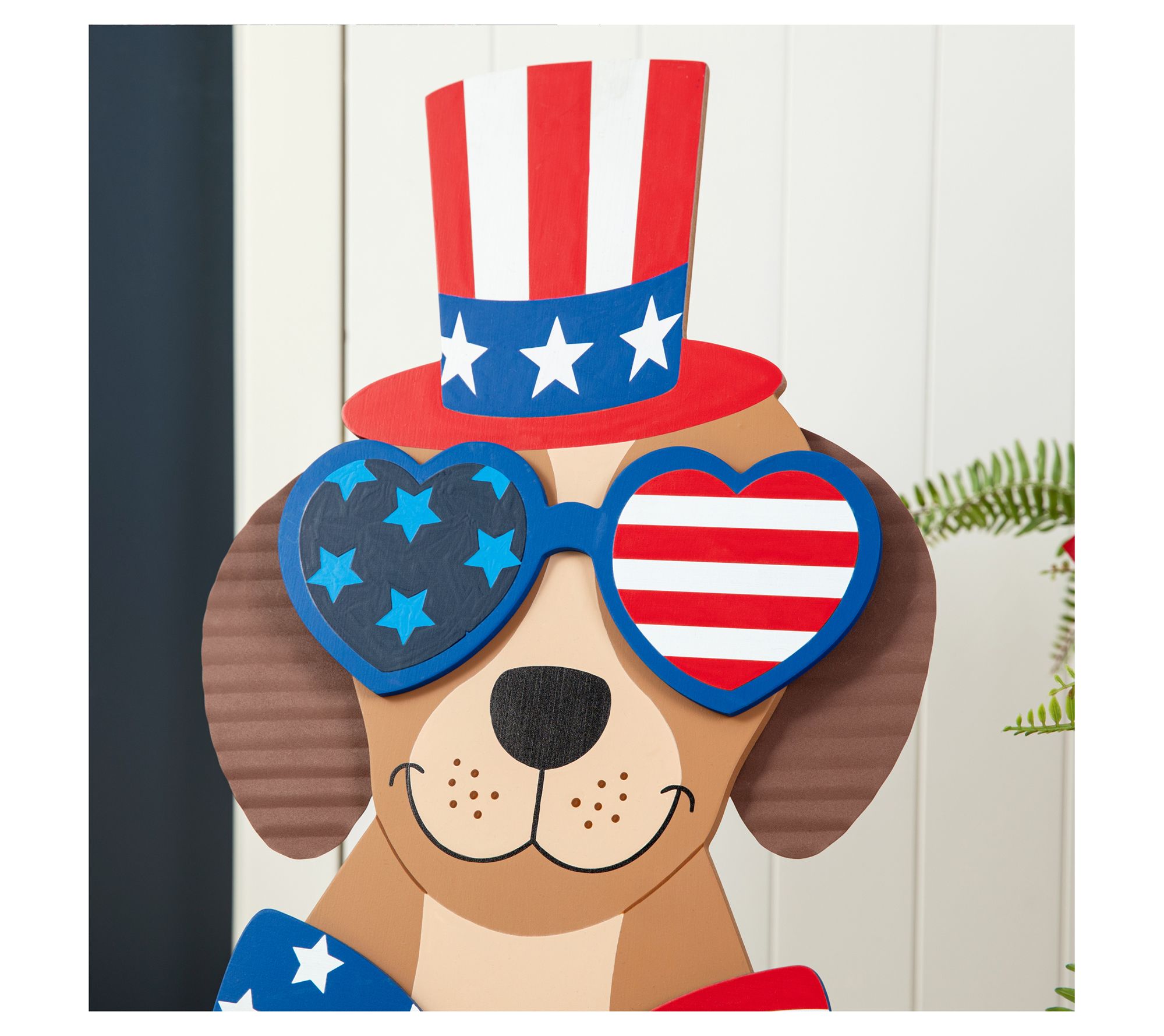 Show off your patriotic spirit with this charming Labrador Retriever porch sign. Featuring a dapper top hat, stylish sunglasses, and a bow tie, it is perfect for adding a touch of joy to any holiday home. From Glitzhome.