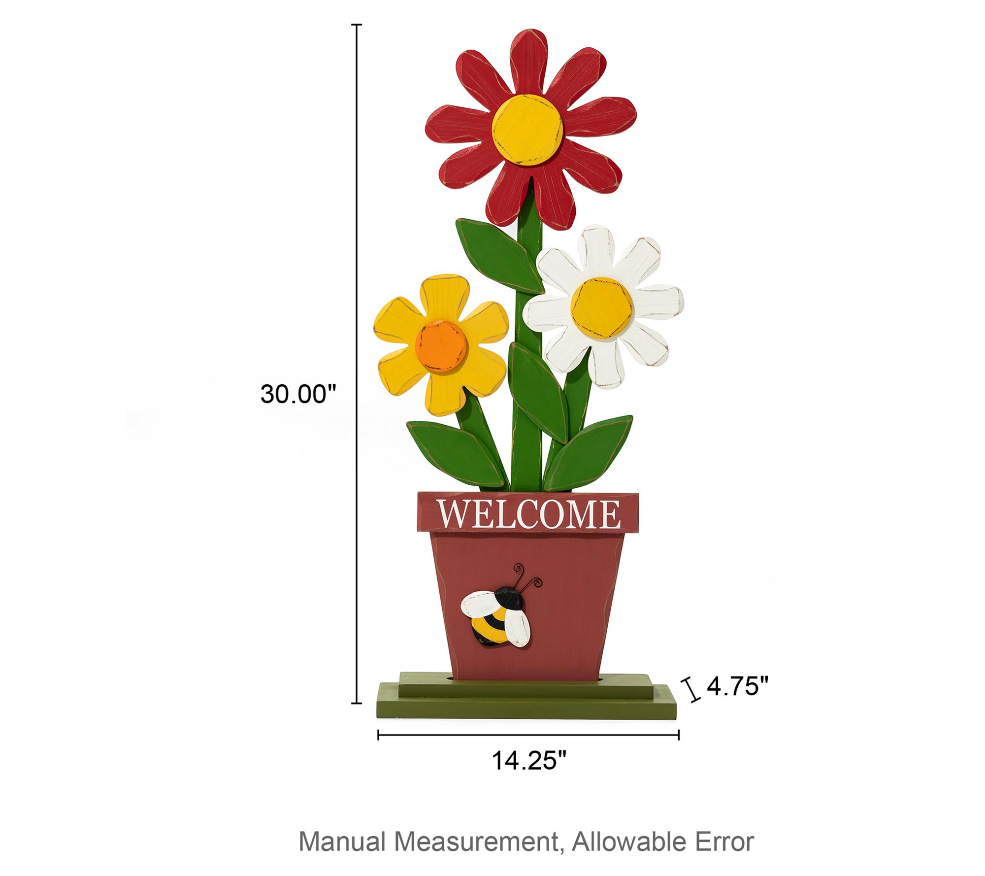 Welcome friends and family with bright blooms when you set out this porch sign, featuring a trio of vibrant flowers in a terra cotta pot accented by a friendly bee. From Glitzhome.