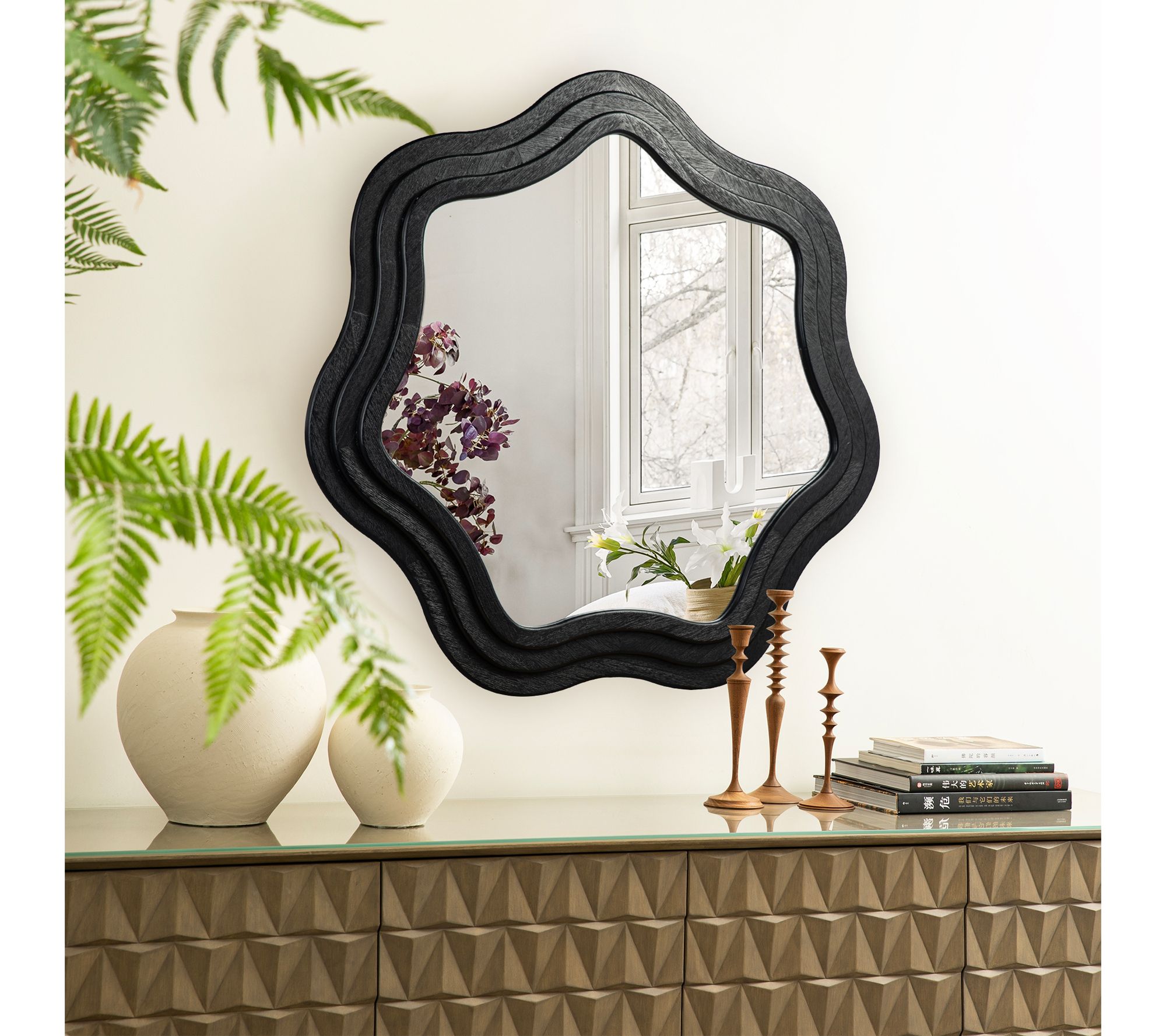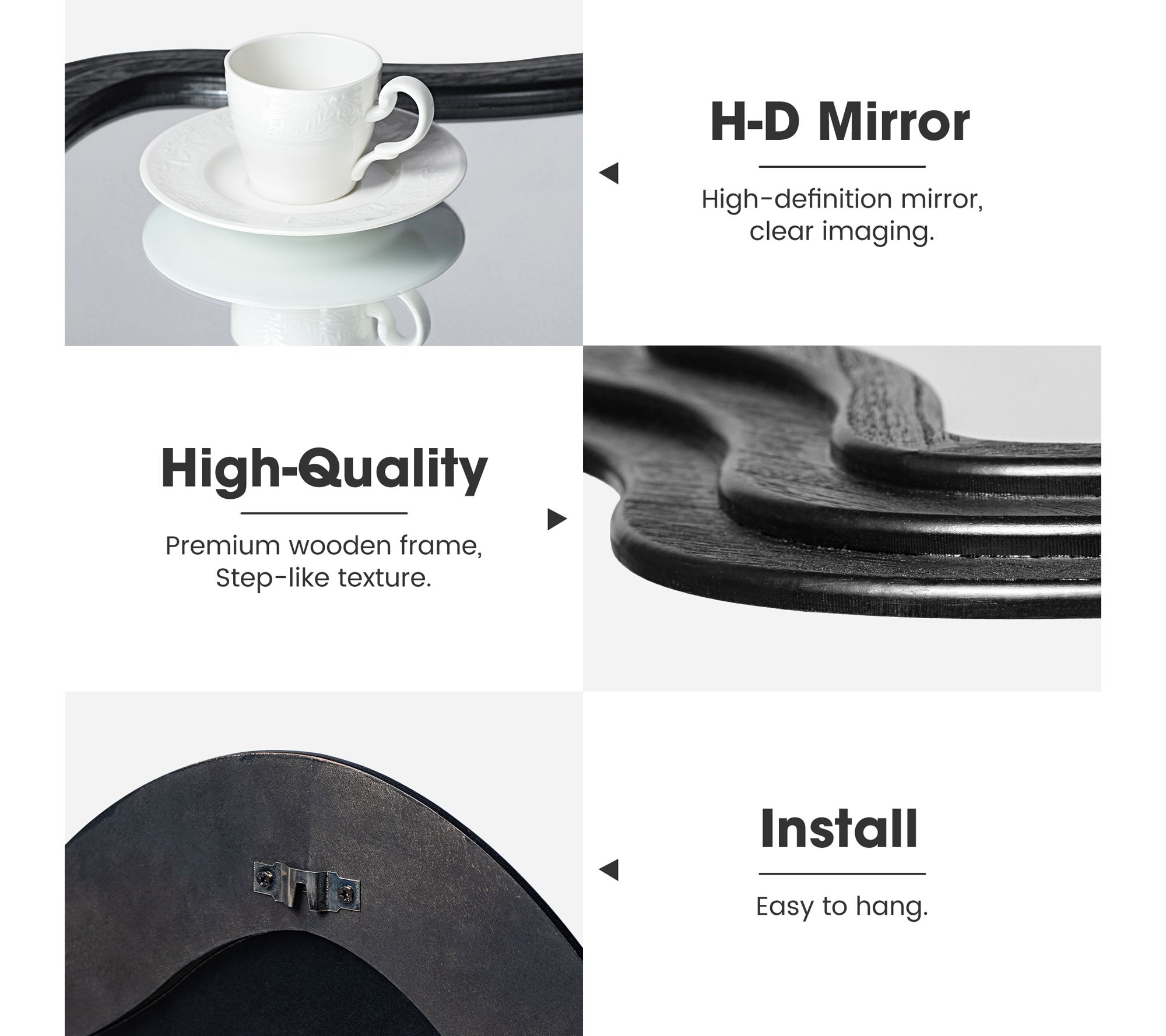 Turn any room into a chic haven with this modern mirror featuring a wavy wood frame that captures the eye. Its high-definition glass offers a stunning reflection, making it ideal for your living space, bedroom, or entryway. Securely hang it with the included hardware to elevate your home's aesthetic effortlessly. From Glitzhome.