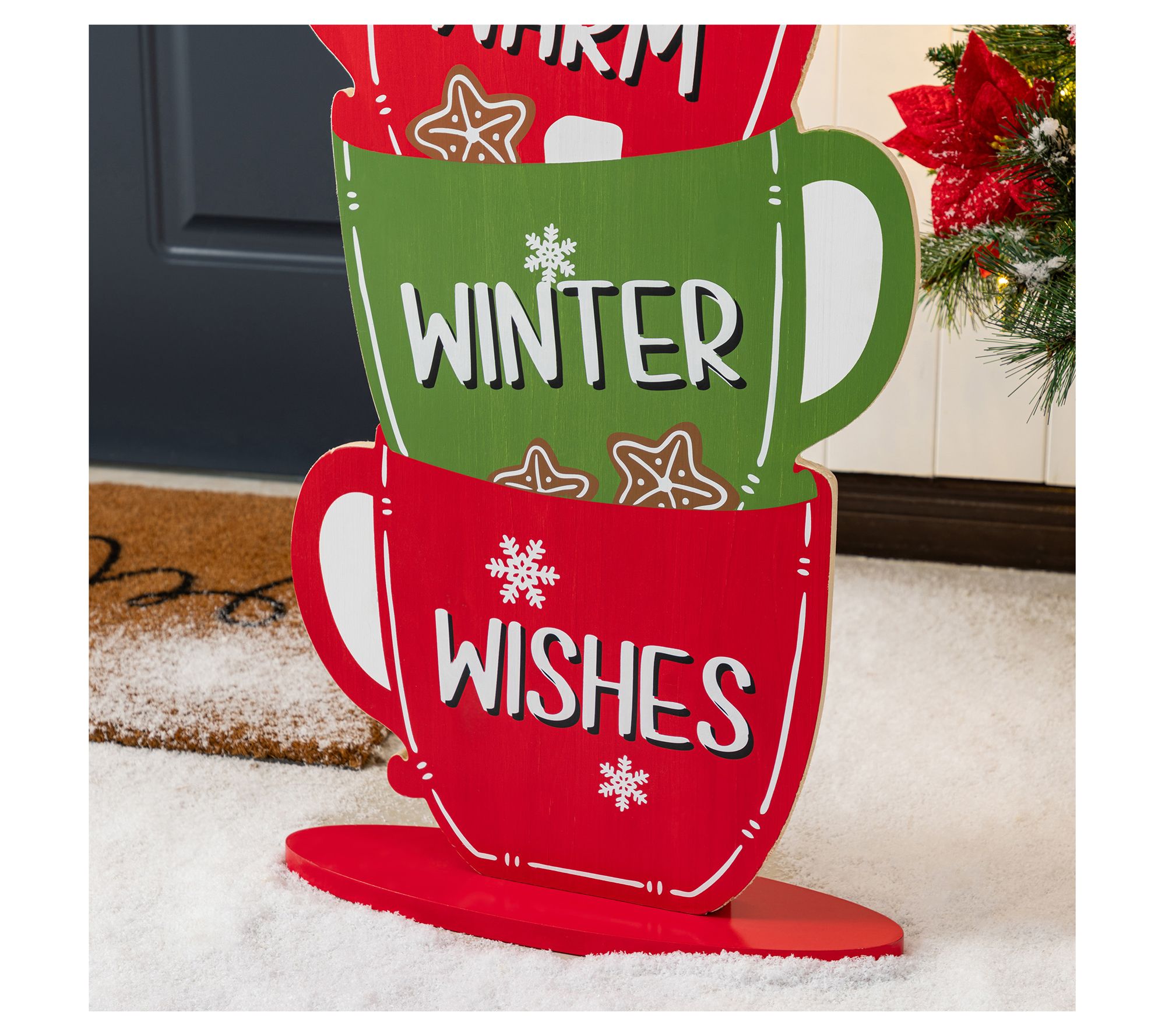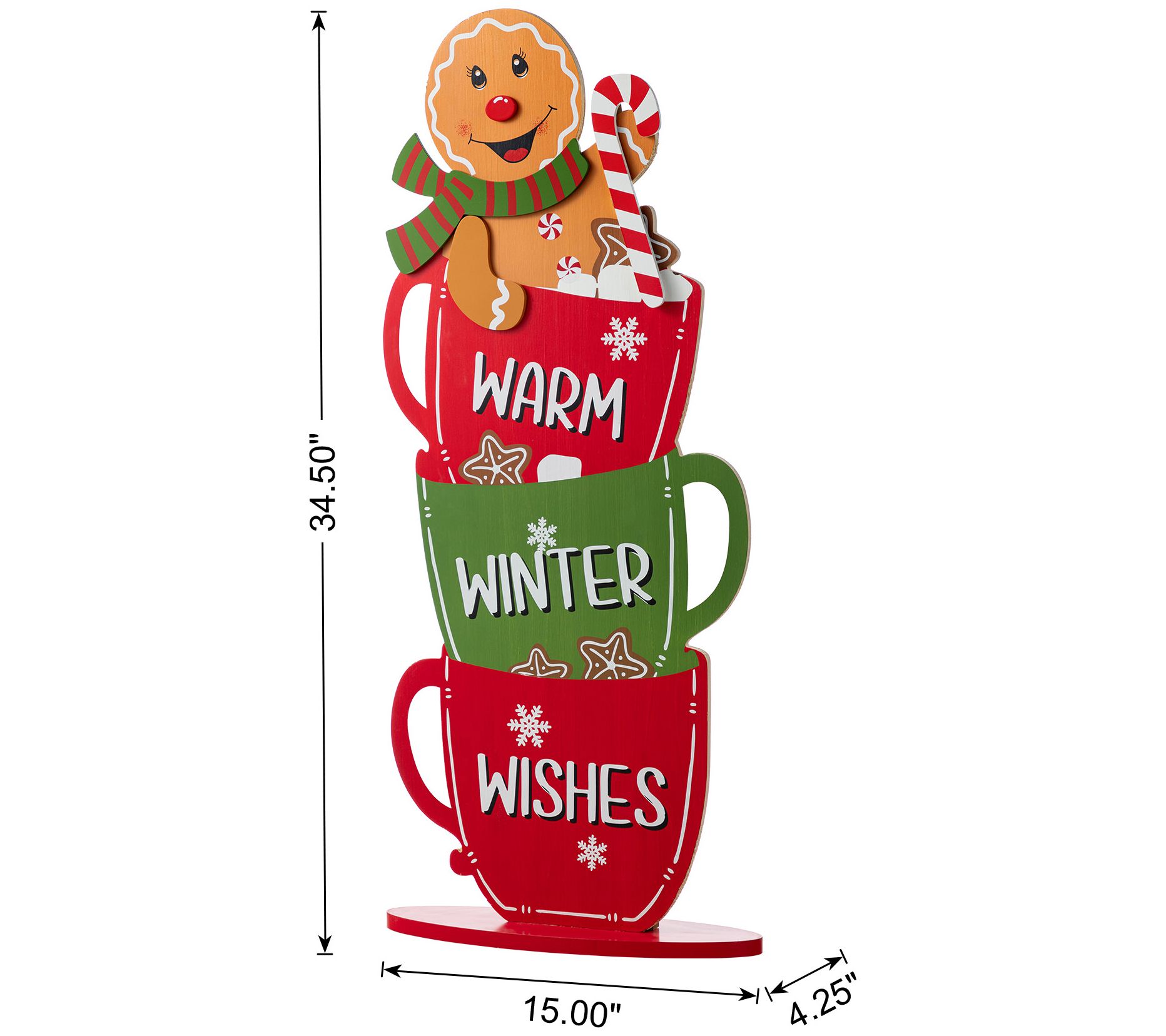 Transform your porch or indoor space into a delightful holiday haven with this charming decoration. Imagine the whimsical touch this cheerful gingerbread man perched atop coffee cups brings to your winter gatherings. Decorated with inviting words like WARM, WINTER, and WISHES, it creates a cozy, festive atmosphere that embodies the season's spirit. This stack of joy is sure to become a conversation starter and add a personal touch to your holiday decor. From Glitzhome.