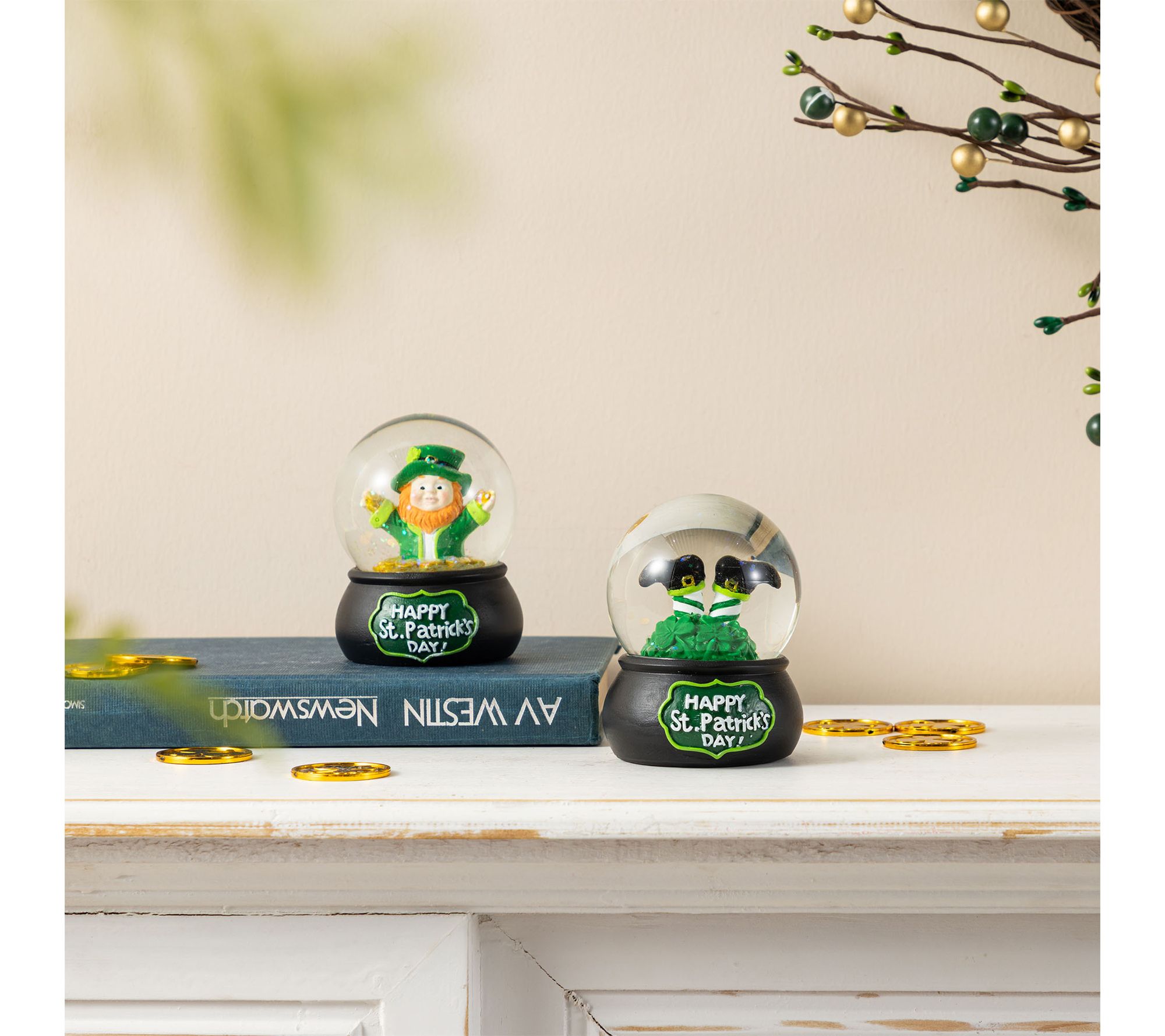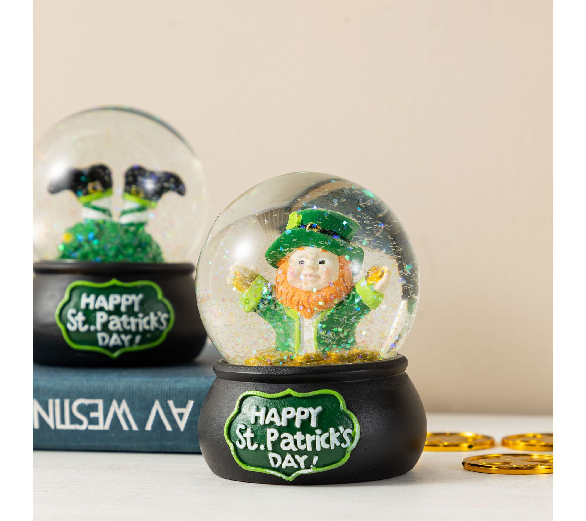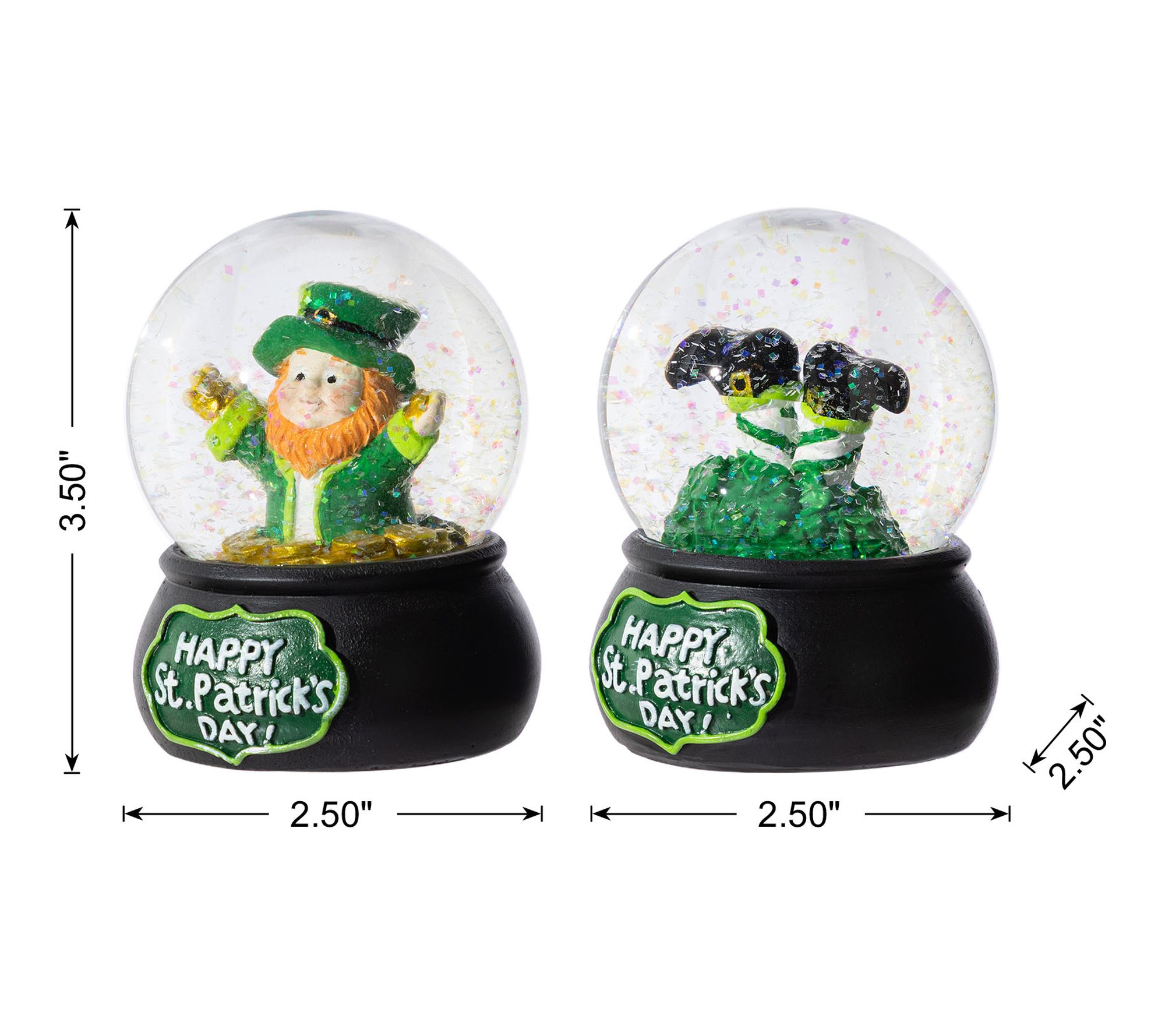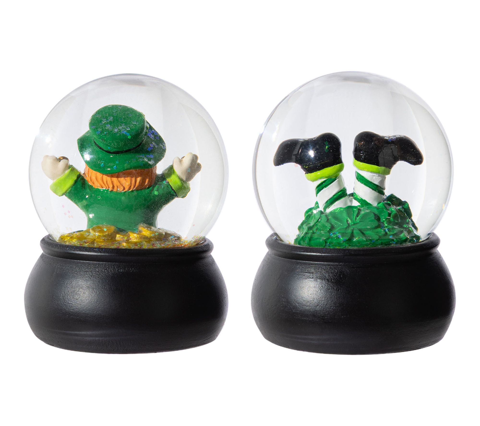 • Includes two water globes, one globe with a leprechaun among gold coins and another with leprechaun legs in shamrocks