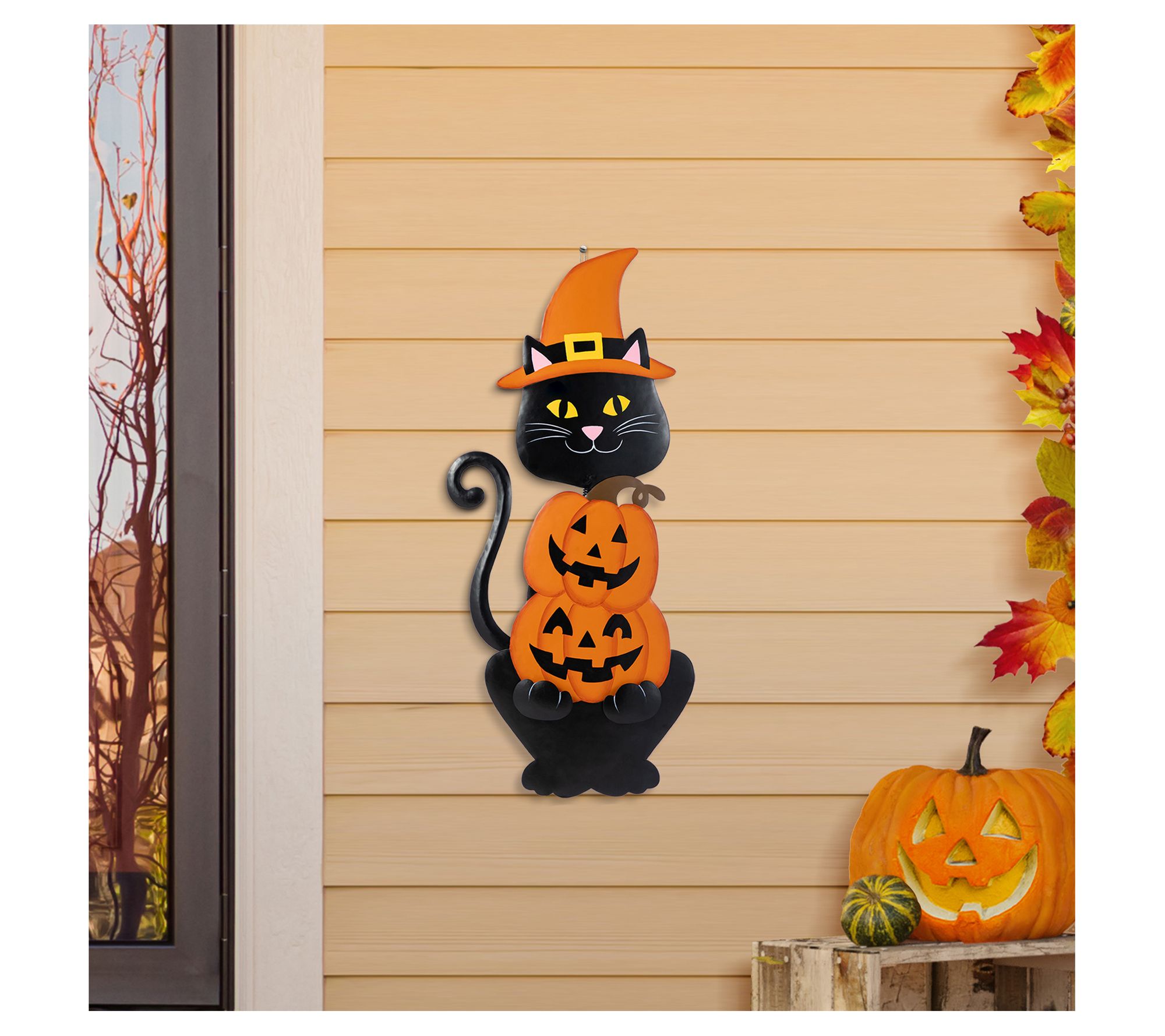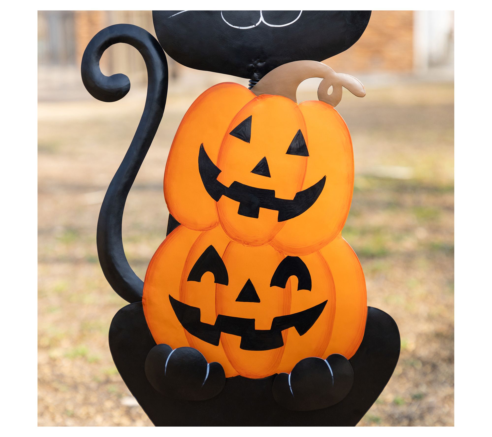 A playful black cat in a whimsical witch's hat guards your garden while perched atop two grinning pumpkins, welcoming friends and trick-or-treaters alike. Its spring-loaded head brings a bit of movement to your outdoor scene and a removable tail and stake give you flexibility to place it wherever festive charm is needed most. Pair it with lanterns or string lights to create a lively Halloween look. From Glitzhome.