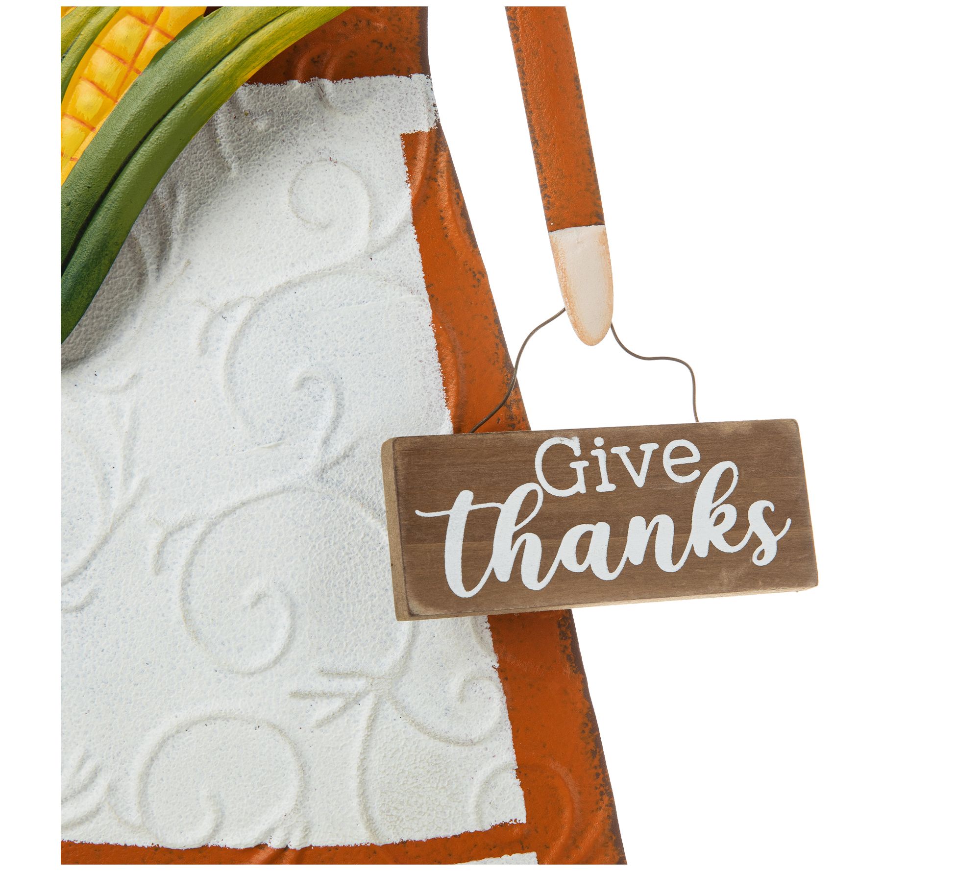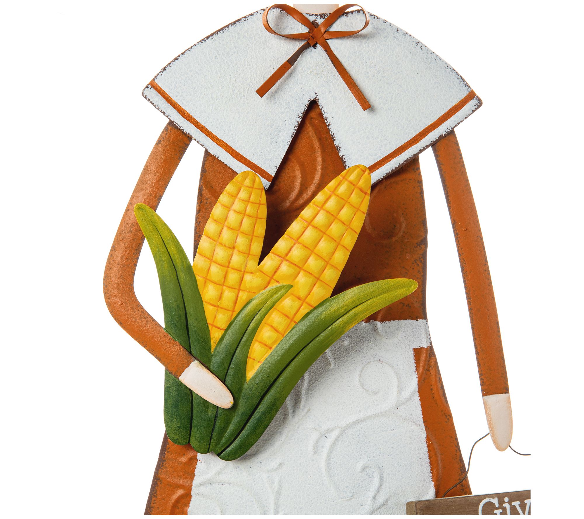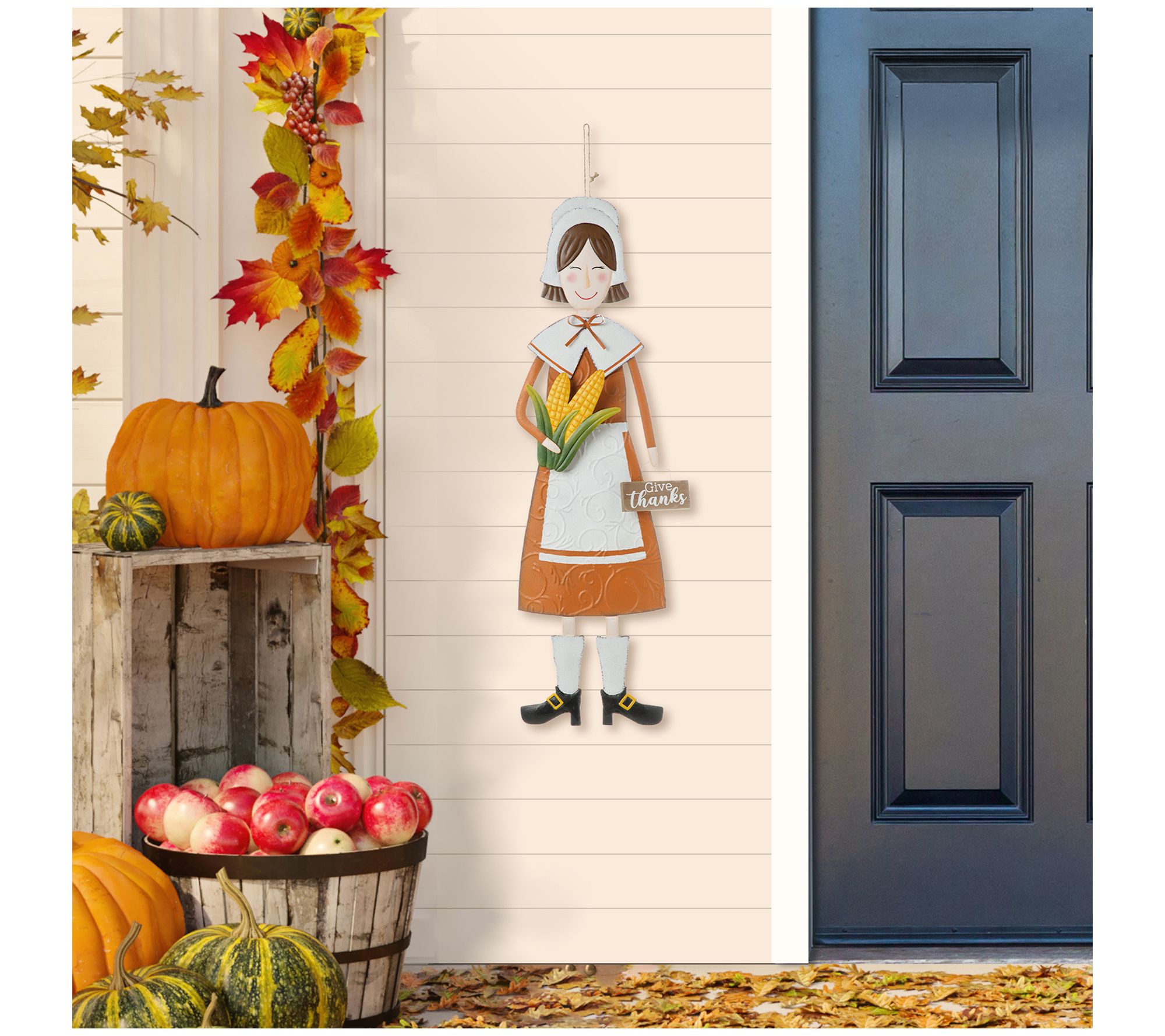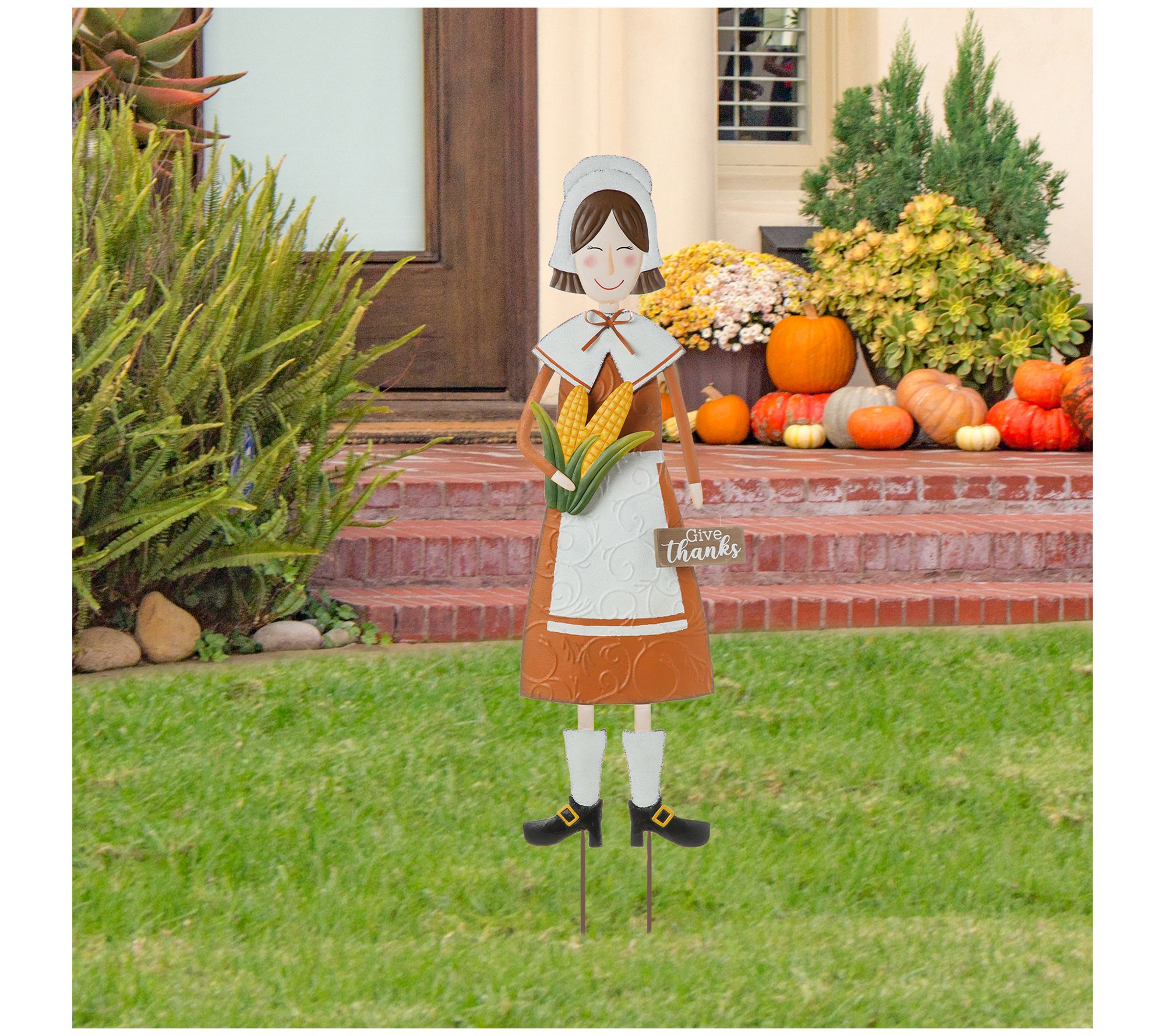 Decorate for Thanksgiving with this lawn stake that can be placed in your garden, on a wall, or by a doorway. It features an adorable pilgrim girl embellished with corn and textured clothes, holding a sign that says "Give thanks." From Glitzhome.