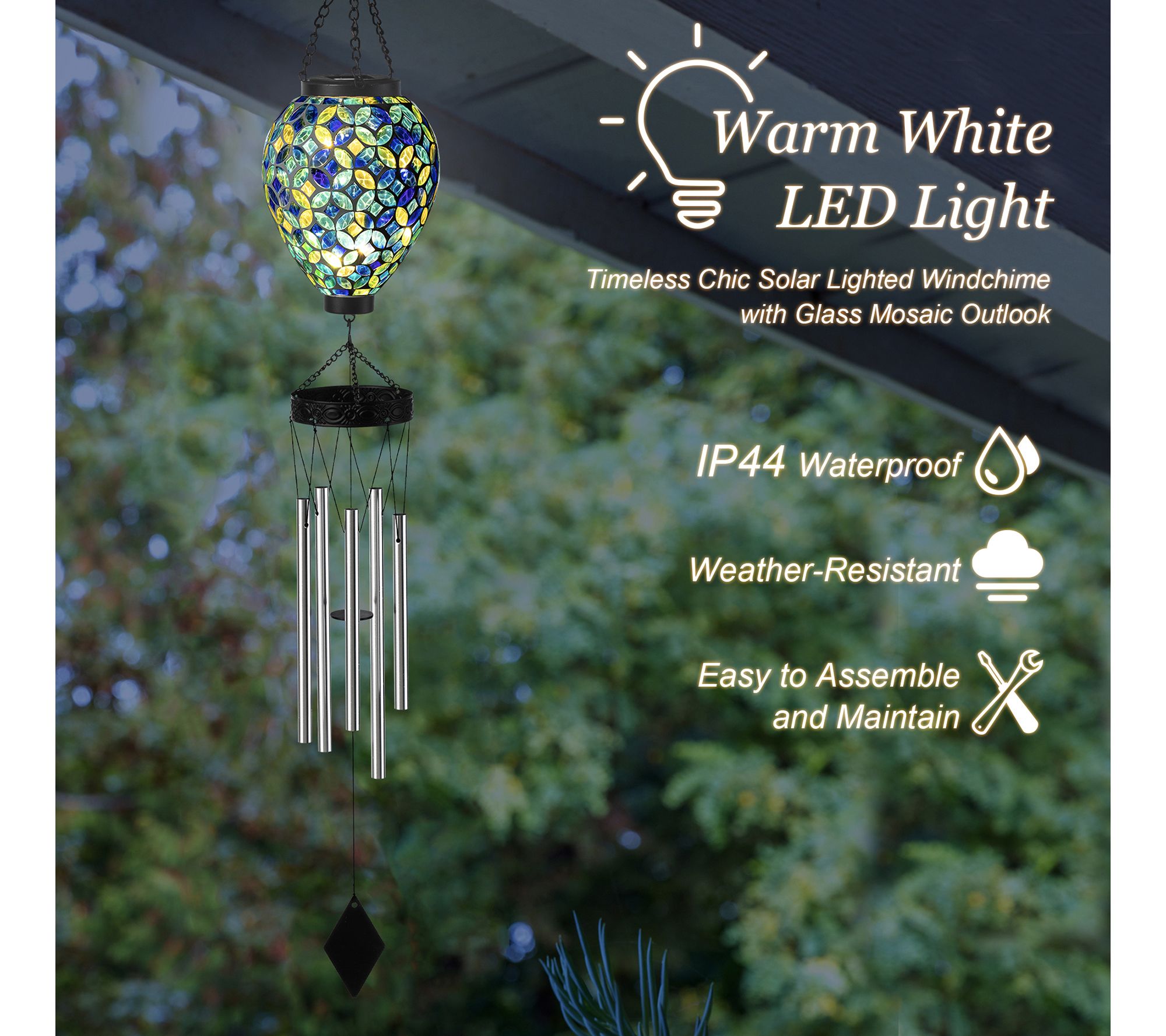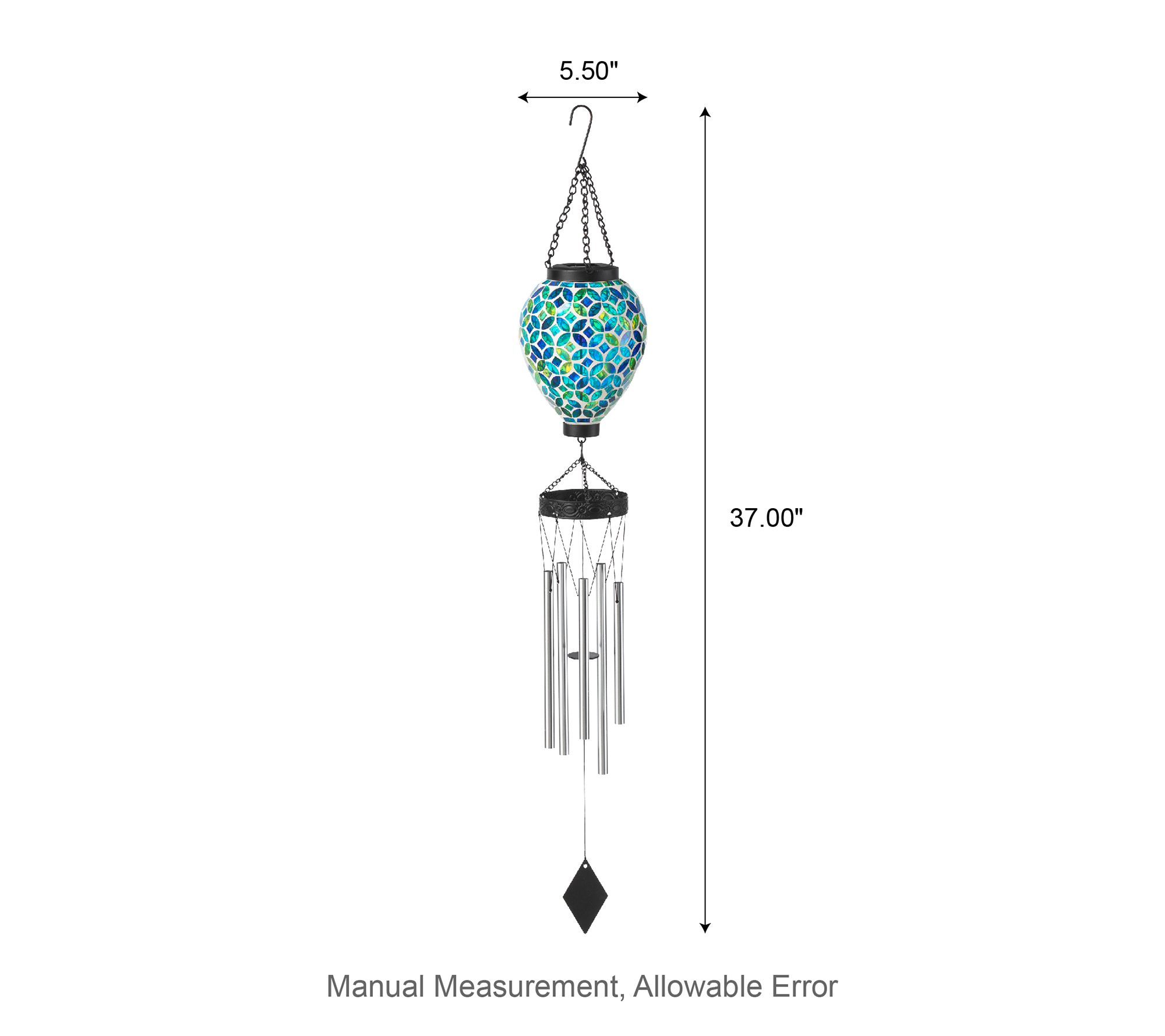 Transform your yard into a magical retreat with this exquisite solar-lighted windchime. As the breeze passes through, it gently sways and emits a serene melody while showcasing a captivating mosaic glass that shimmers beautifully both day and night. Perfect for adding charm and relaxation to any space, this elegant piece is ideal for hanging by a window or in your garden. From Glitzhome.