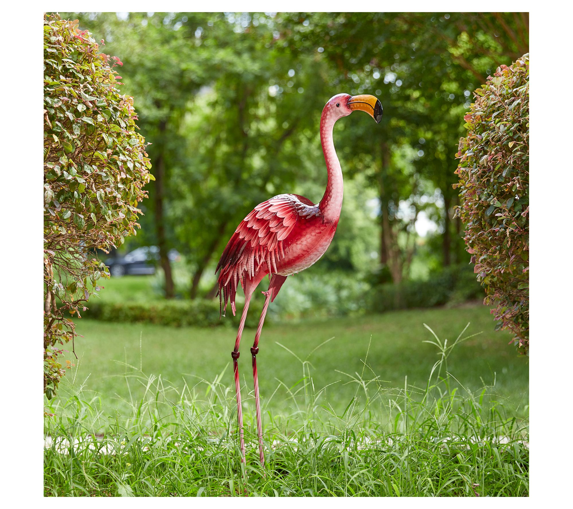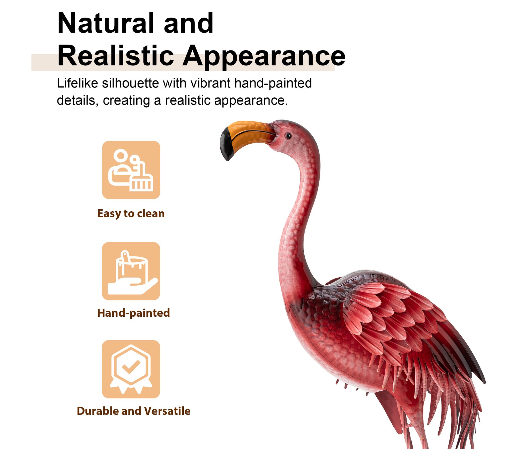 Enhance your garden with the charming presence of this lifelike pink flamingo statue. Made from durable powder-coated metal, it brings vibrant colors and exquisite textures to your outdoor space. Picture this whimsical piece standing gracefully amongst your flowers, adding a playful yet elegant touch. From Glitzhome.