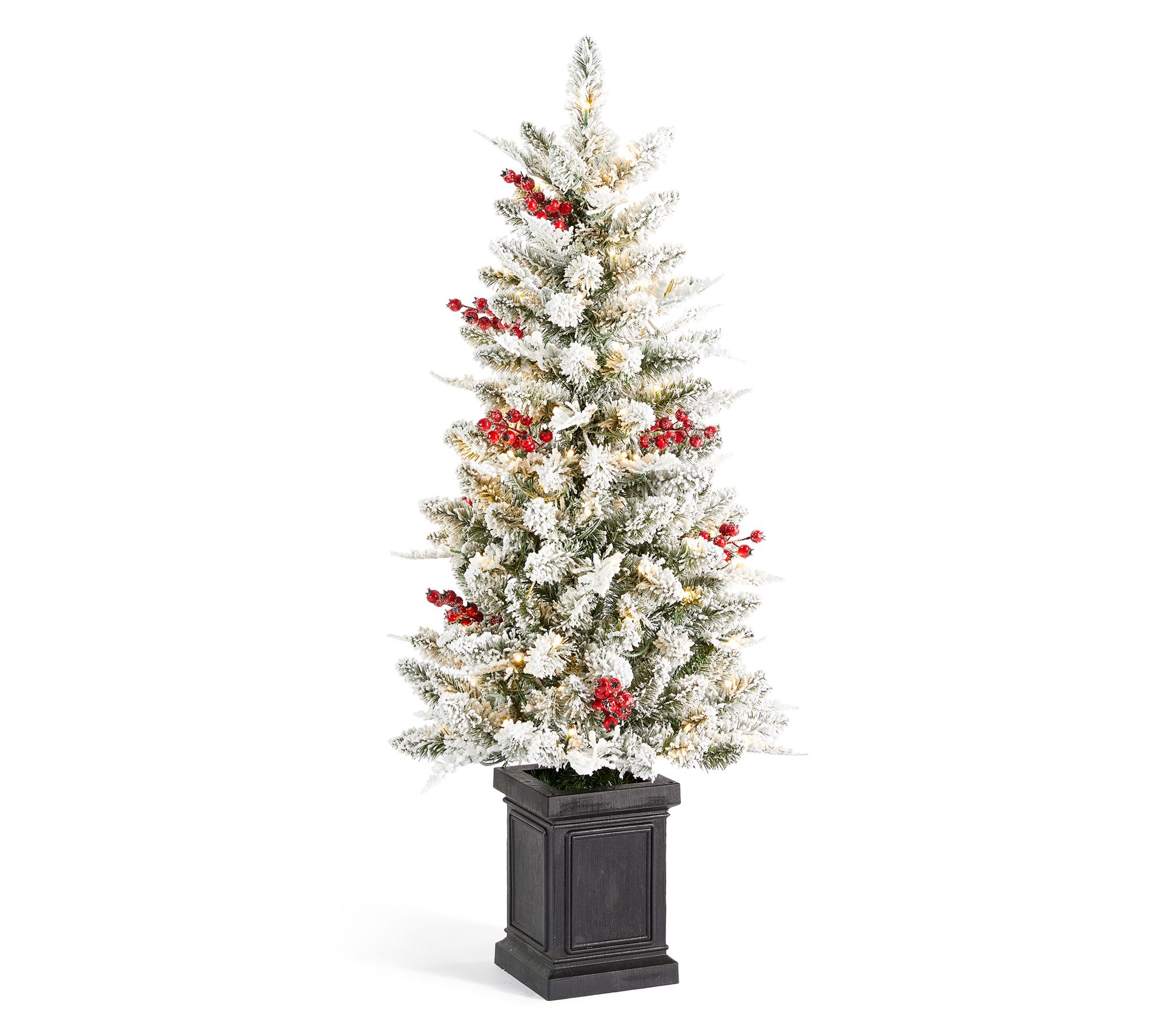 Imagine coming home to a winter wonderland. This four-foot pre-lit Christmas porch tree has a flocked design, dotted with vibrant red berries, that brings a touch of festive charm, while the warm white/multi-color LED lights illuminate your space. Perfectly potted, this tree adds a cozy holiday ambiance to any indoor or covered porch area. Embrace the ease of the foot pedal to control the lights and set the scene for a cozy evening of holiday magic. From Glitzhome.