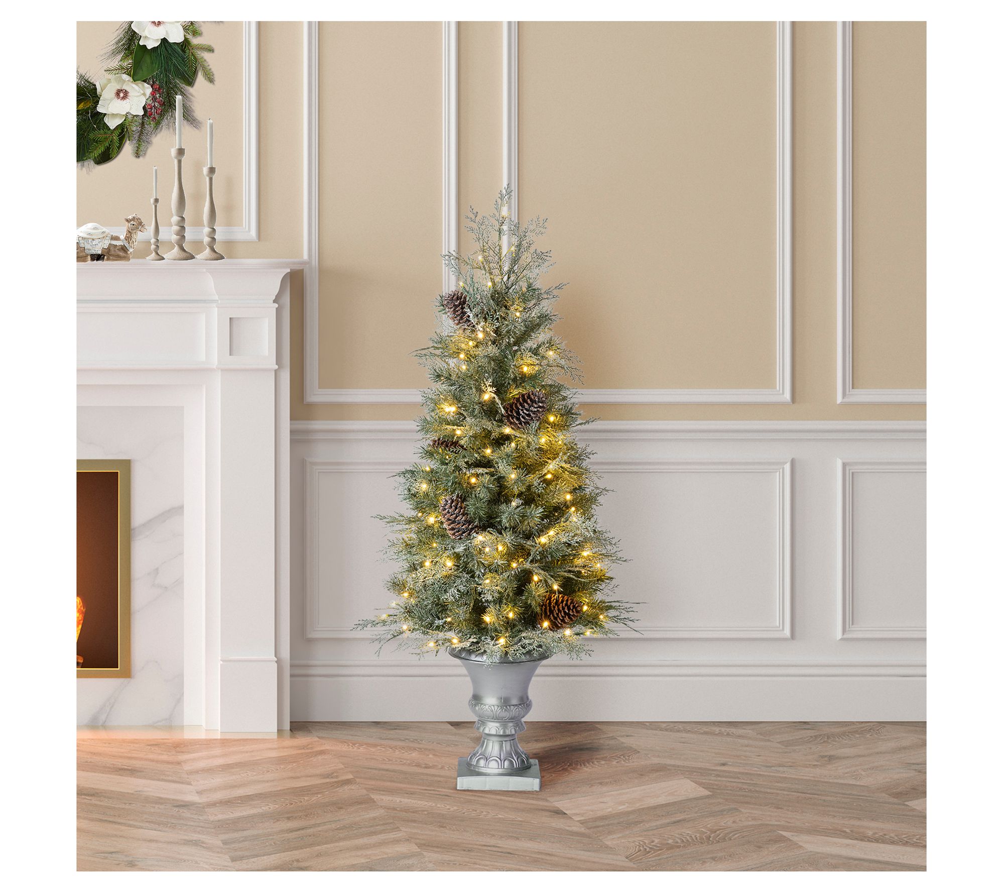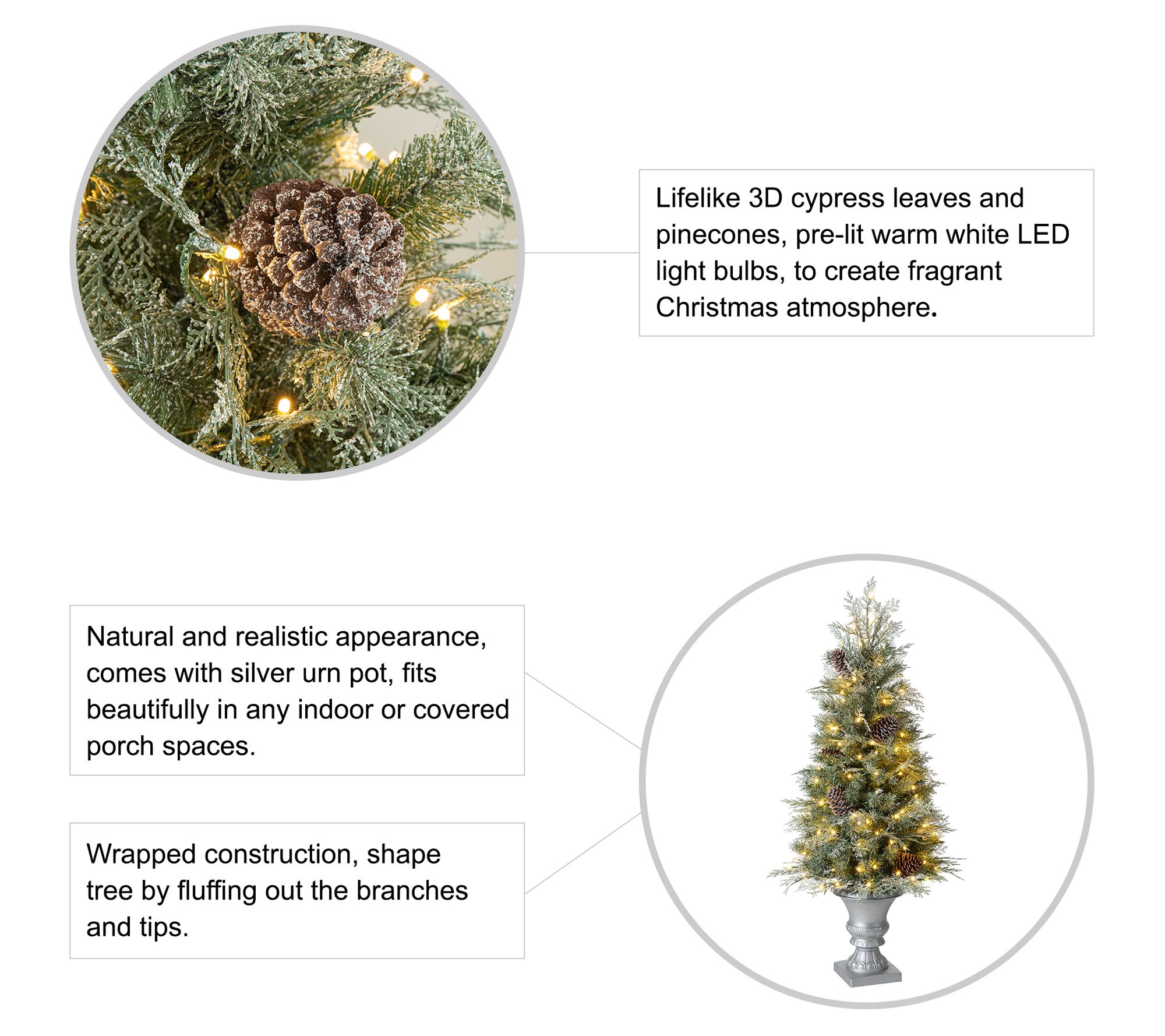• Includes prelit artificial tree with decorative urn base