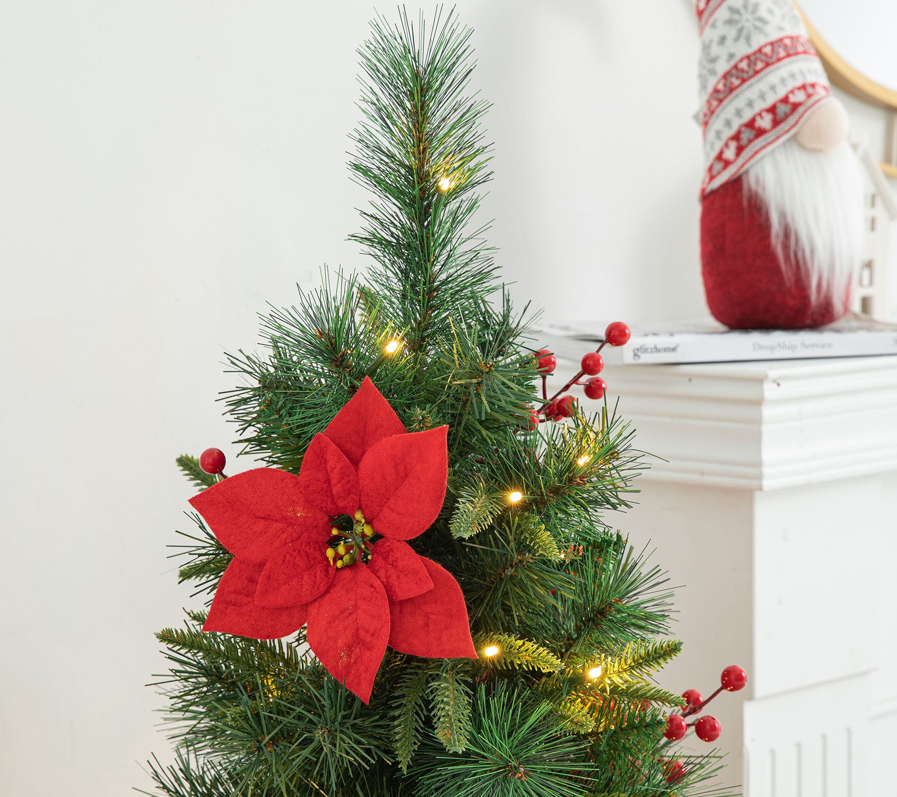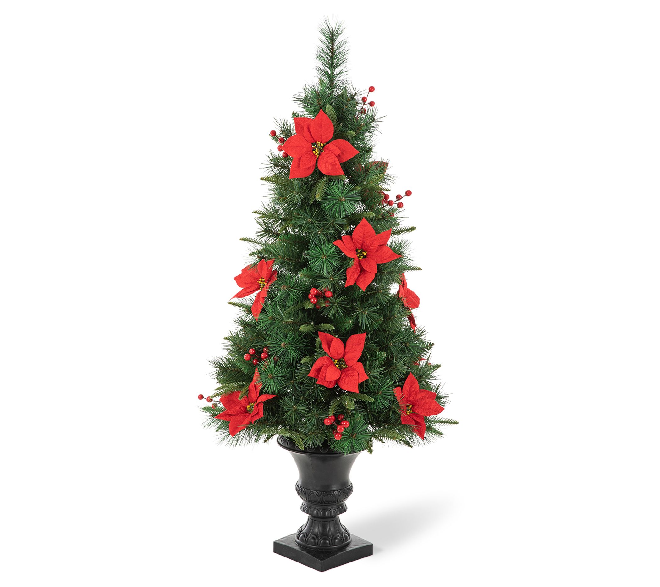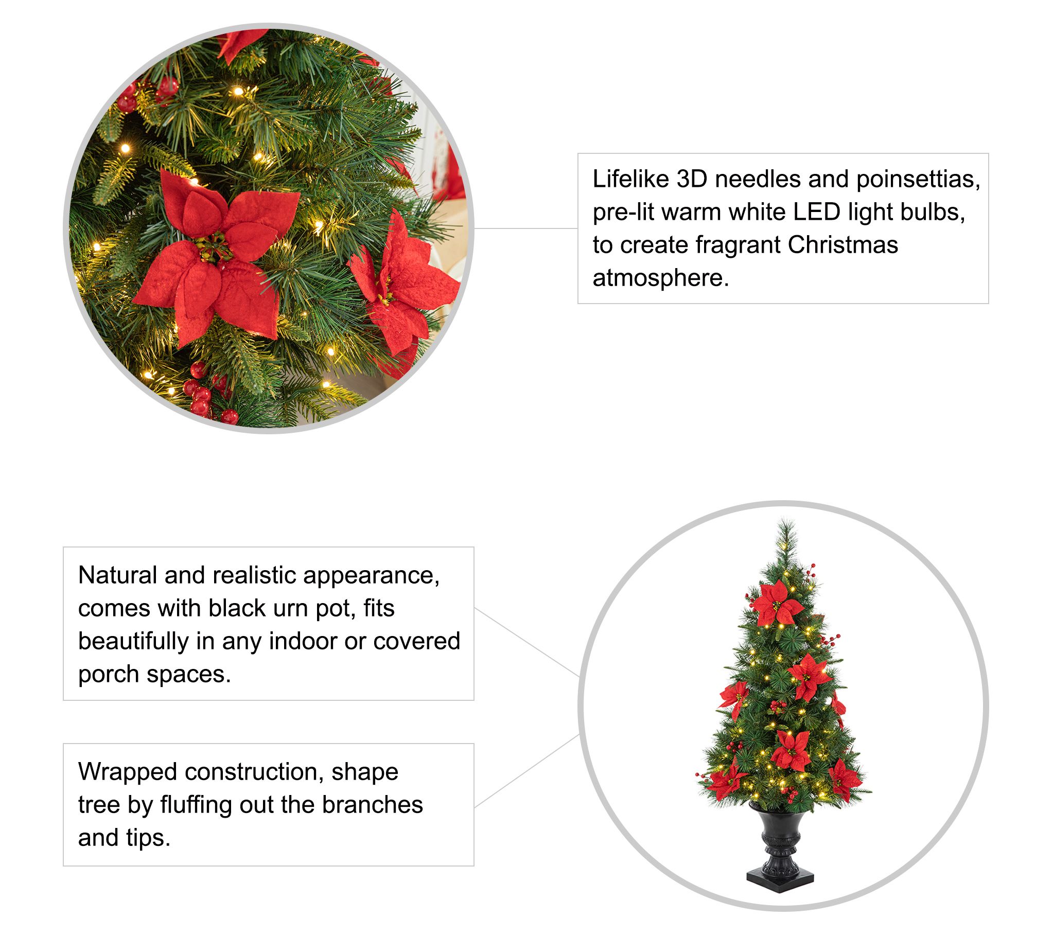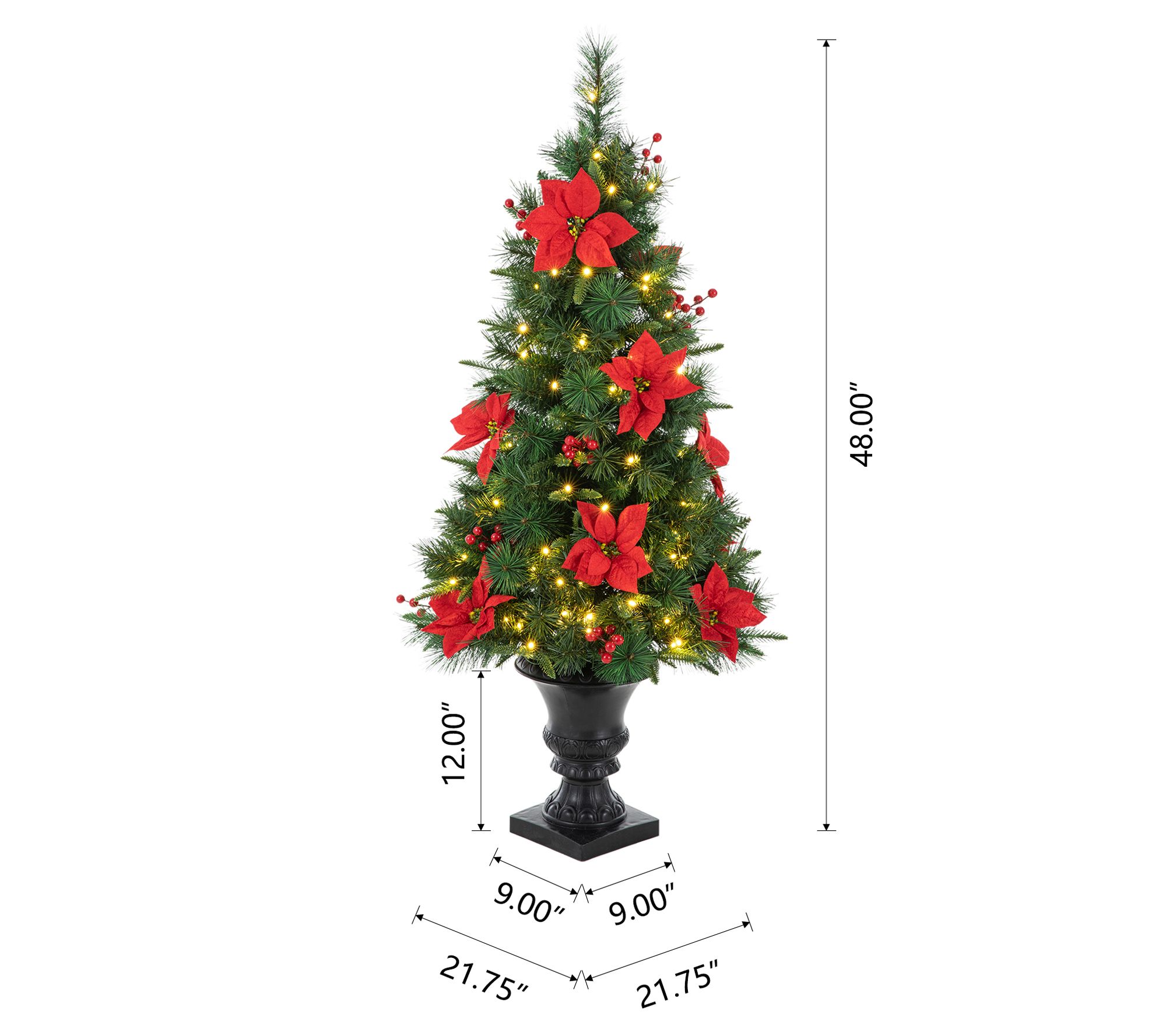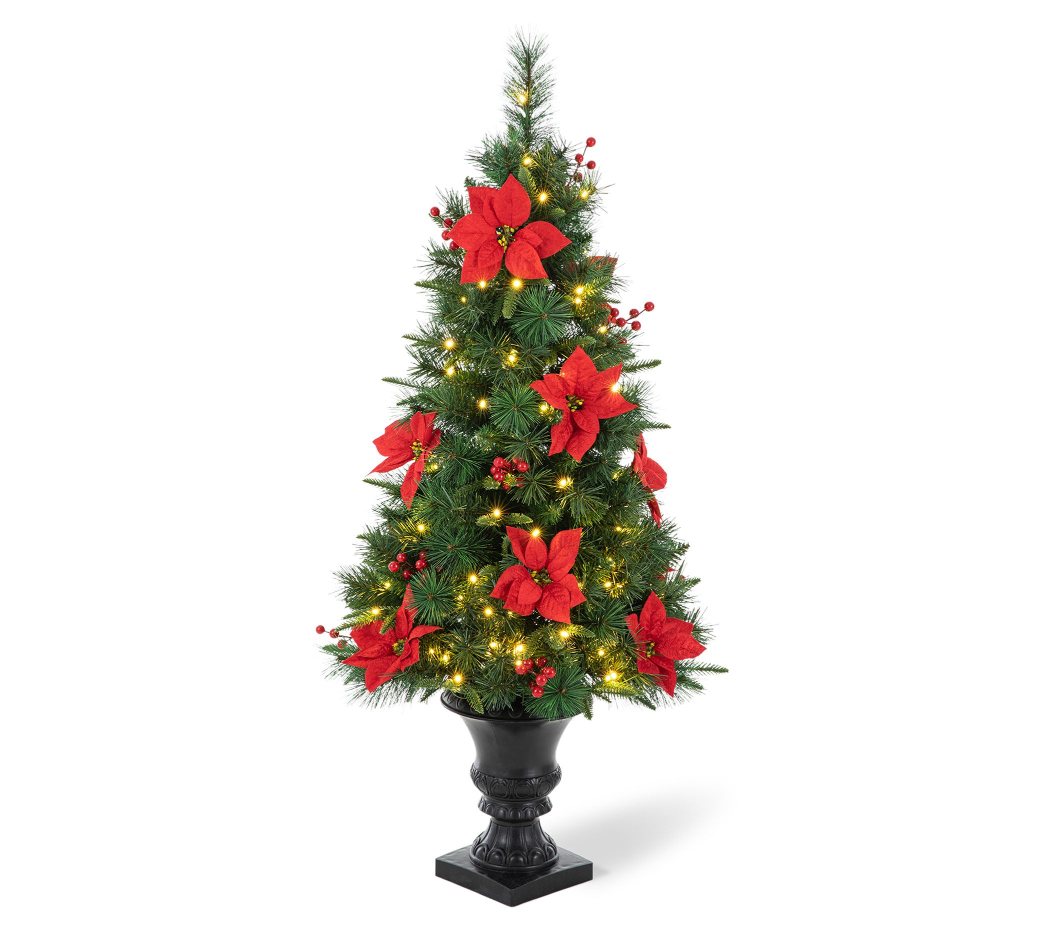 Offering a classic urn filled with realistic pine branches, vibrant red poinsettias, fresh-looking berries, and enchanting warm white LED lights, this artificial tree adds a touch of joyful elegance and color to any entryway. From Glitzhome.