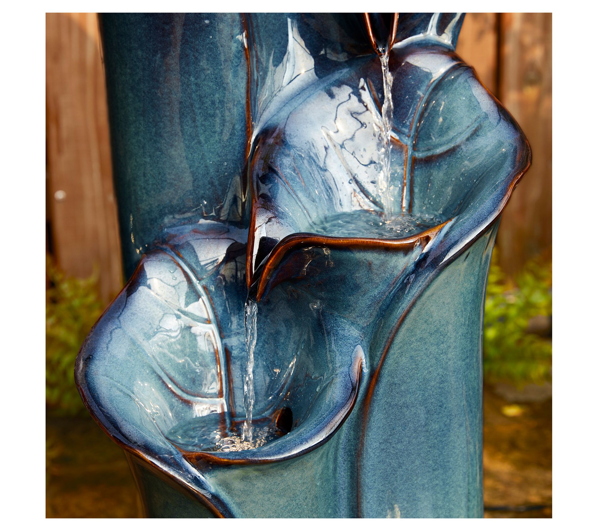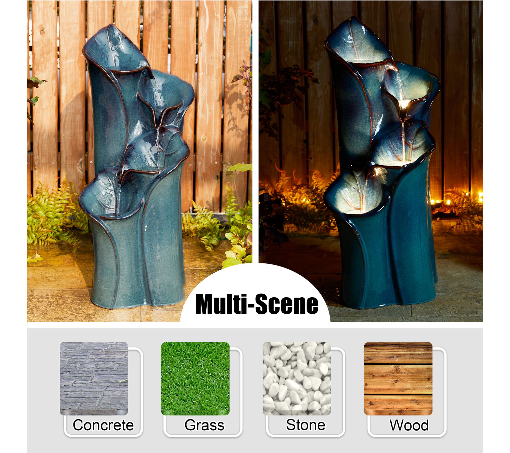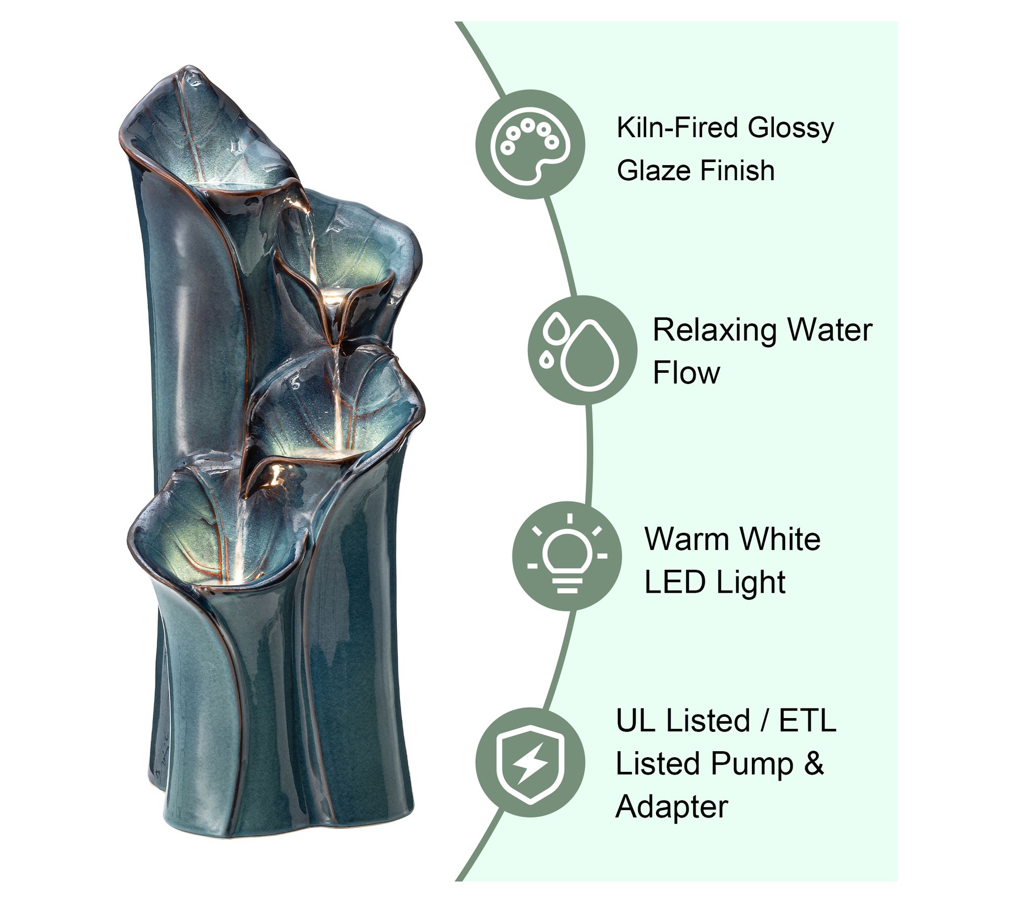 Elevate your outdoor space with a touch of artistic elegance using our vase-inspired ceramic fountain. Featuring a charming kiln-fired glossy glaze and delicate lotus leaf texture, the cascading water creates a soothing sound that relaxes and adds visual interest. LED-lit basins offer a warm glow, transforming any garden, patio, deck, porch, or home space into a tranquil sanctuary. Simply add water, plug in, and enjoy! From Glitzhome.