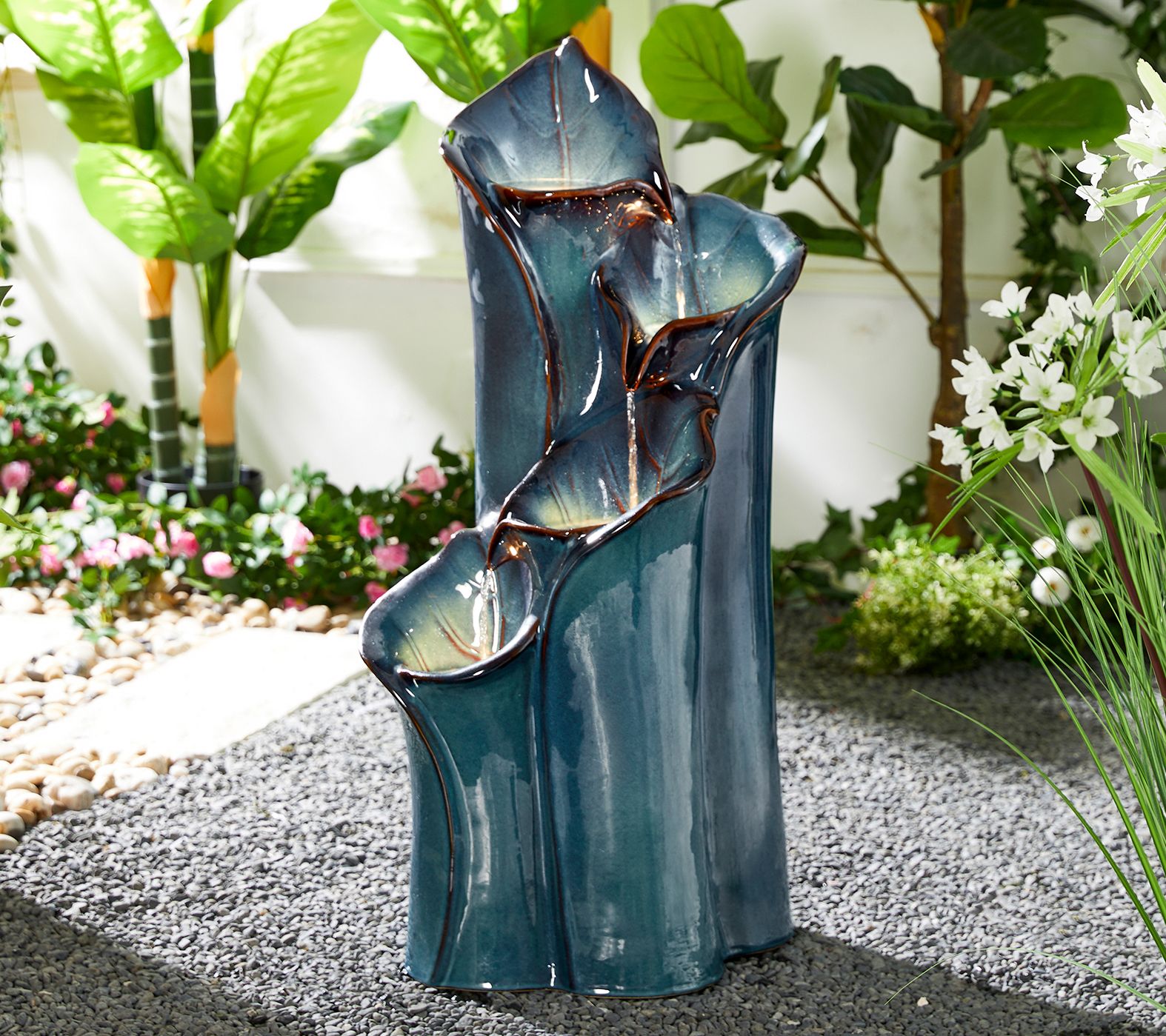 Glitzhome 4-Tiered Lotus Leaf LED Lit Ceramic Outdoor Fountain