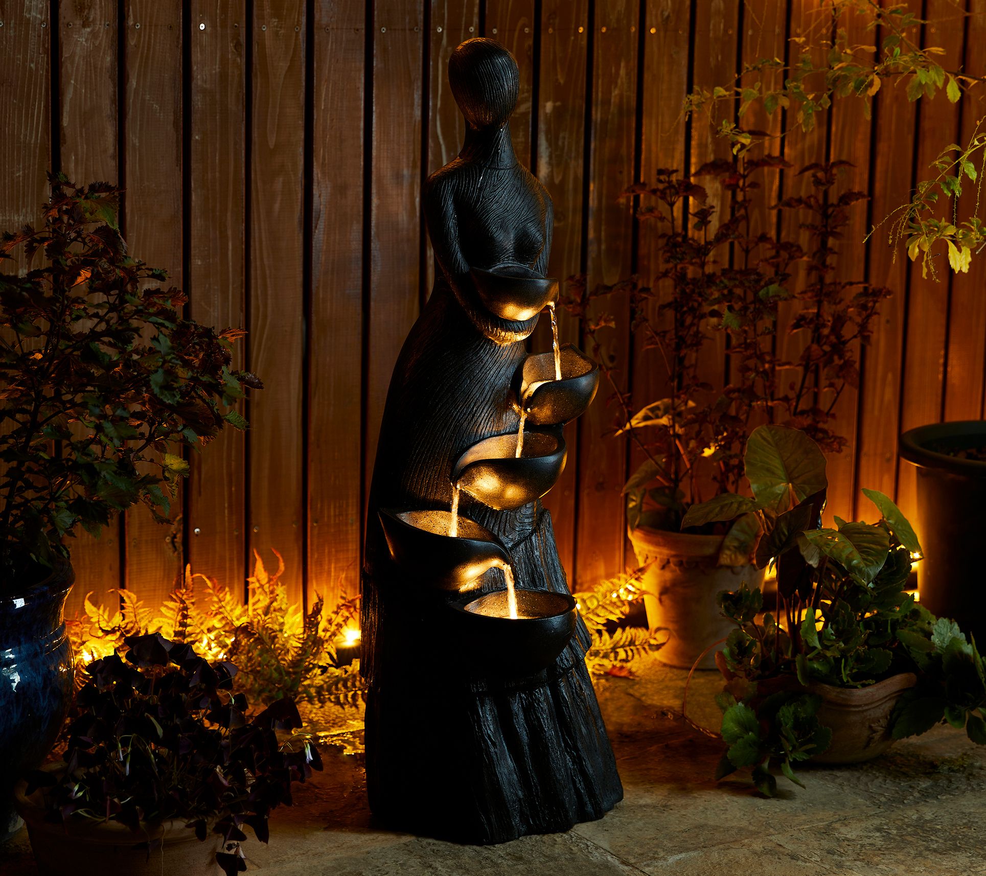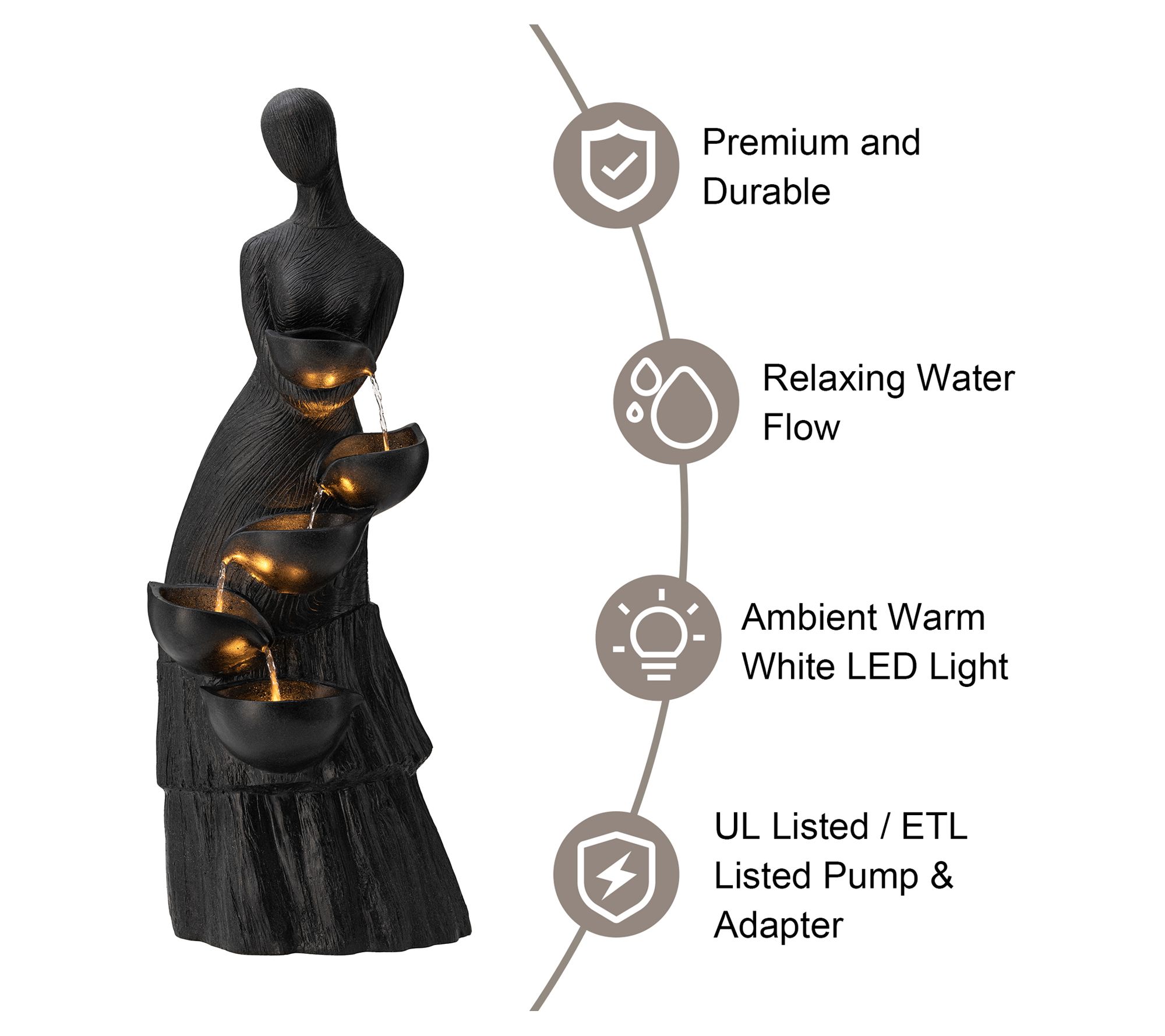 Create a calming oasis and add a touch of artistry to your space with this Glitzhome 40" five-tiered LED abstract sculpture outdoor fountain. Featuring a modern abstract woman design with delicate texture and warm white LED lights, this fountain creates a relaxing atmosphere with the soothing sound of cascading water, ideal for any garden, patio, deck, porch, or indoor space. From Glitzhome.
