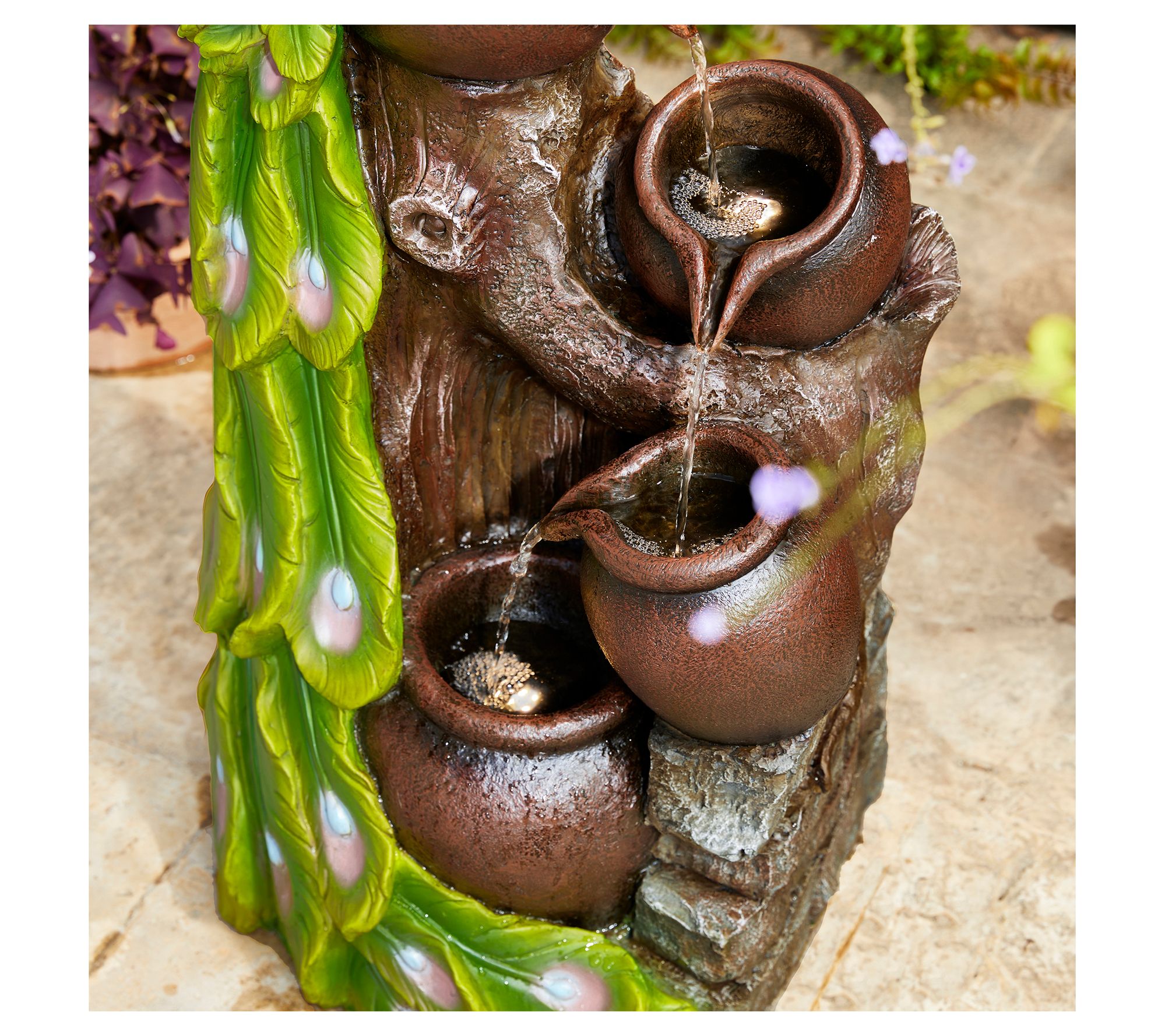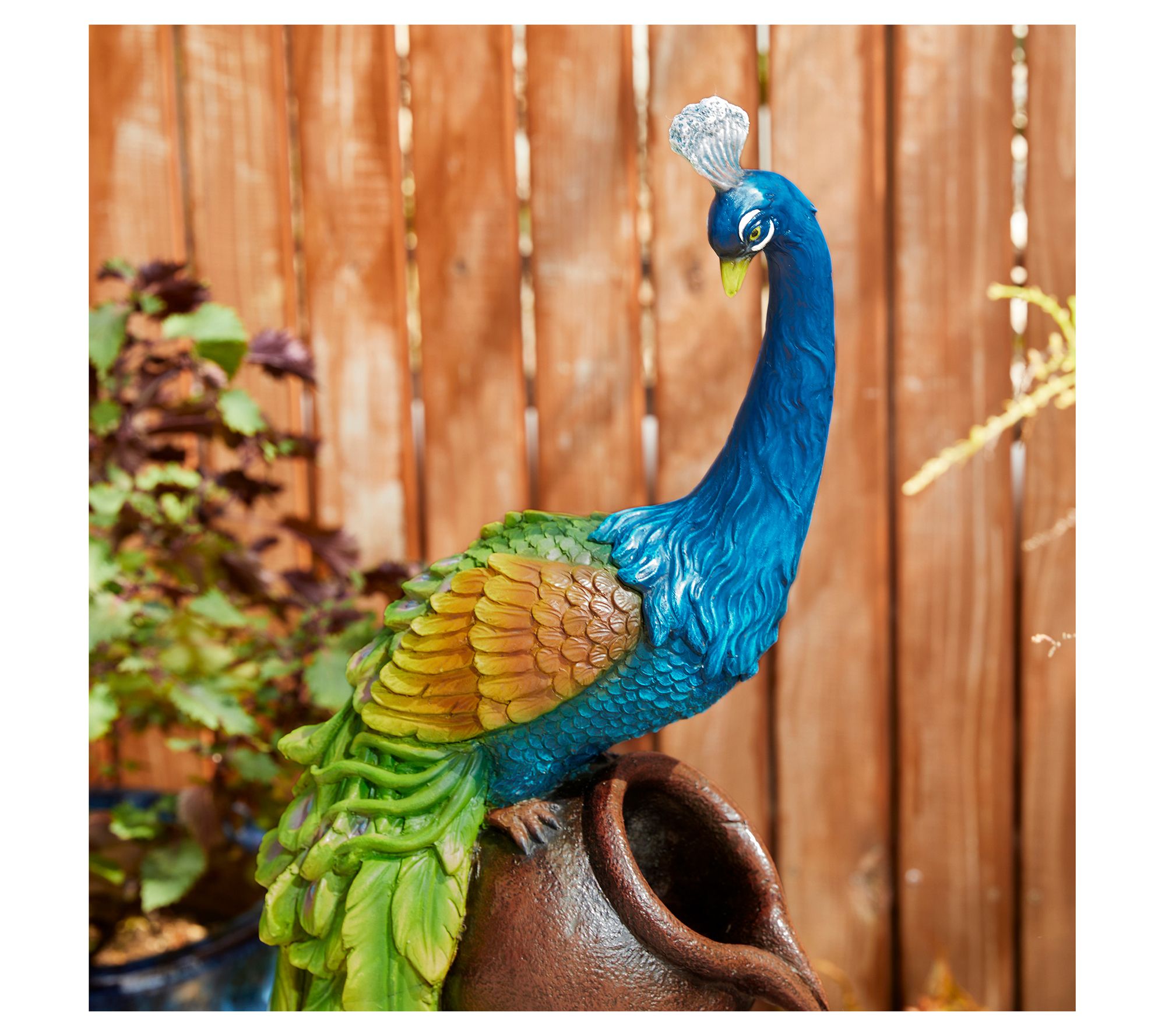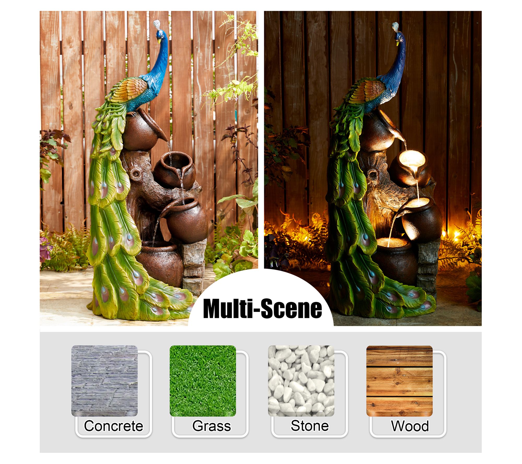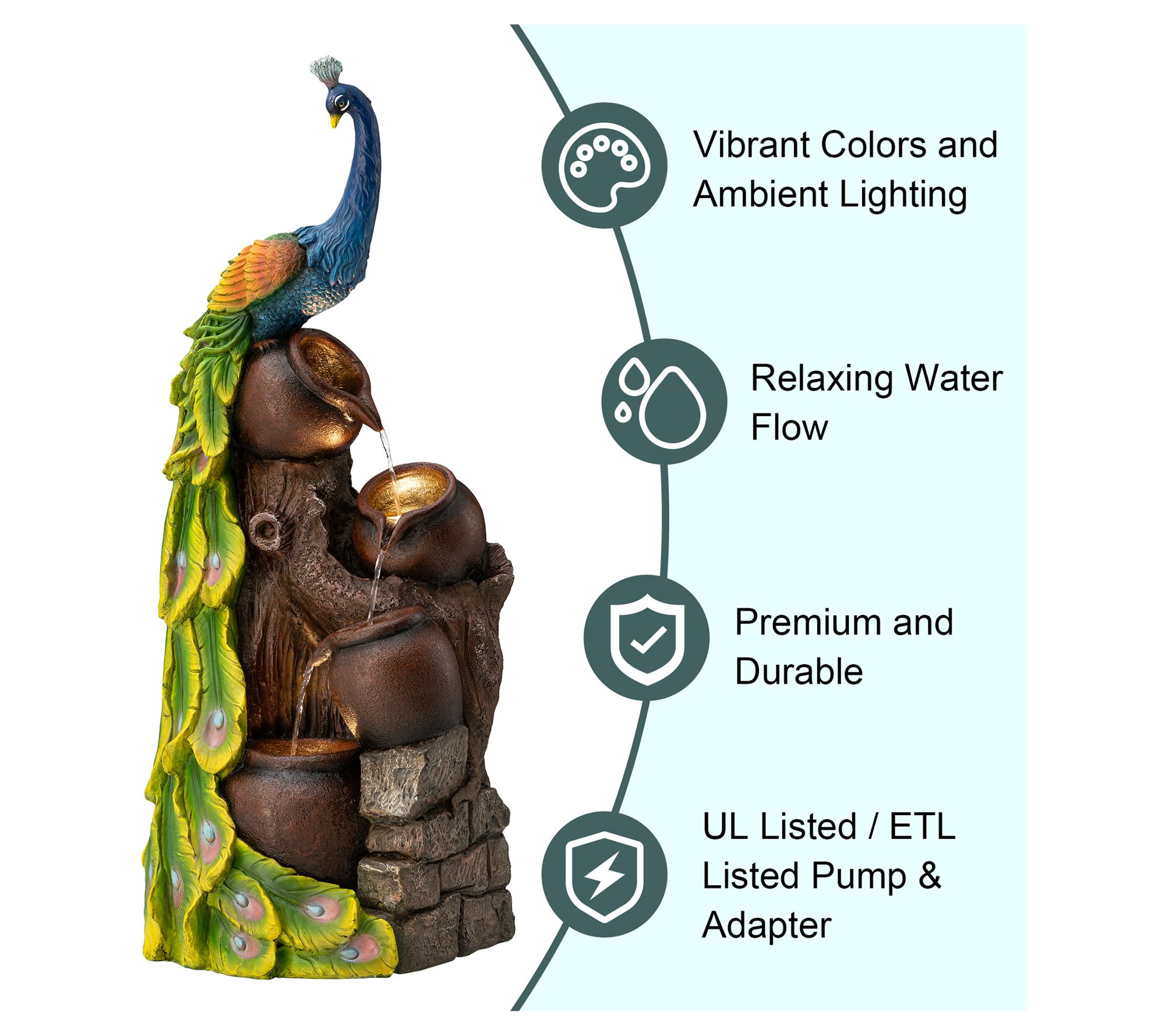 Create a tranquil ambiance in your garden with this 40" LED-lit, four-tier peacock fountain. The elegant peacock and cascading jars add a touch of natural beauty, while the soothing water sound helps you relax. With warm white LED lights, this fountain glows beautifully in the evening. From Glitzhome.