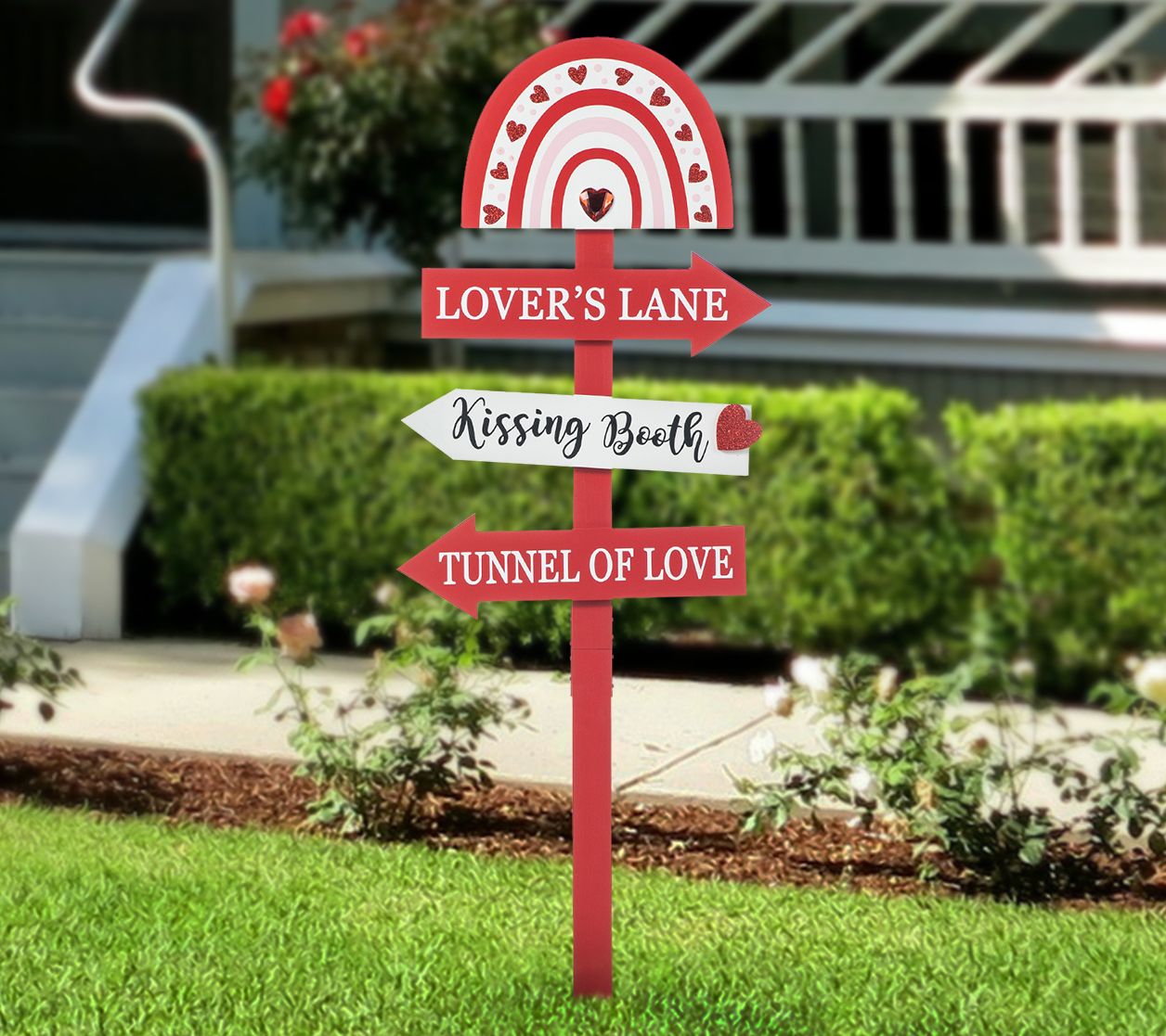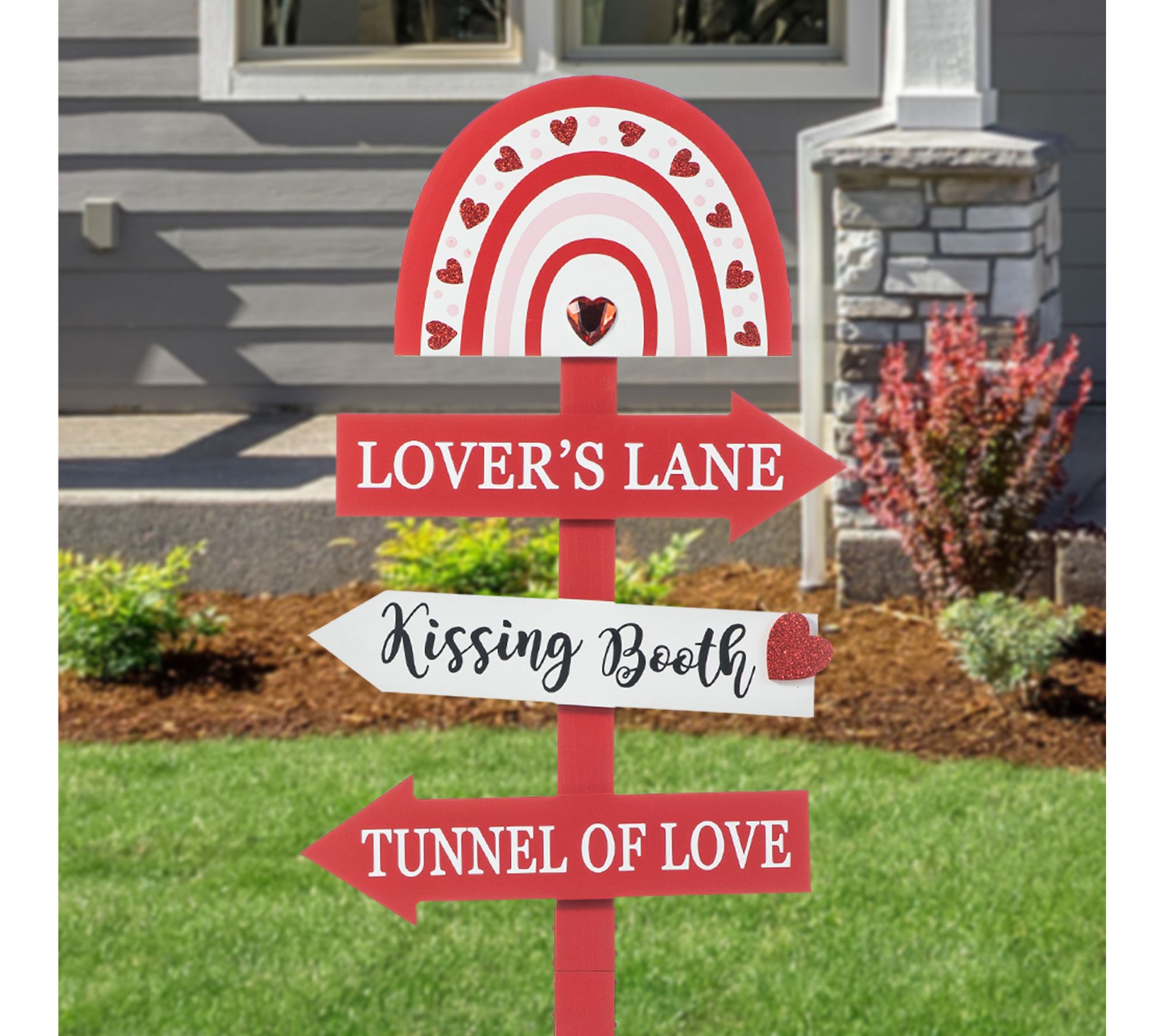 Bring a touch of love and charm to your garden with this whimsical Valentine's Day garden stake. Featuring a rainbow-shaped bridge adorned with lovely hearts and a series of romantic road signs, it guides you along the path to love. Perfect as both a stake and wall hanging, this unique decoration is a delightful addition to your outdoor space. From Glitzhome.