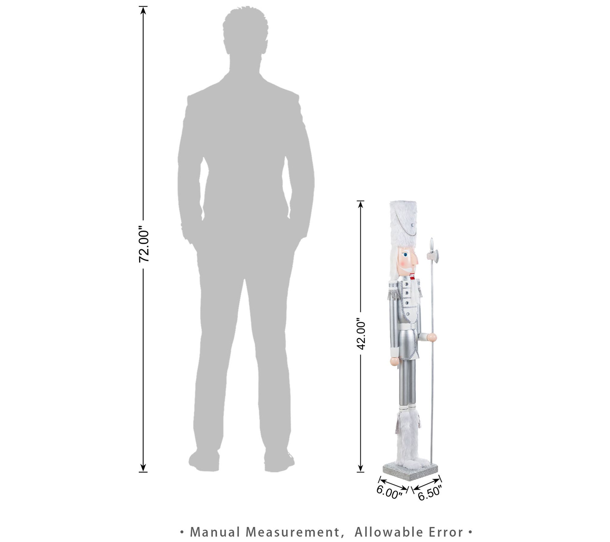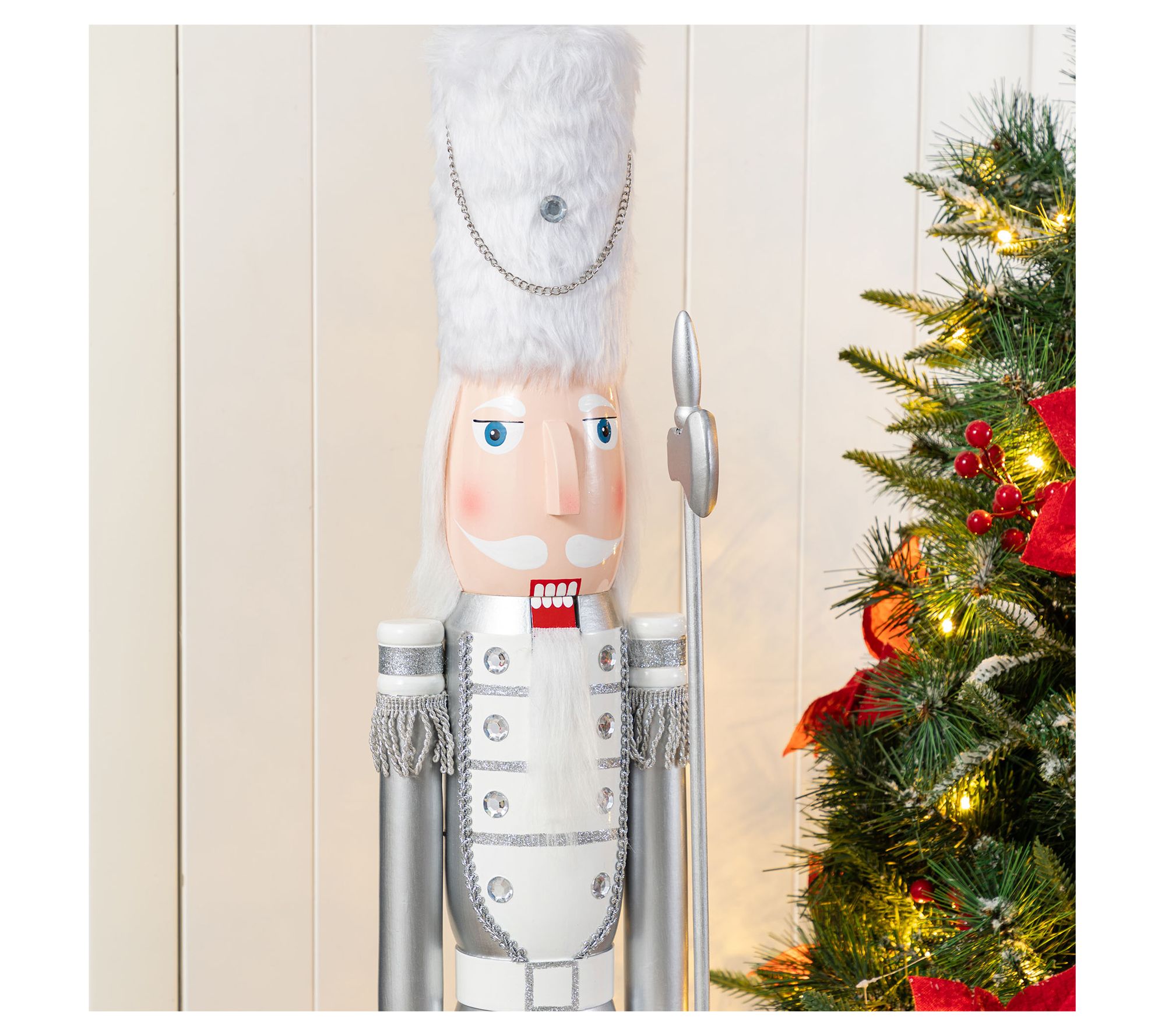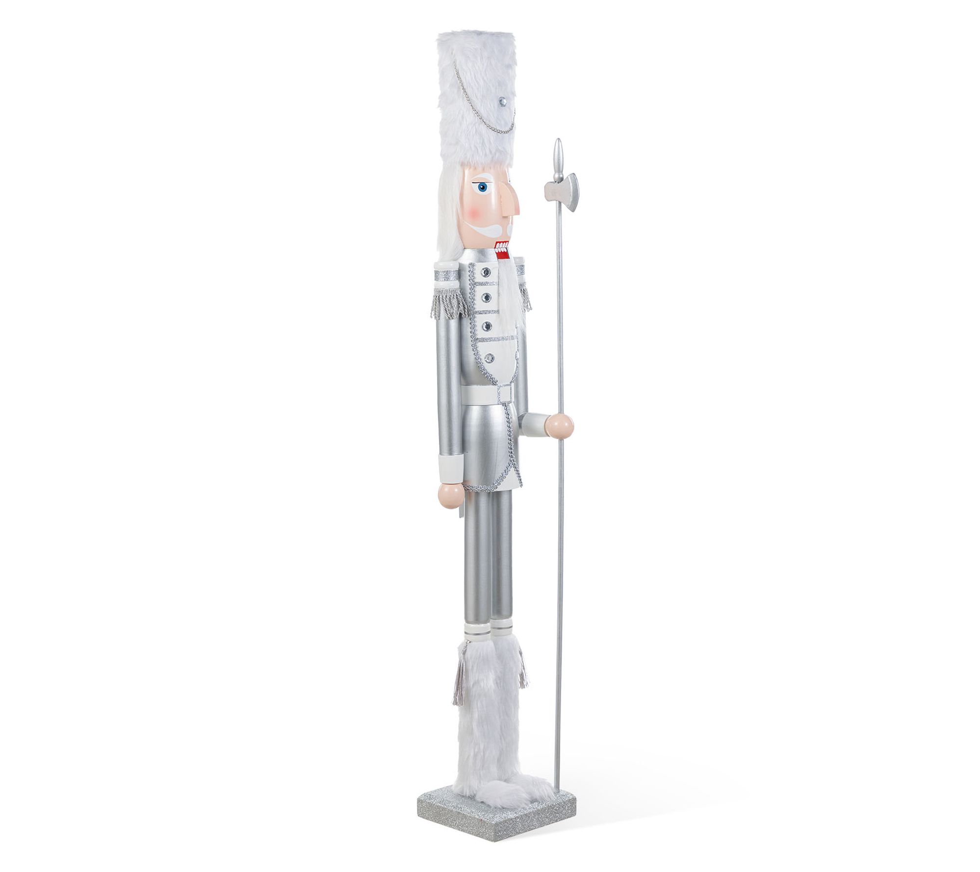 Staging a grand welcome at your doorstep, this majestic figure proudly stands in a striking silver ensemble complemented by lavish white faux fur. Not only does this exquisitely crafted soldier make an eye-catching holiday display, but it also embodies a timeless charm that enriches any festive setting. Enhanced by gleaming acrylic diamonds, its dignified aura is guaranteed to captivate guests and ignite the holiday spirit. From Glitzhome.
