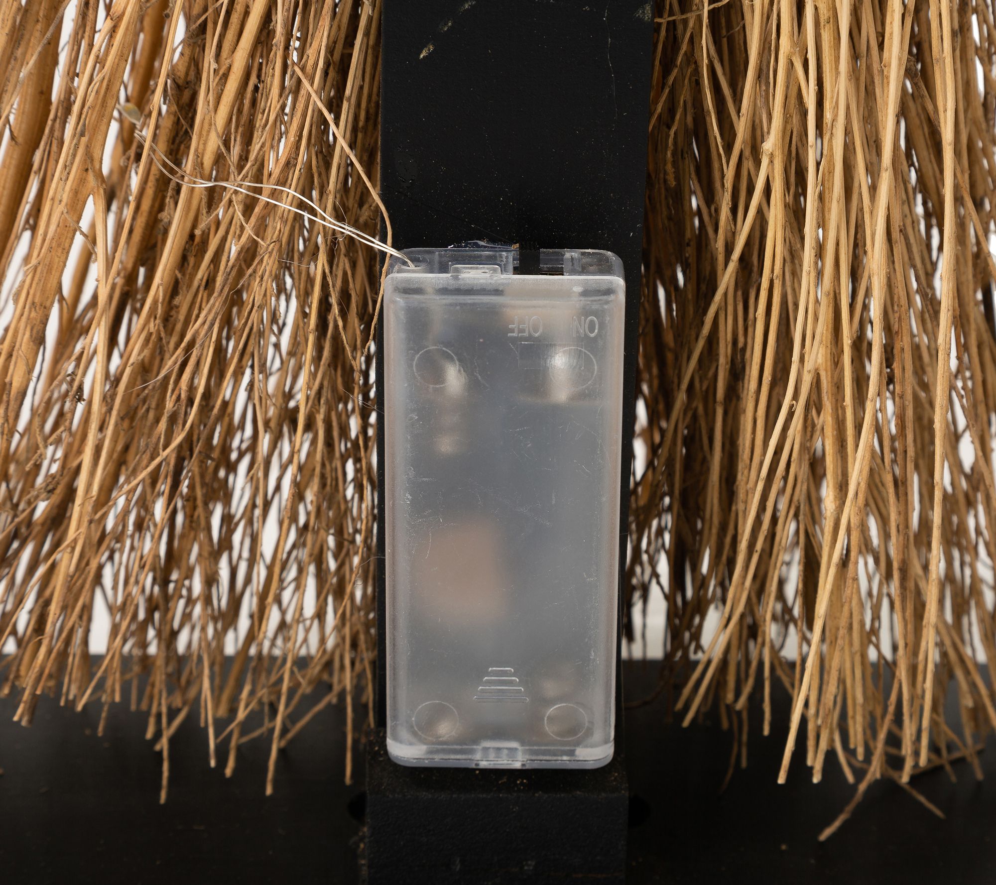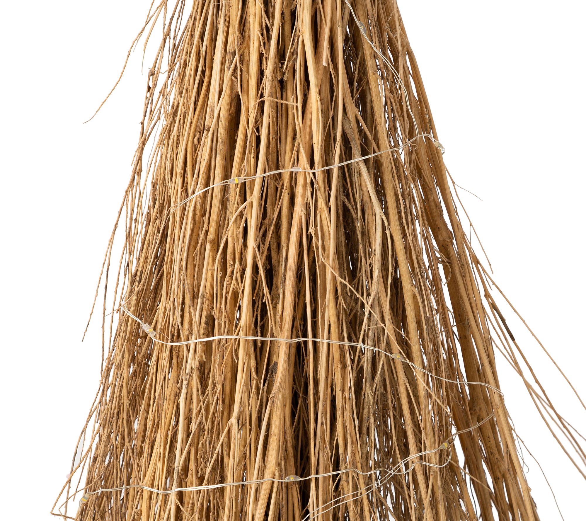 • Embellished with metal accents and raffia broom
