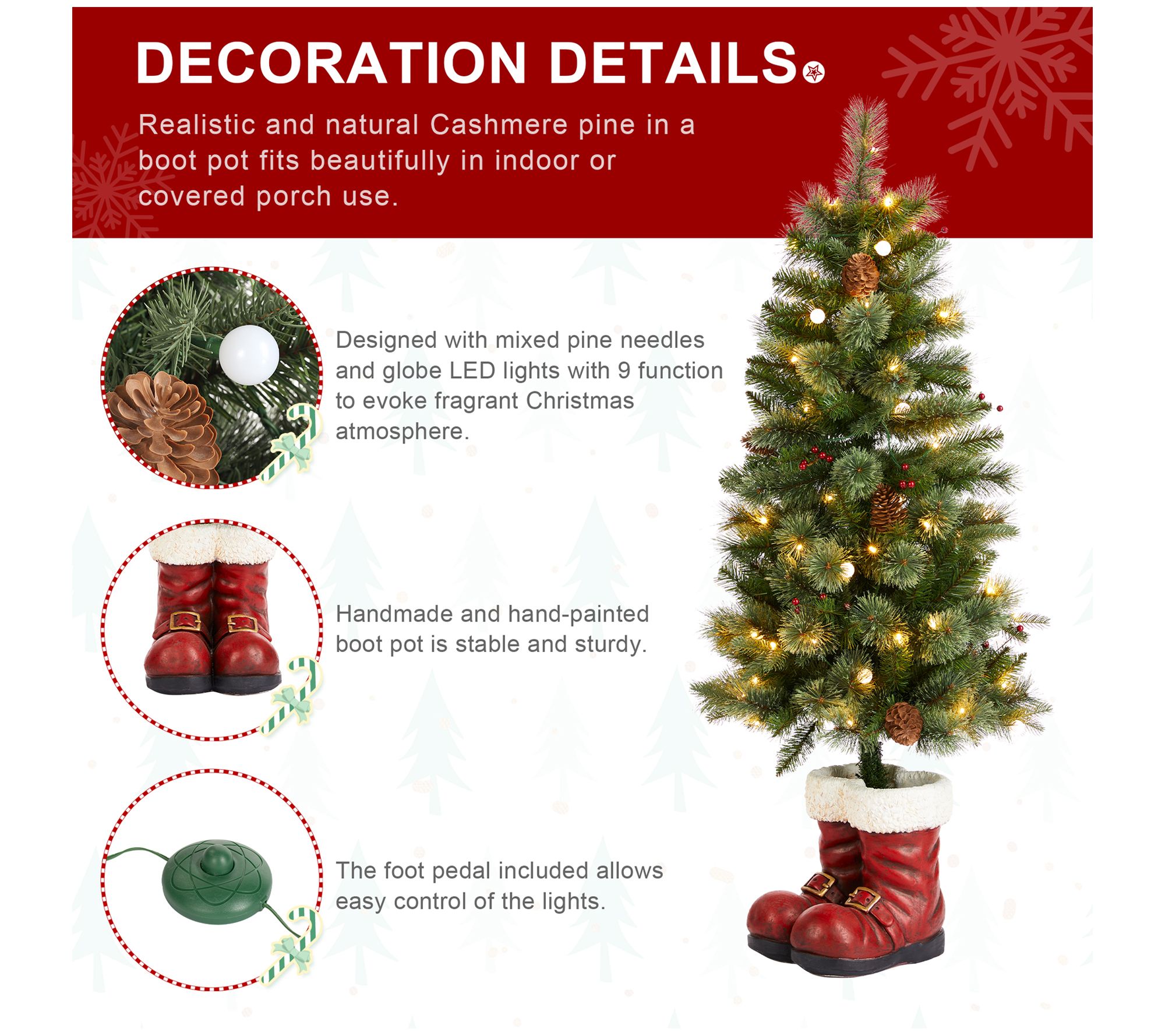 • Includes life-like tree in Santa boot-shaped pot and foot pedal