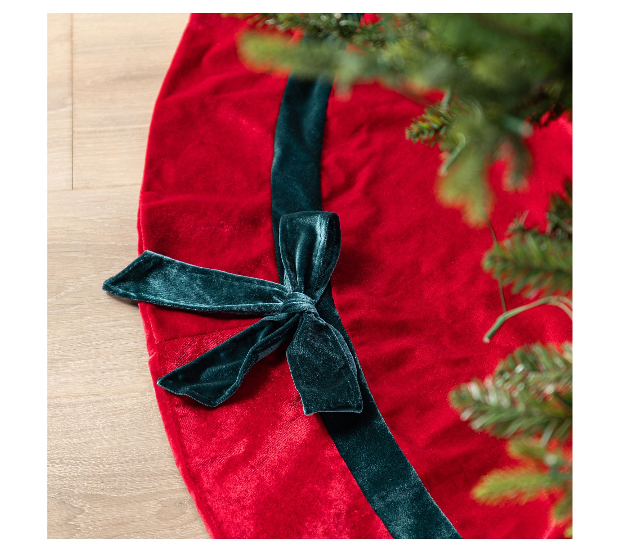 • Rich red velvet fabric with dark green accents and satin bows