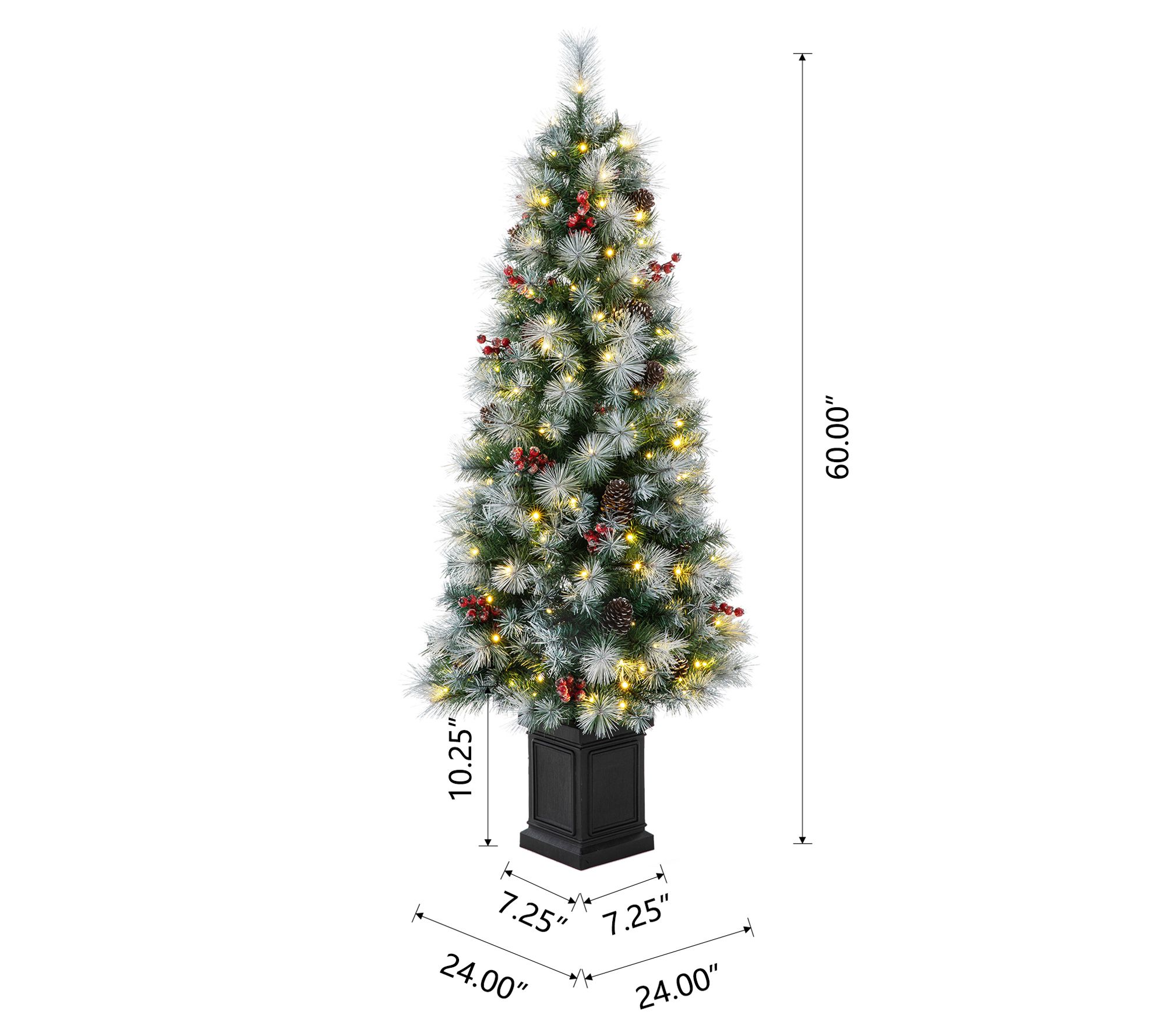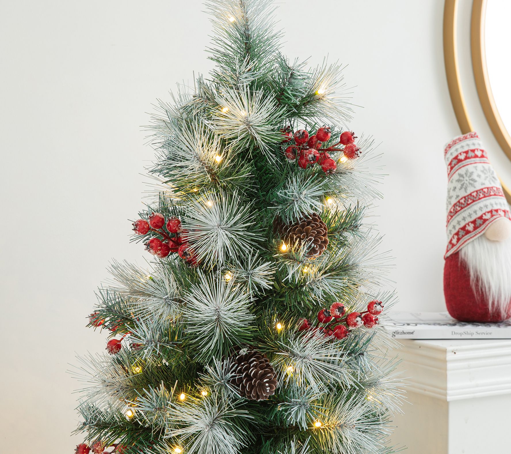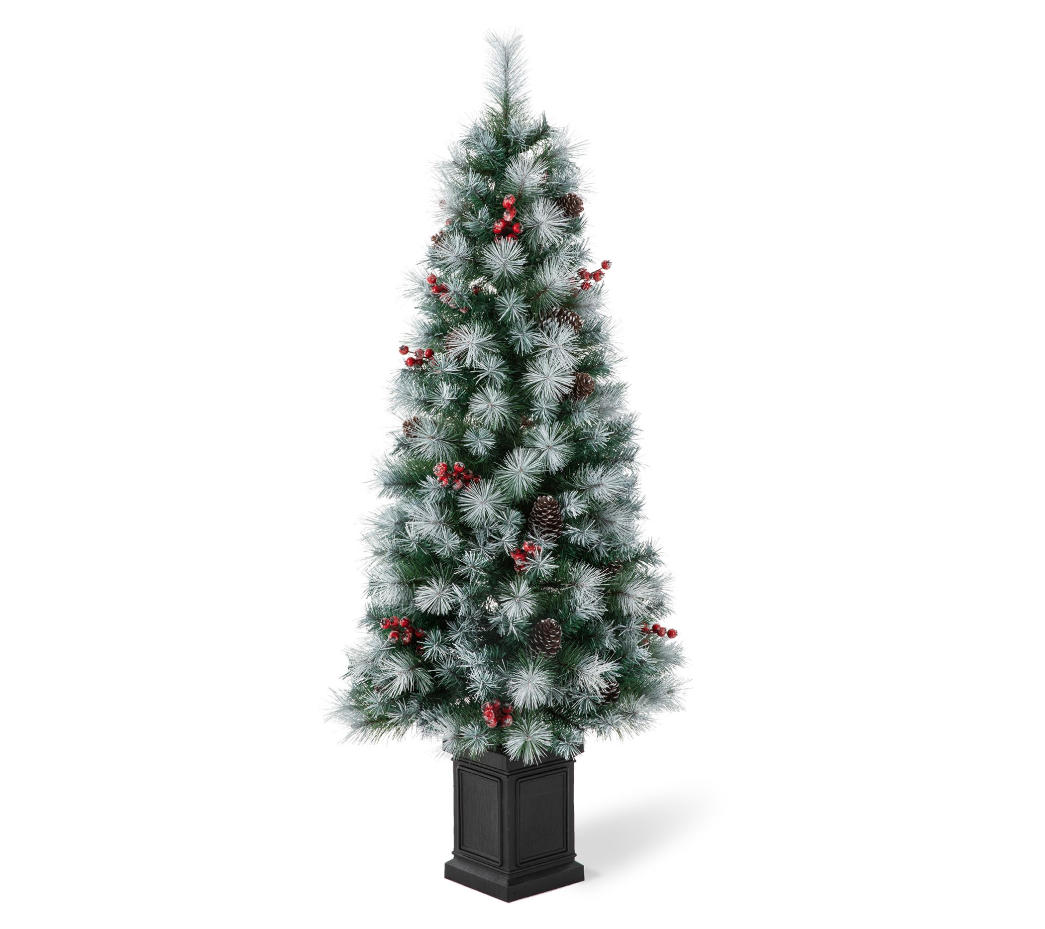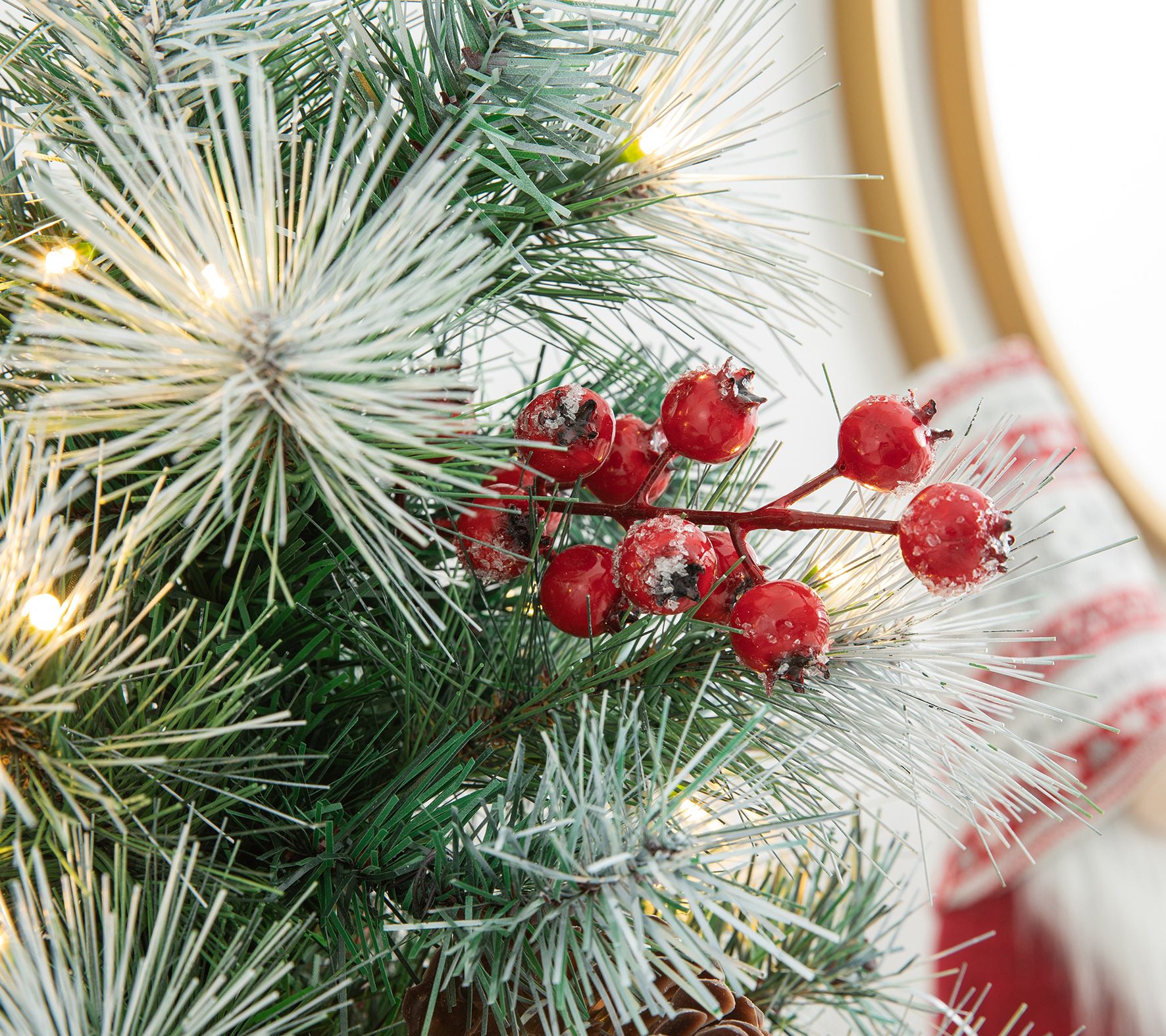 • Lightly flocked branches are trimmed with artificial berries and pinecones