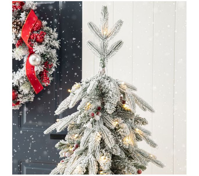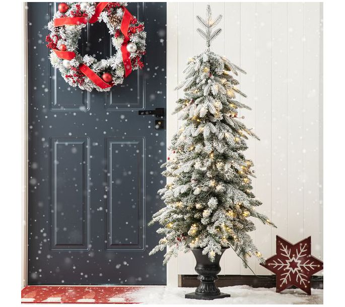 Give your guests a festive greeting with this enchanting artificial porch tree. It's covered with glittery flocking and comes pre-lit with warm white LED bulbs. From Glitzhome.