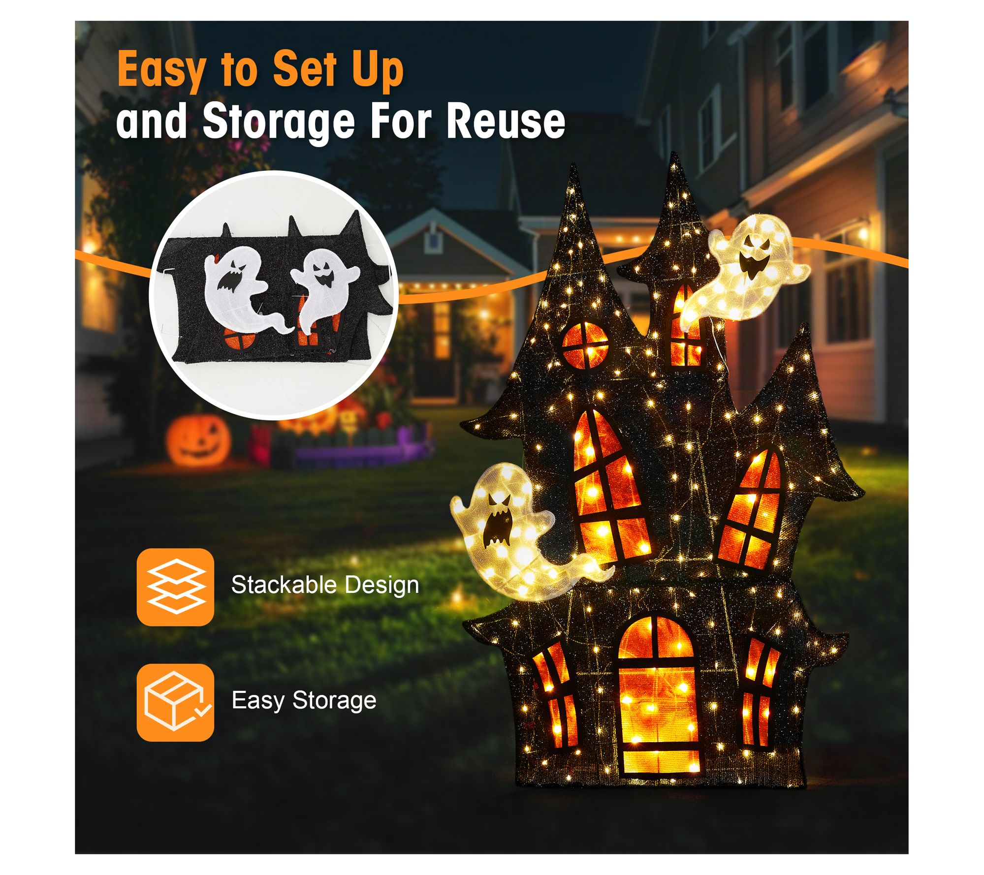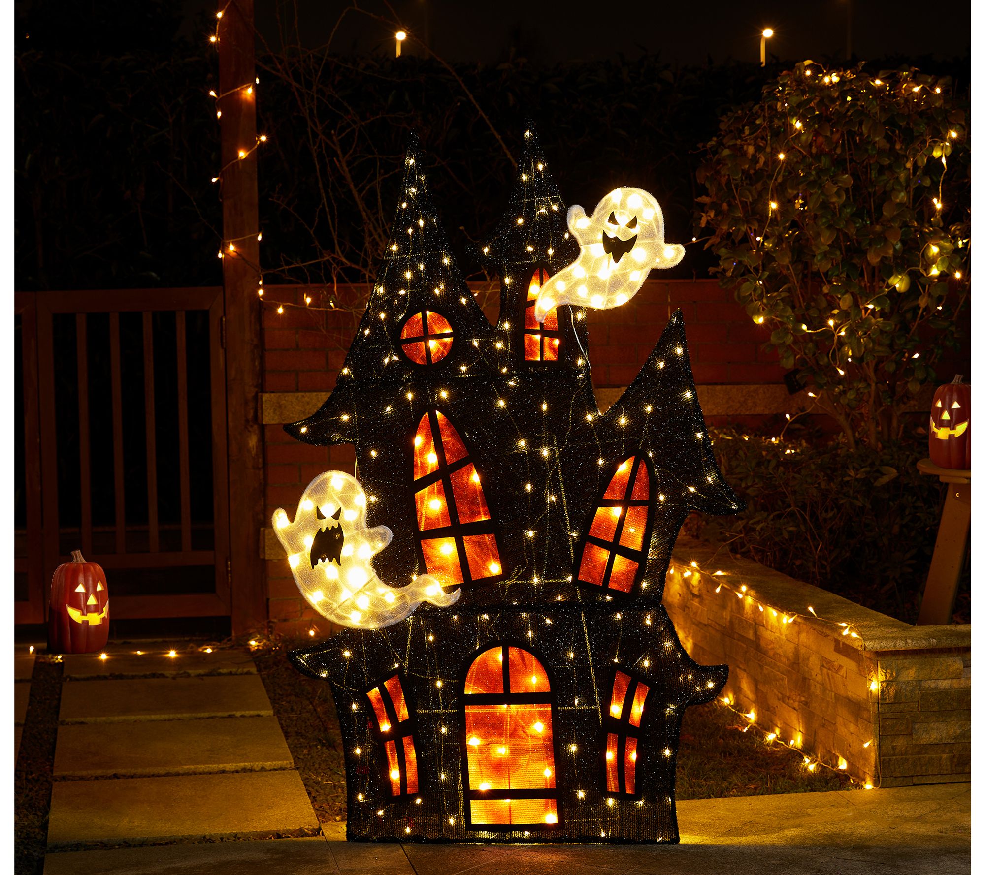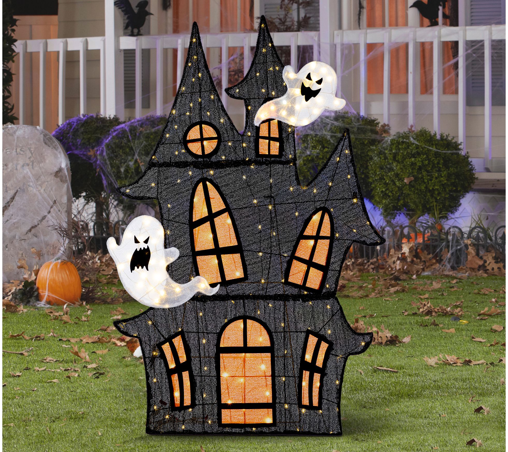 Your front yard sets the scene as dusk falls, tempting trick-or-treaters with a haunted house that shimmers in soft, eerie light. Three-dimensional spires and playful ghosts add character, while warm white LEDs create a cozy yet mysterious glow that enchants every passerby. Let your garden or entryway turn into a showstopper this Halloween. From Glitzhome.
