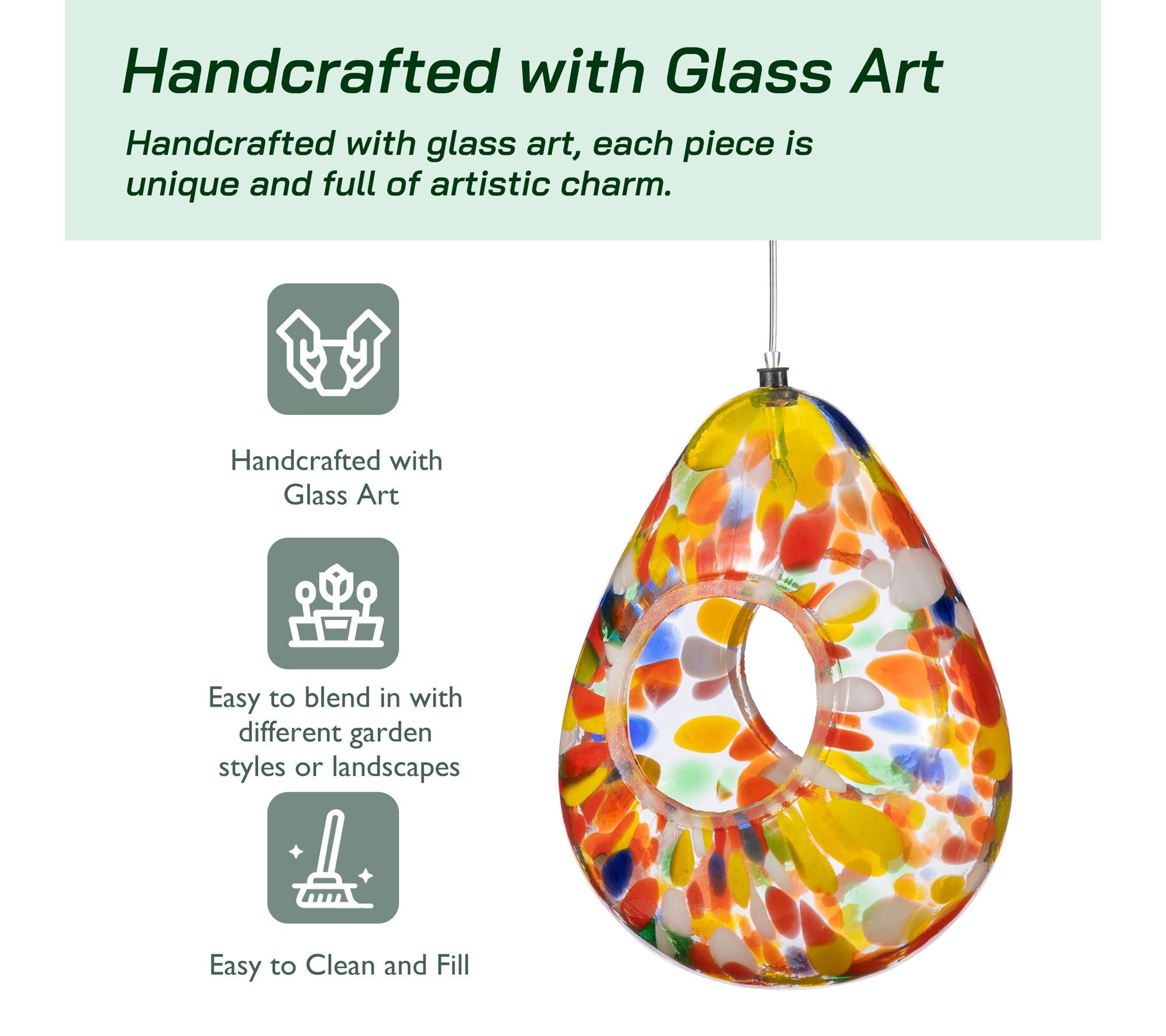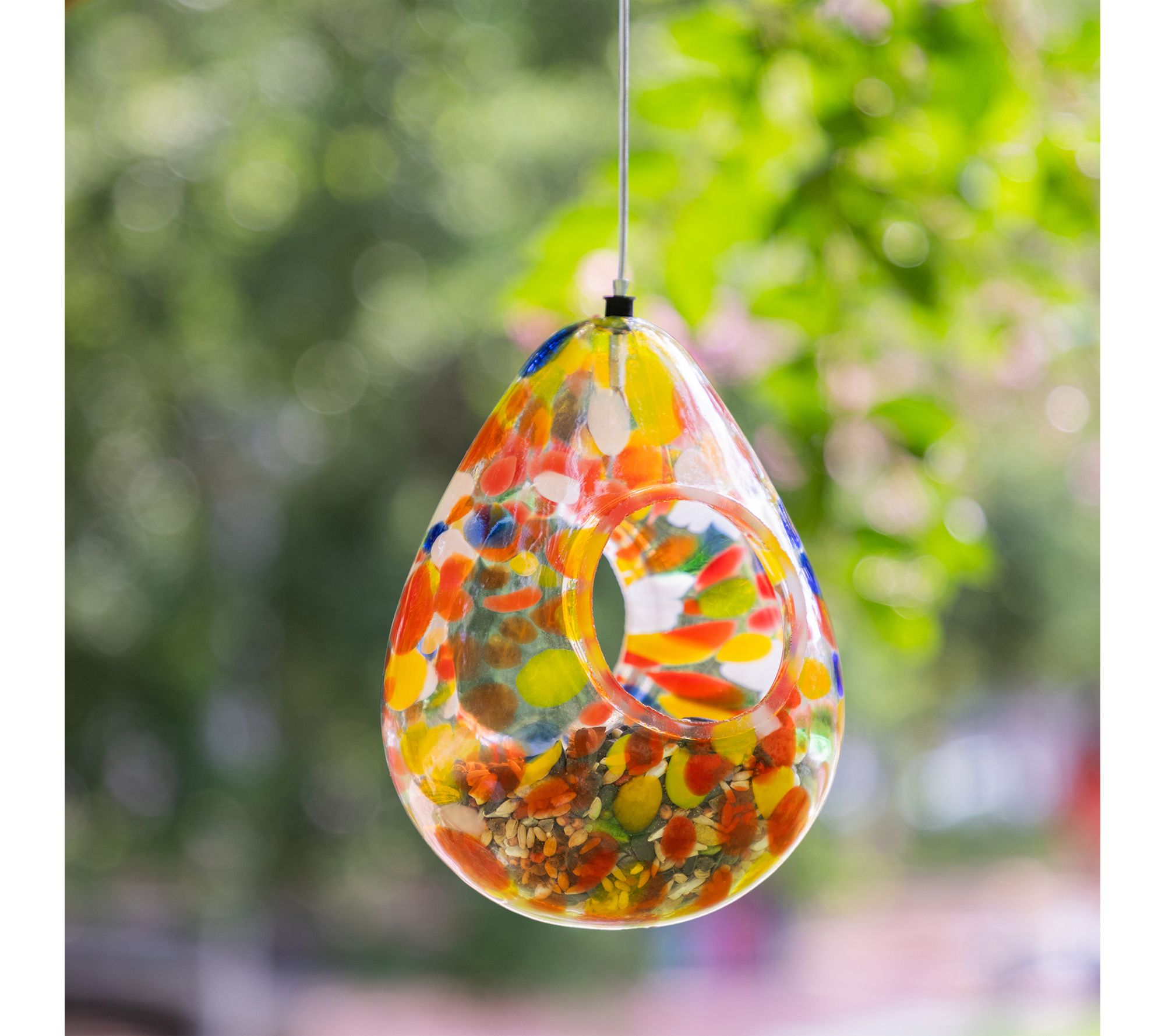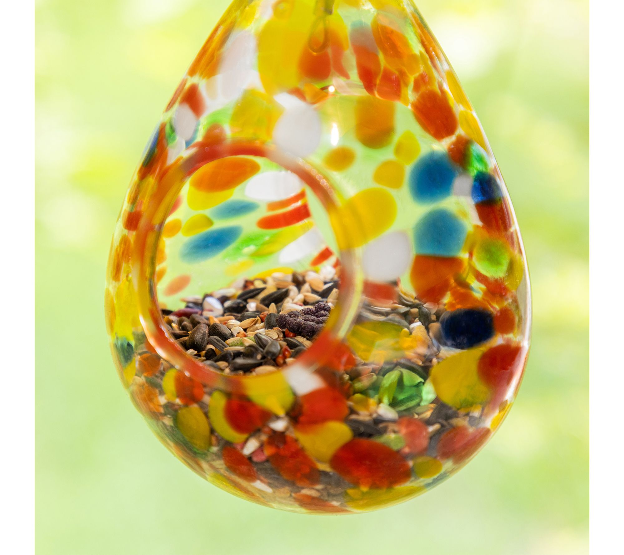 Invite nature's beauty into your outdoor space with this Glass Water Drop Bird Feeder. Carefully designed to be both functional and decorative, this glass bird feeder boasts a unique water drop shape adorned with vibrant orange dots -- an eye-catching piece guaranteed to elevate your garden, patio, or backyard. From Glitzhome.