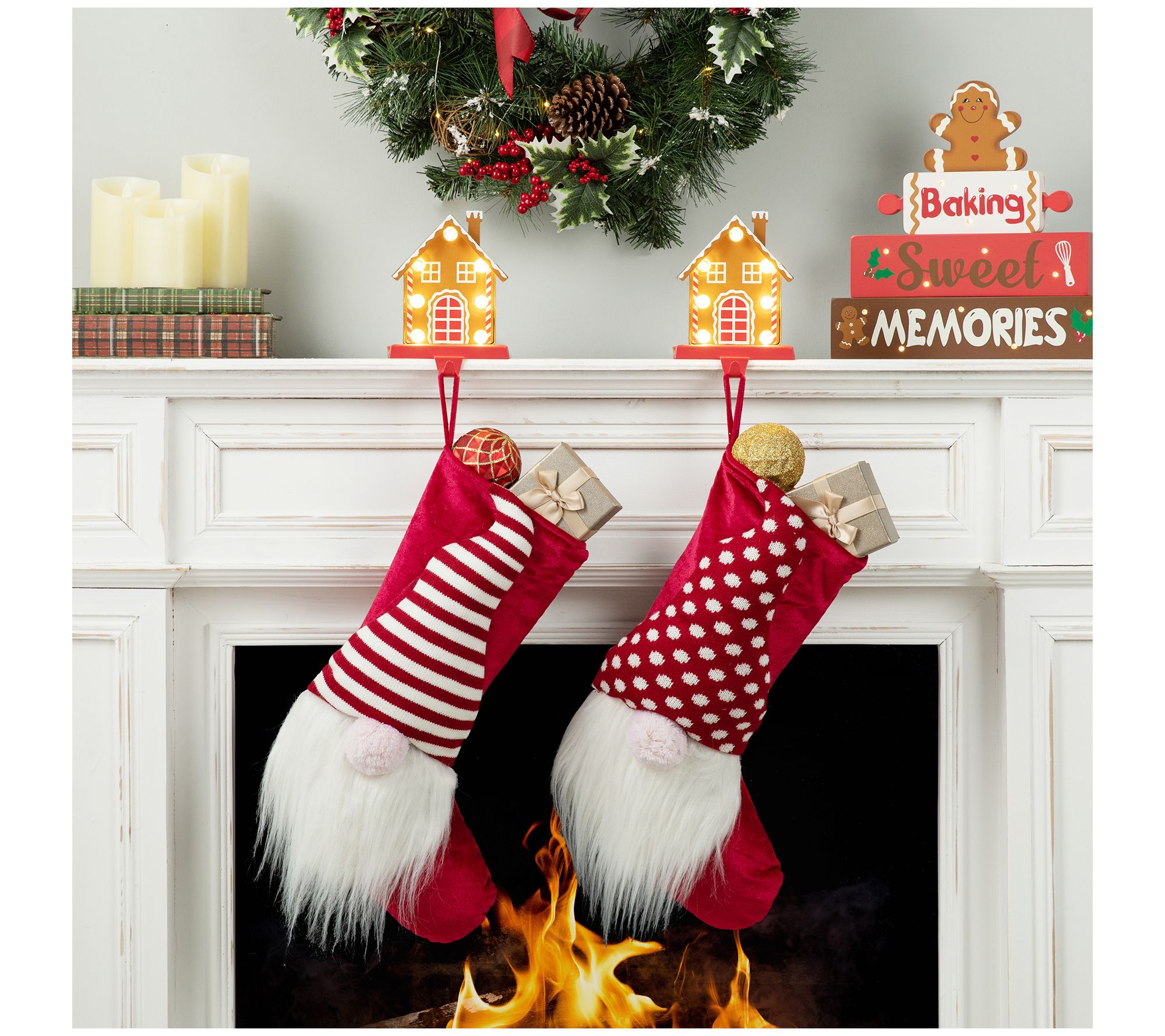 Add a sweet touch of holiday fun to a mantel or shelf with this adorable gingerbread house stocking holder, featuring tasty-looking details and LED lights that bring a welcoming glow to your space. From Glitzhome.