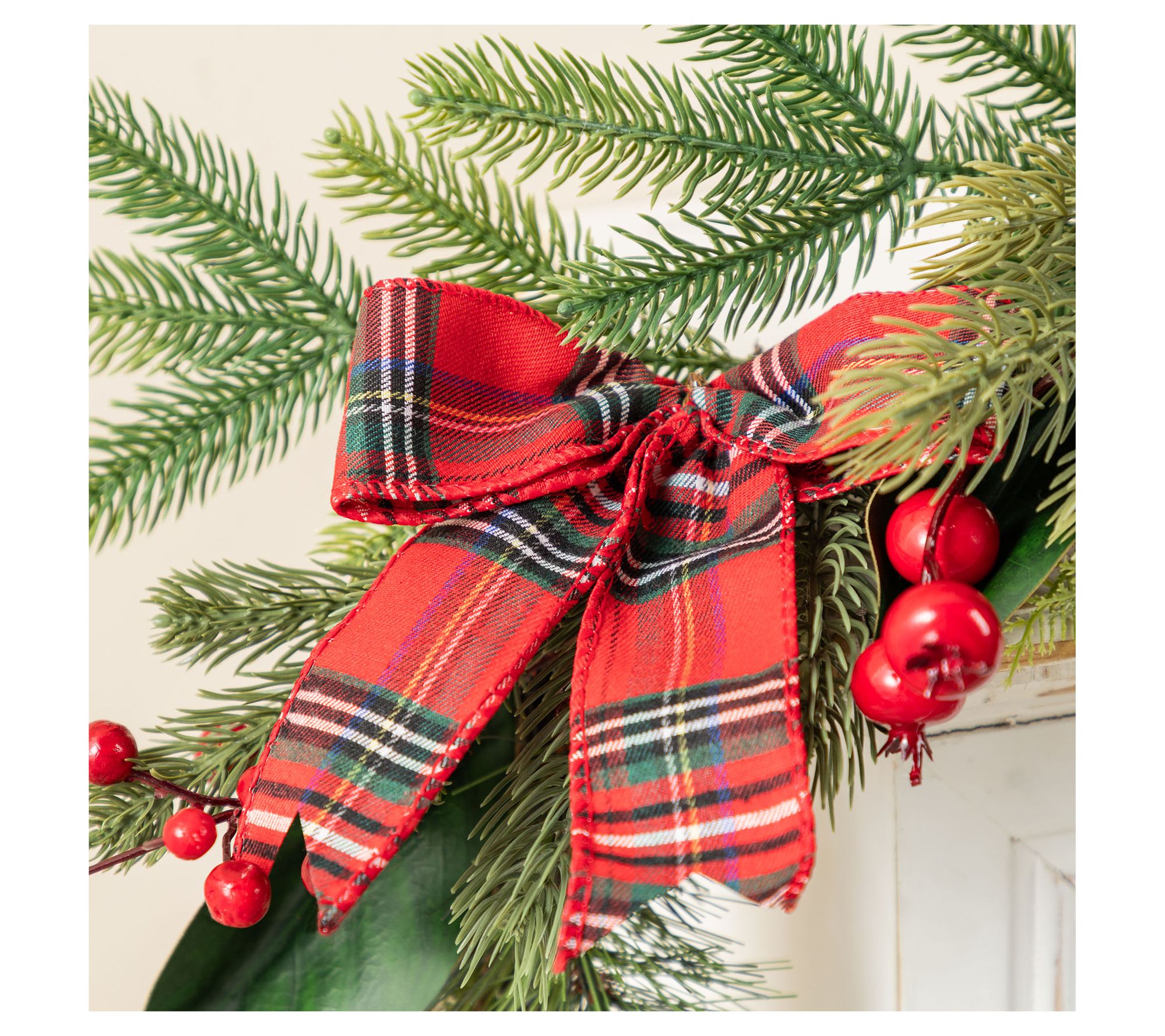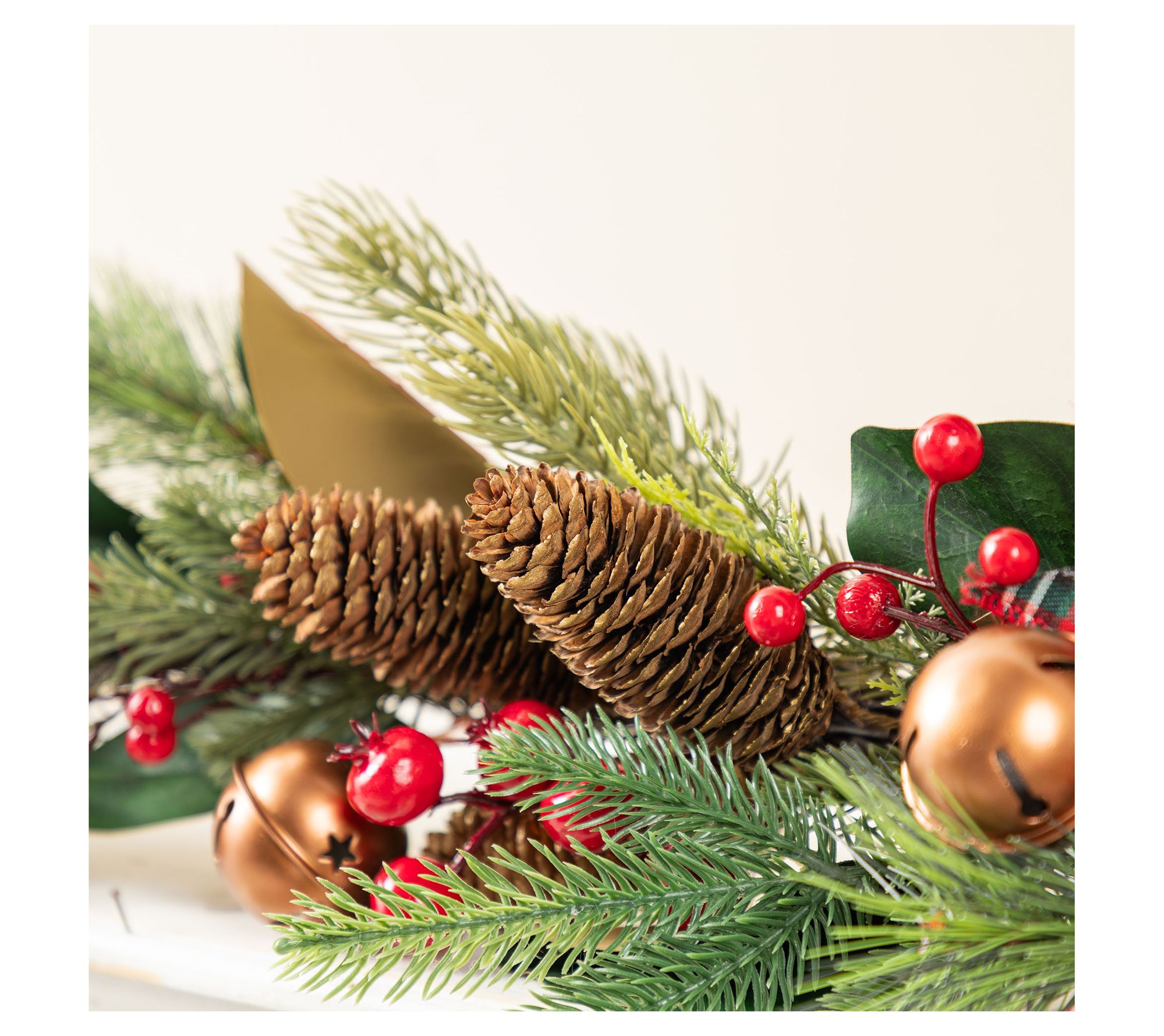 • Features lush greenery with red bows, copper-colored bells, pinecones, and berries