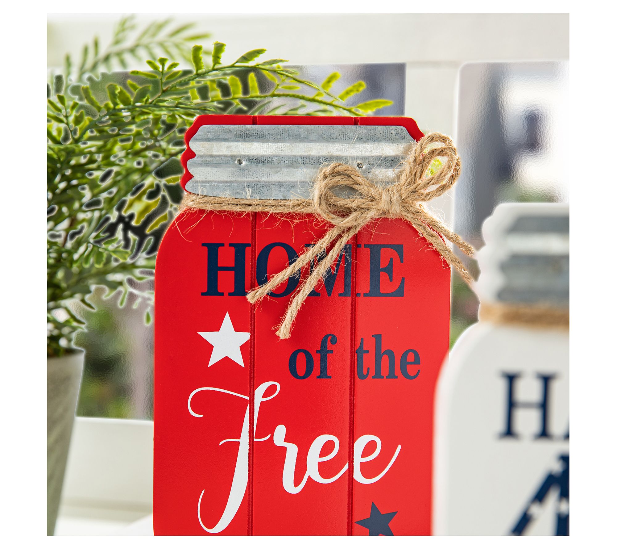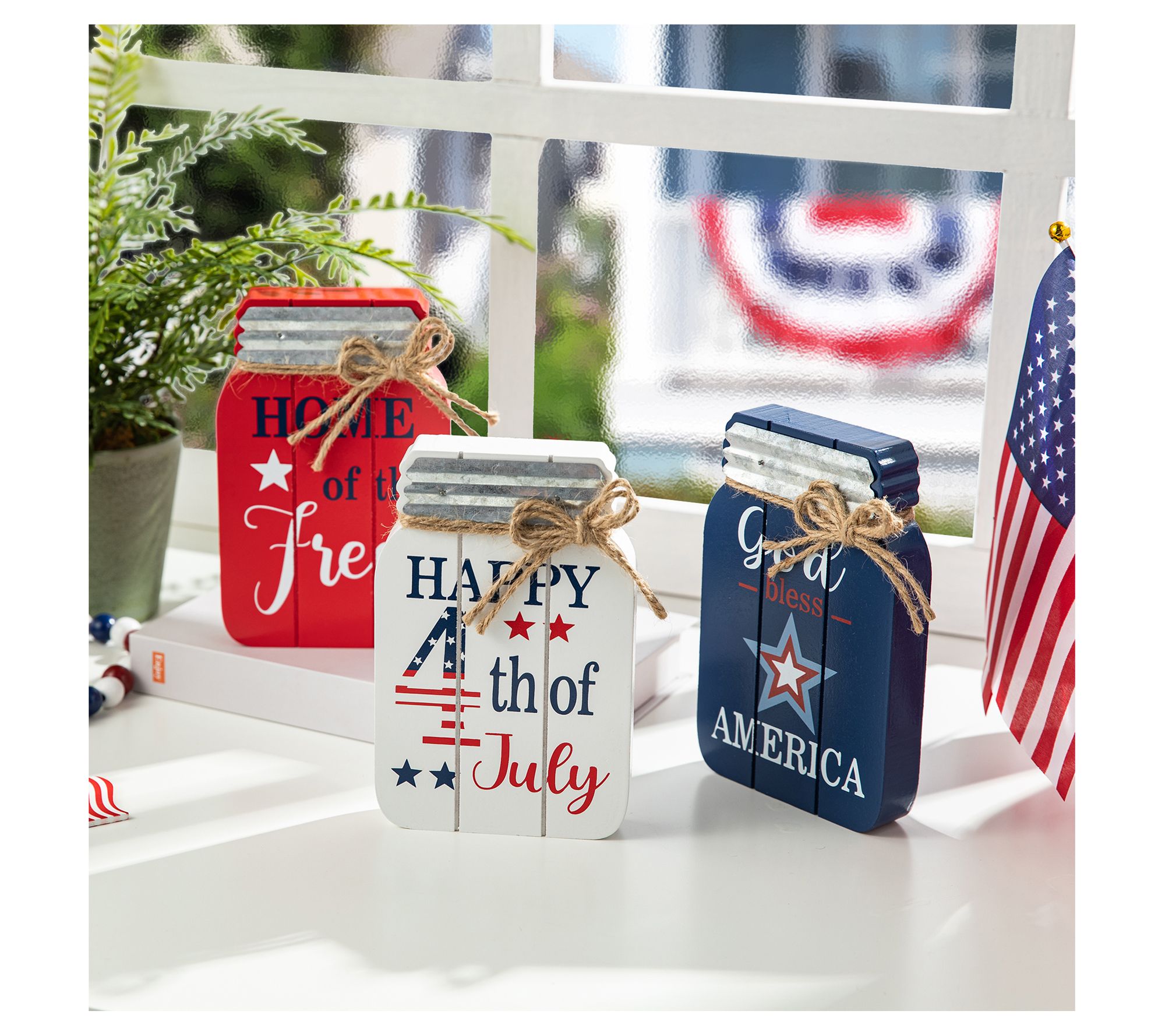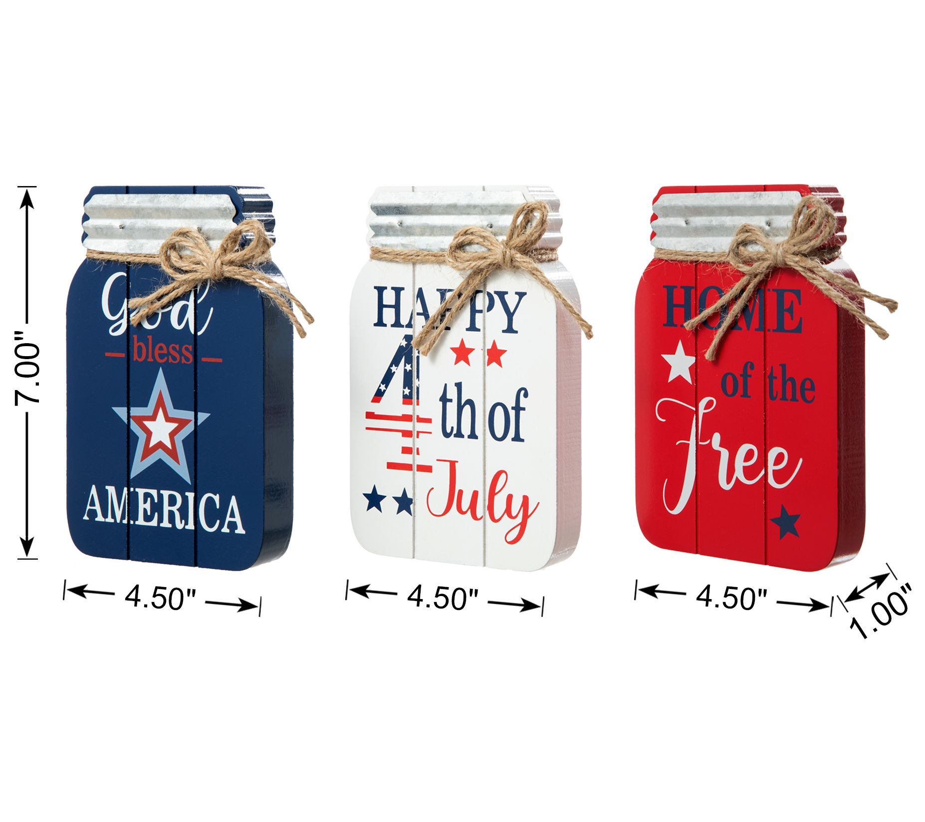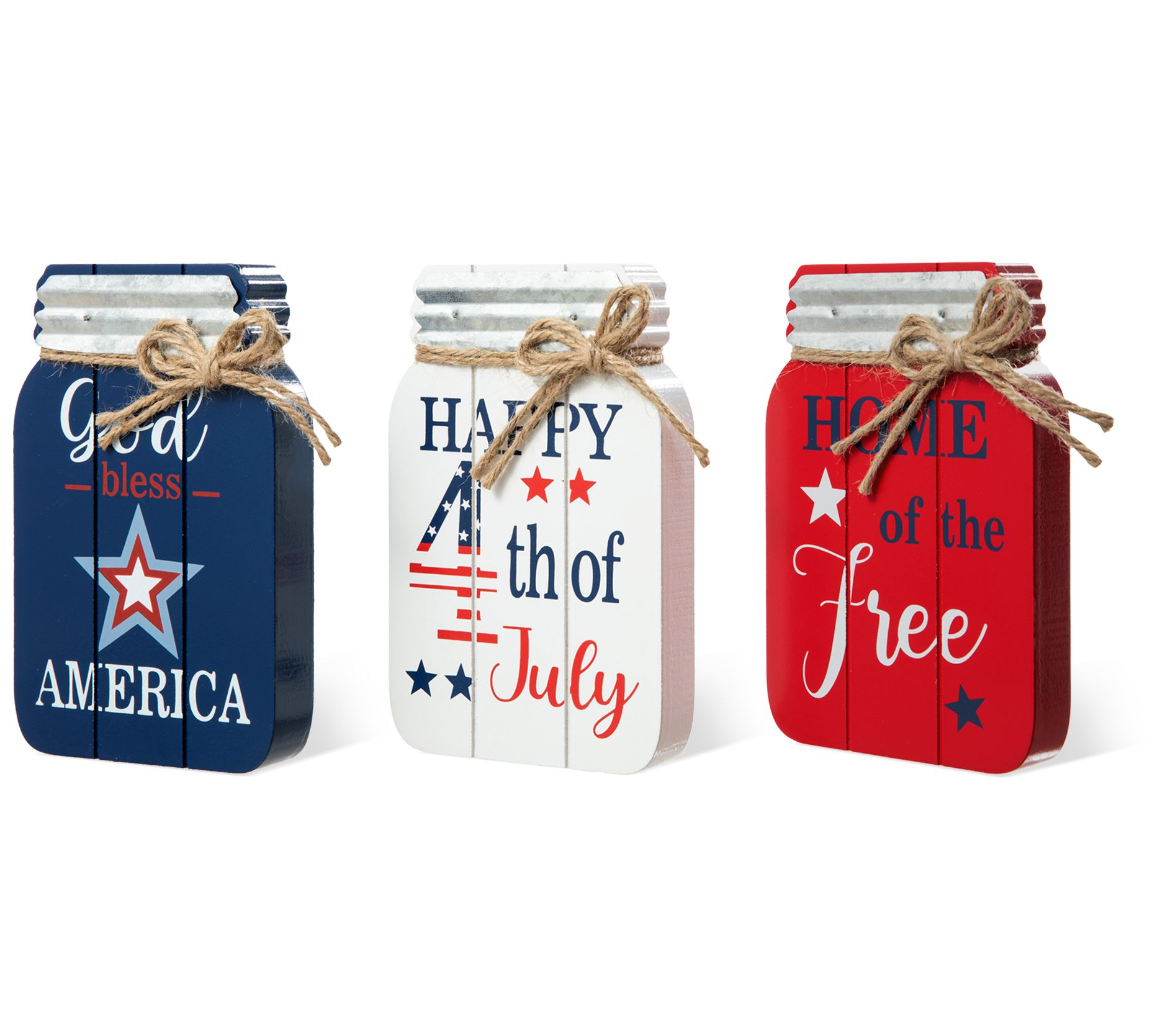 Boasting farmhouse-chic style with Americana flair, this set of three table decorations each feature a Mason jar shape accented by classic colors, a fun message, and a jute bow. From Glitzhome.