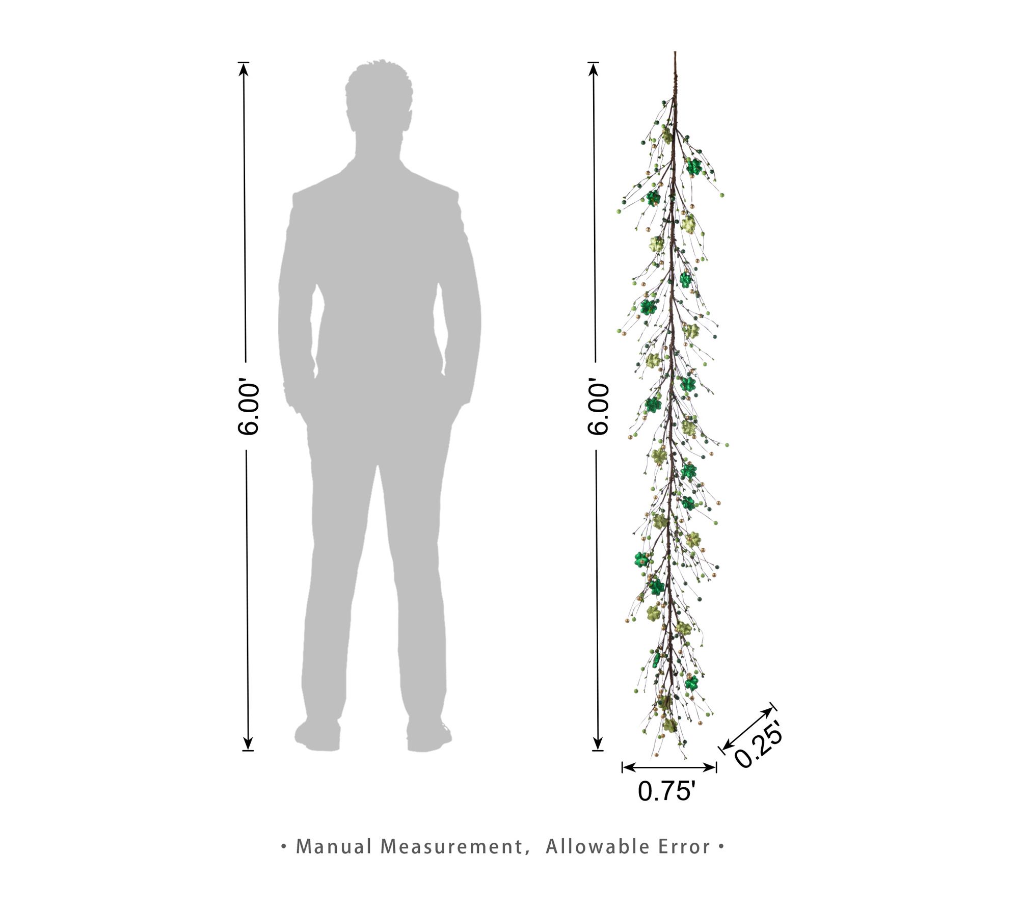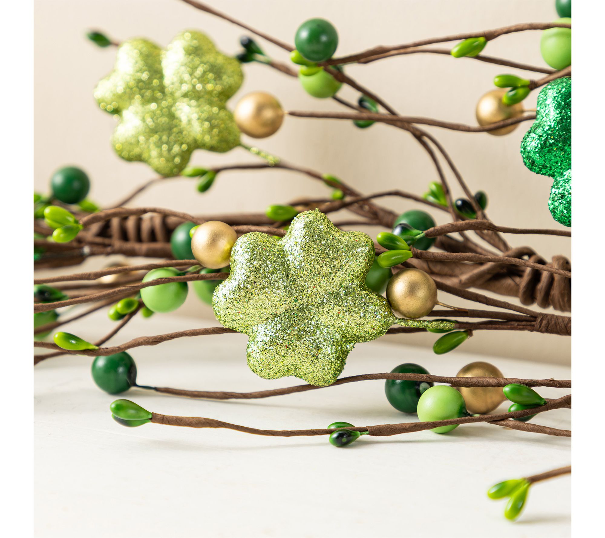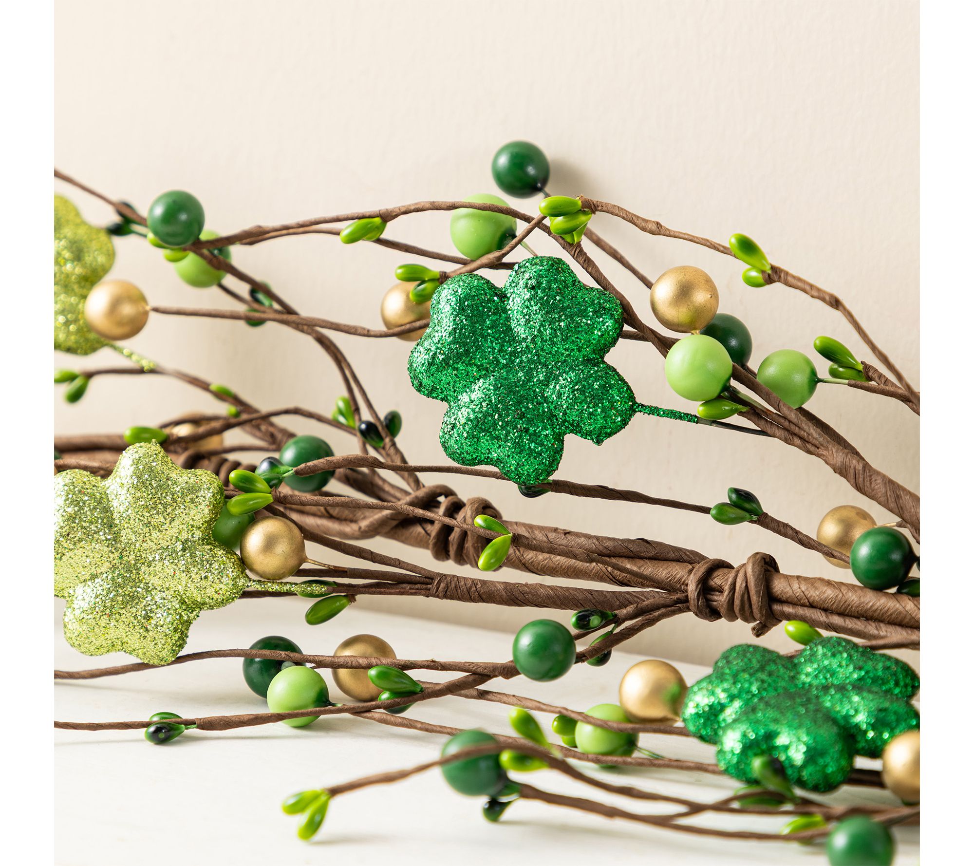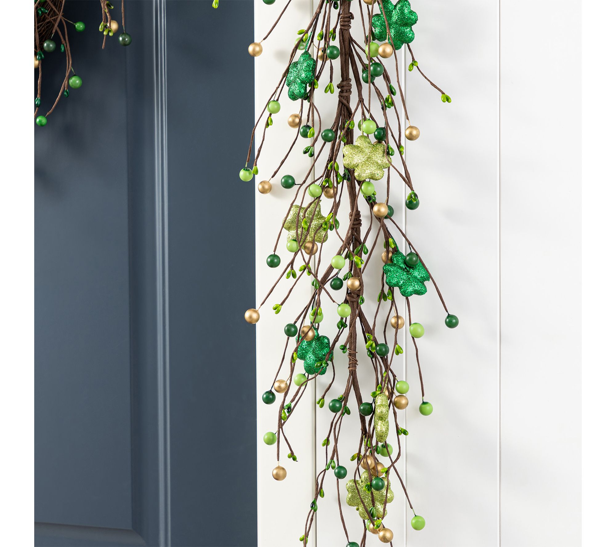 Sprinkle a bit of Irish spirit throughout your home with this festive St. Patrick's garland. Vibrant green shamrocks, goldtone beads, and petite berries twine together along the 72" length, adding a burst of cheerful color draped over doors, mantels, or stairway railings. From Glitzhome.