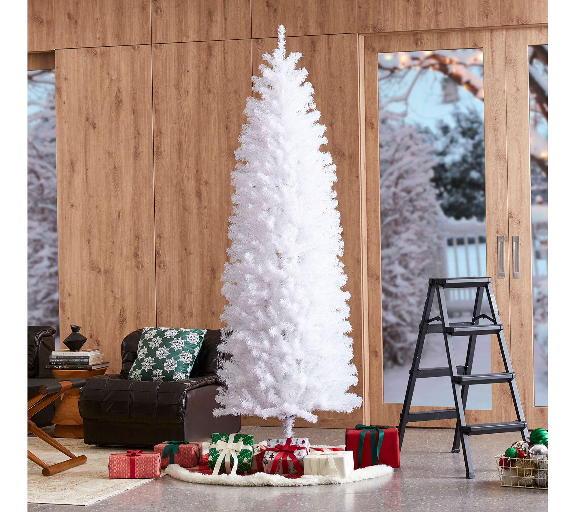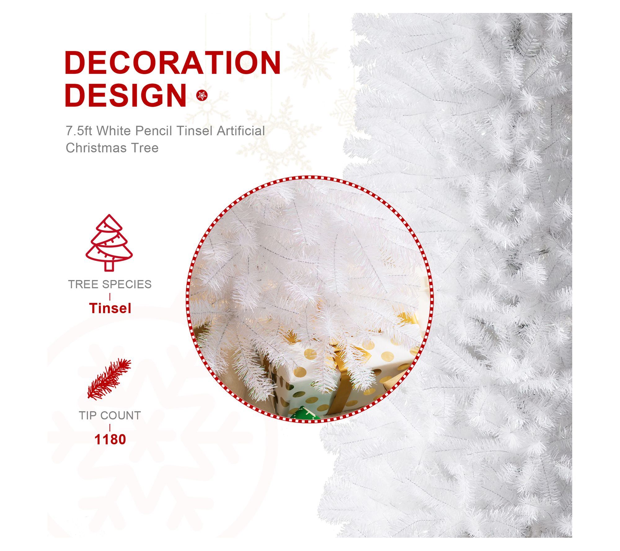 Transform your holiday decor with this shimmering faux pencil tree. Its slim, sleek design is perfect for tight spaces, adding a touch of sparkle without overwhelming the room. Complete with a matching stand, this white tinsel tree is a modern twist on traditional holiday cheer, and it's easy to set up for instant festive elegance. From Glitzhome.