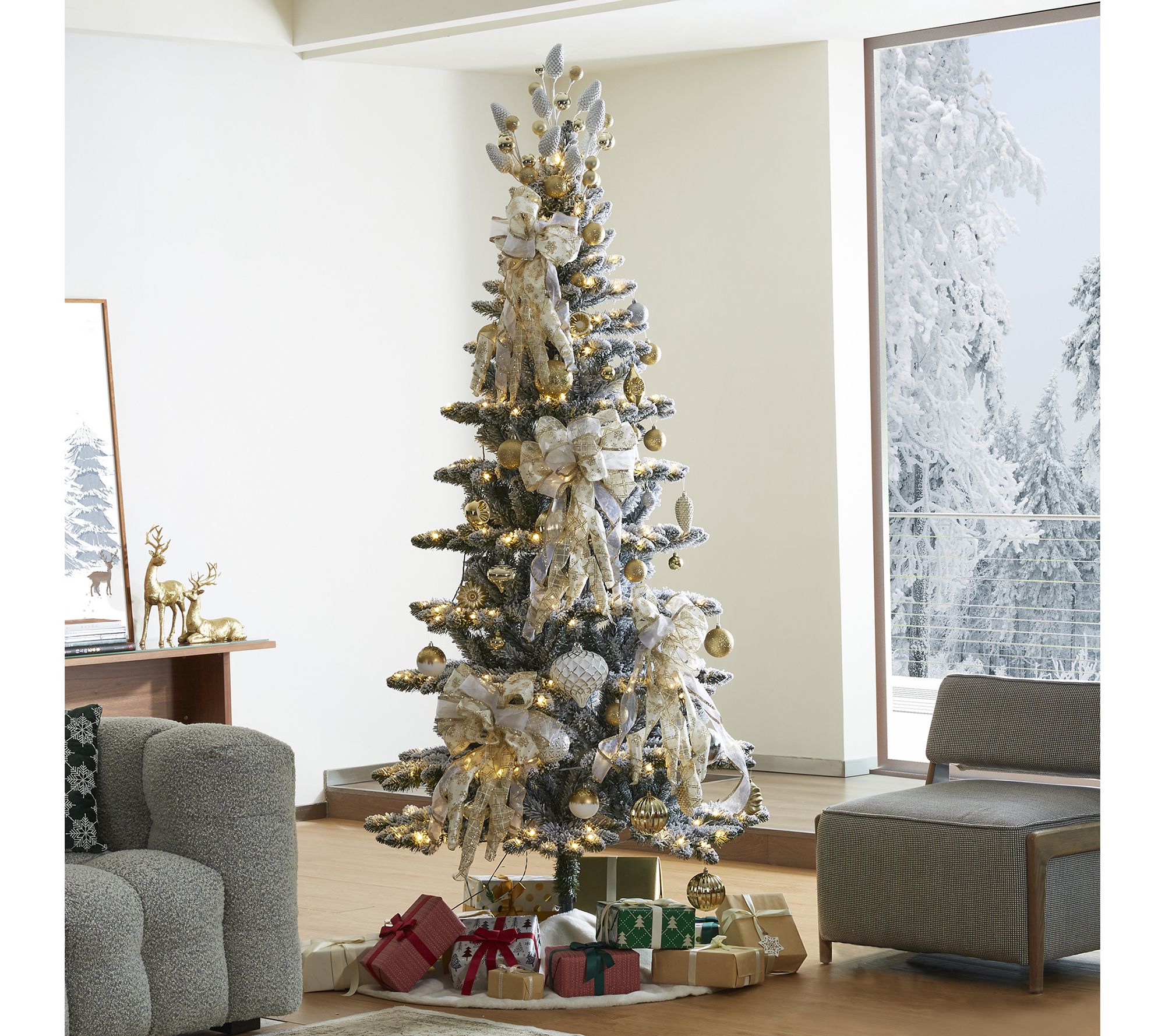 Add a touch of winter wonder to your home with the Glitzhome 7.5' prelit faux flocked Spruce Christmas tree. Its elegant, slim design fits beautifully in both large and small spaces, while the snow-flocked branches and warm white LED lights create a cozy, festive atmosphere. From Glitzhome.