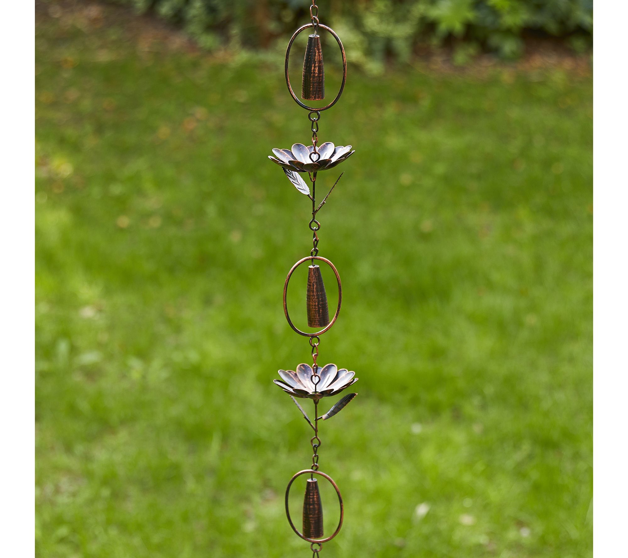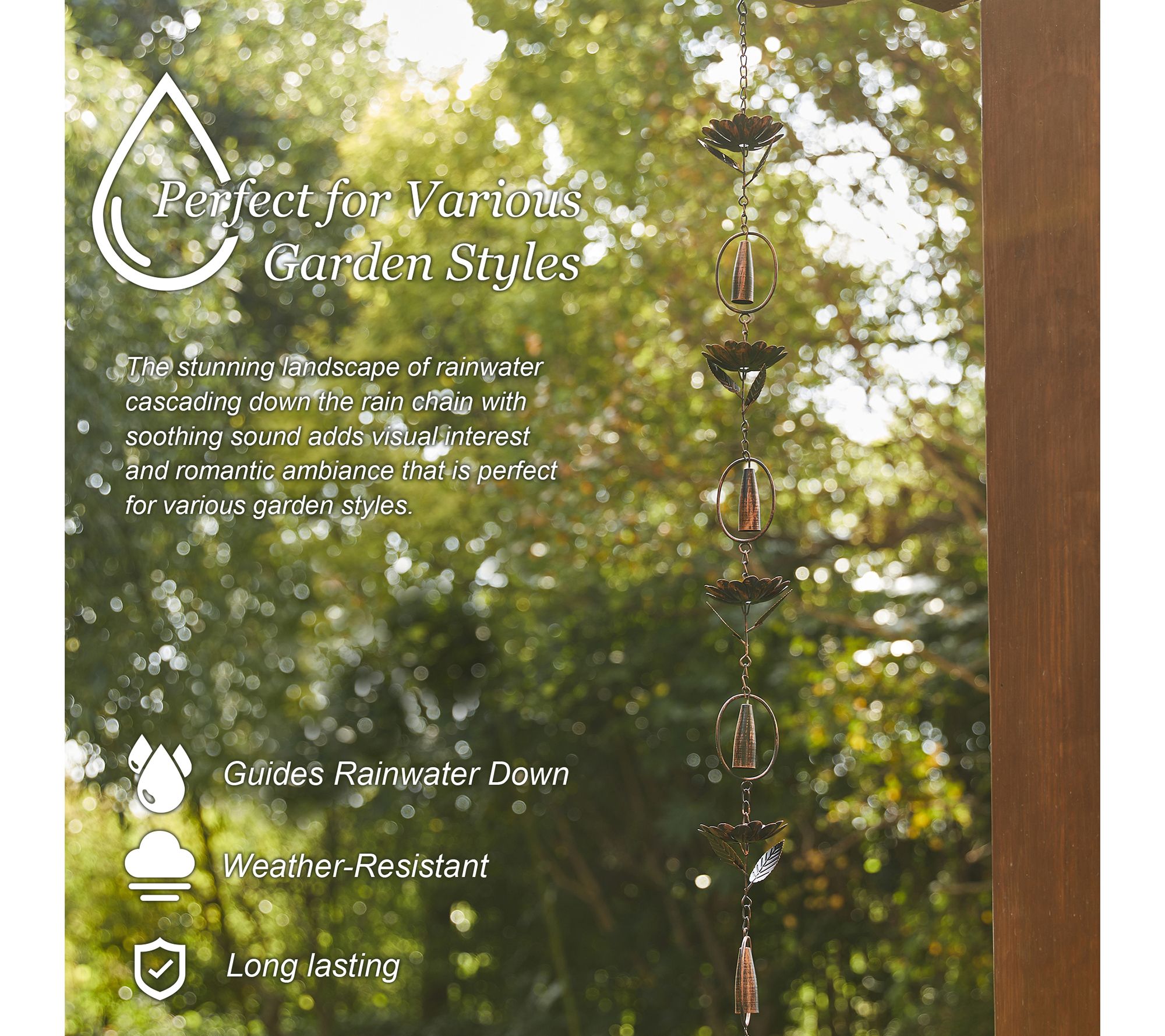Transform your garden with this faux copper lotus flower and bell rain chain. It's more than just decorative; it's a functional piece that guides rainwater down beautifully while creating a soothing sound, adding a charming and relaxing atmosphere to your outdoor space. From Glitzhome.
