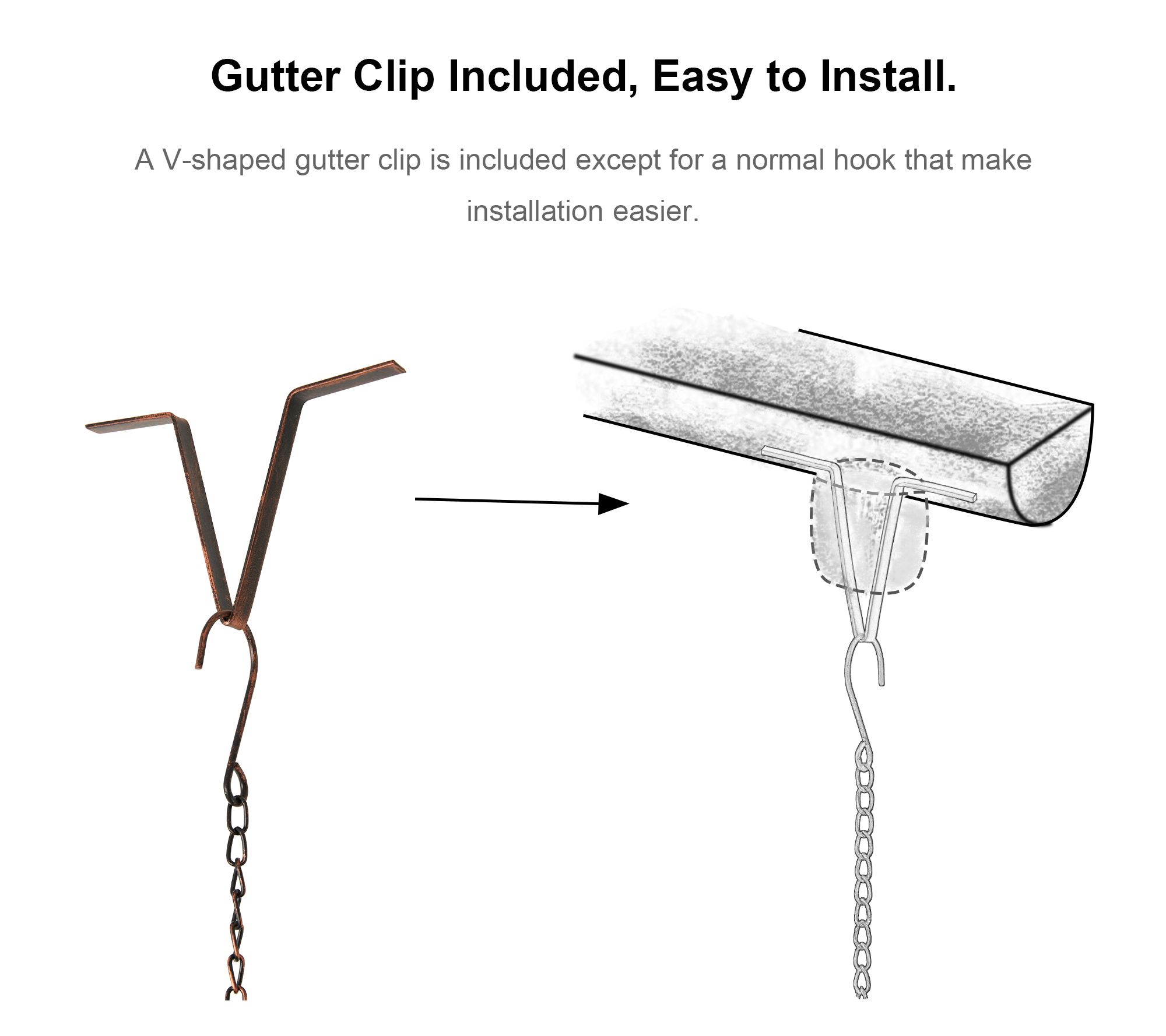 • Includes rain chain and V-shaped gutter clip