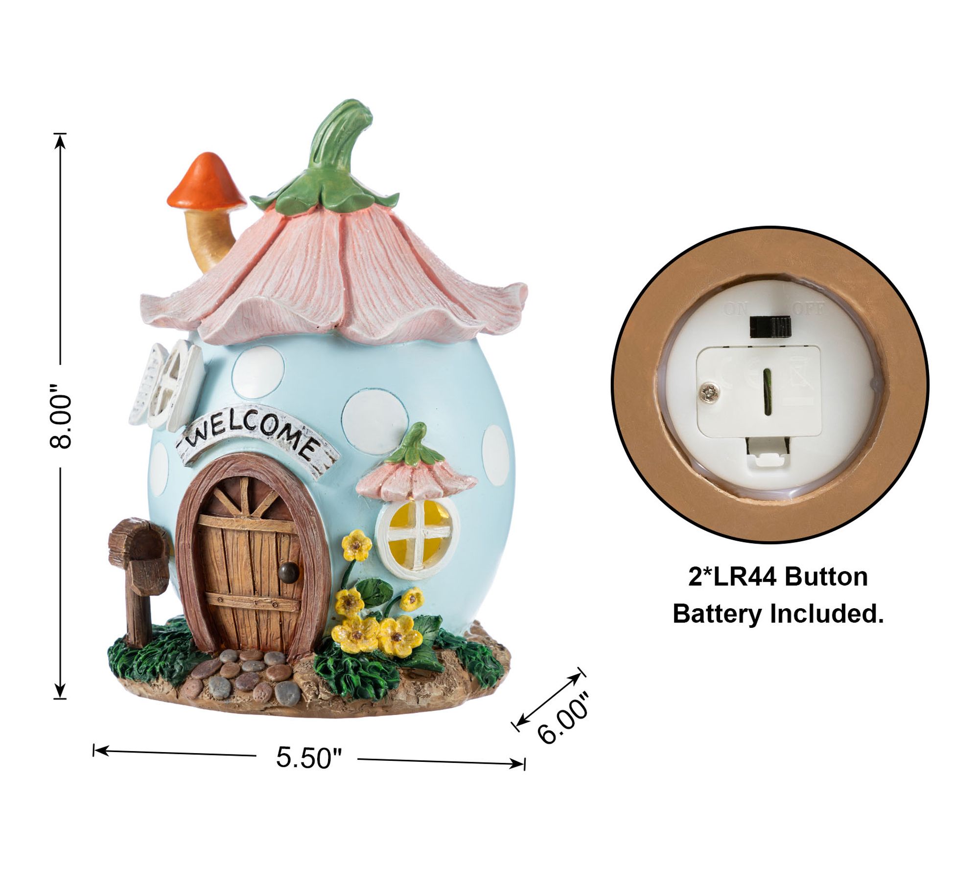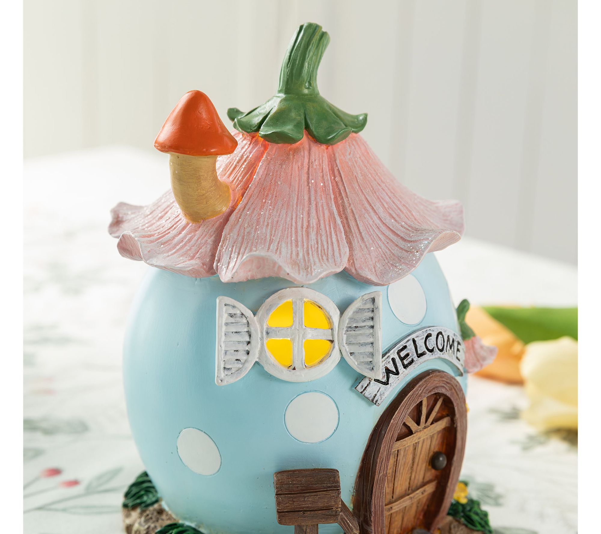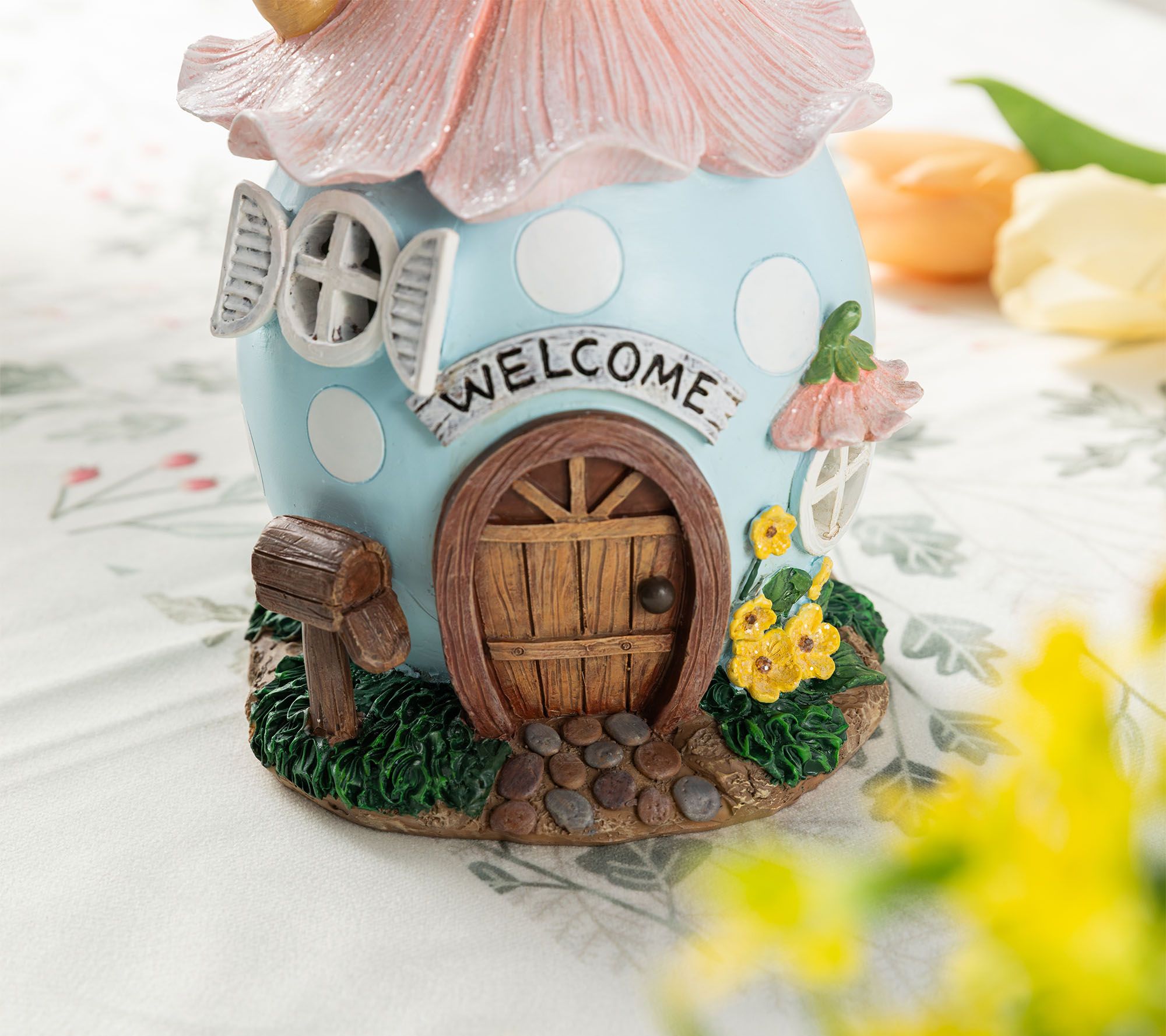 • Crafted from resin with a wooden door, flower accents, and a WELCOME sign