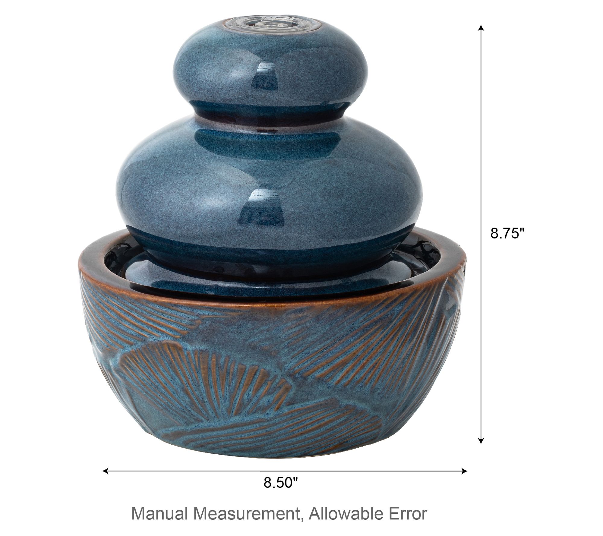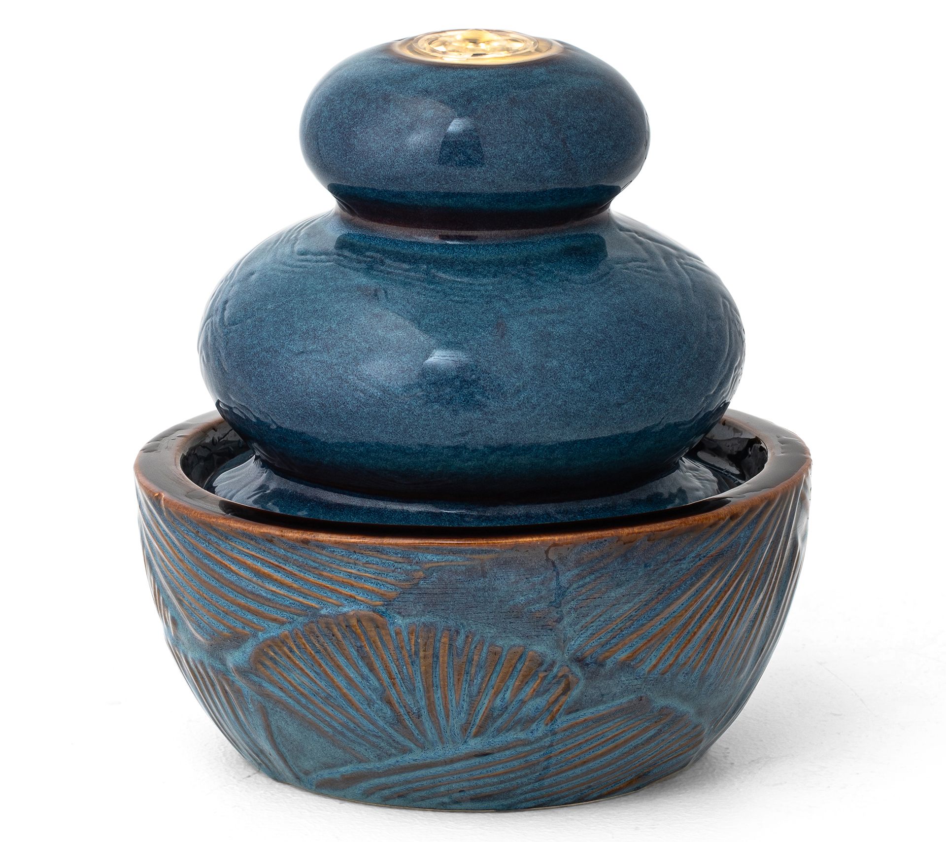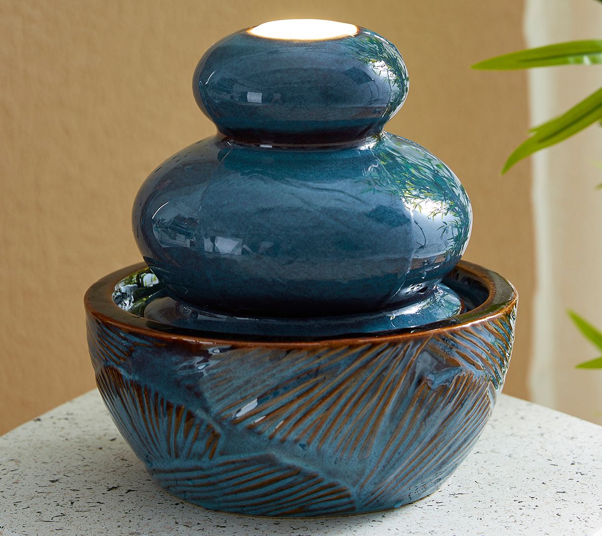 Add a touch of artistic charm to your space with this beautifully crafted ceramic tabletop fountain. Featuring a delicate embossed leaf texture and a kiln-fired glaze finish with antique details, it's a perfect blend of elegance and tranquility. The soothing sound of cascading water and the warm white LED light will help create a relaxing ambiance in any room. Simply add water, plug it in, and let the calming influence wash over you. From Glitzhome.