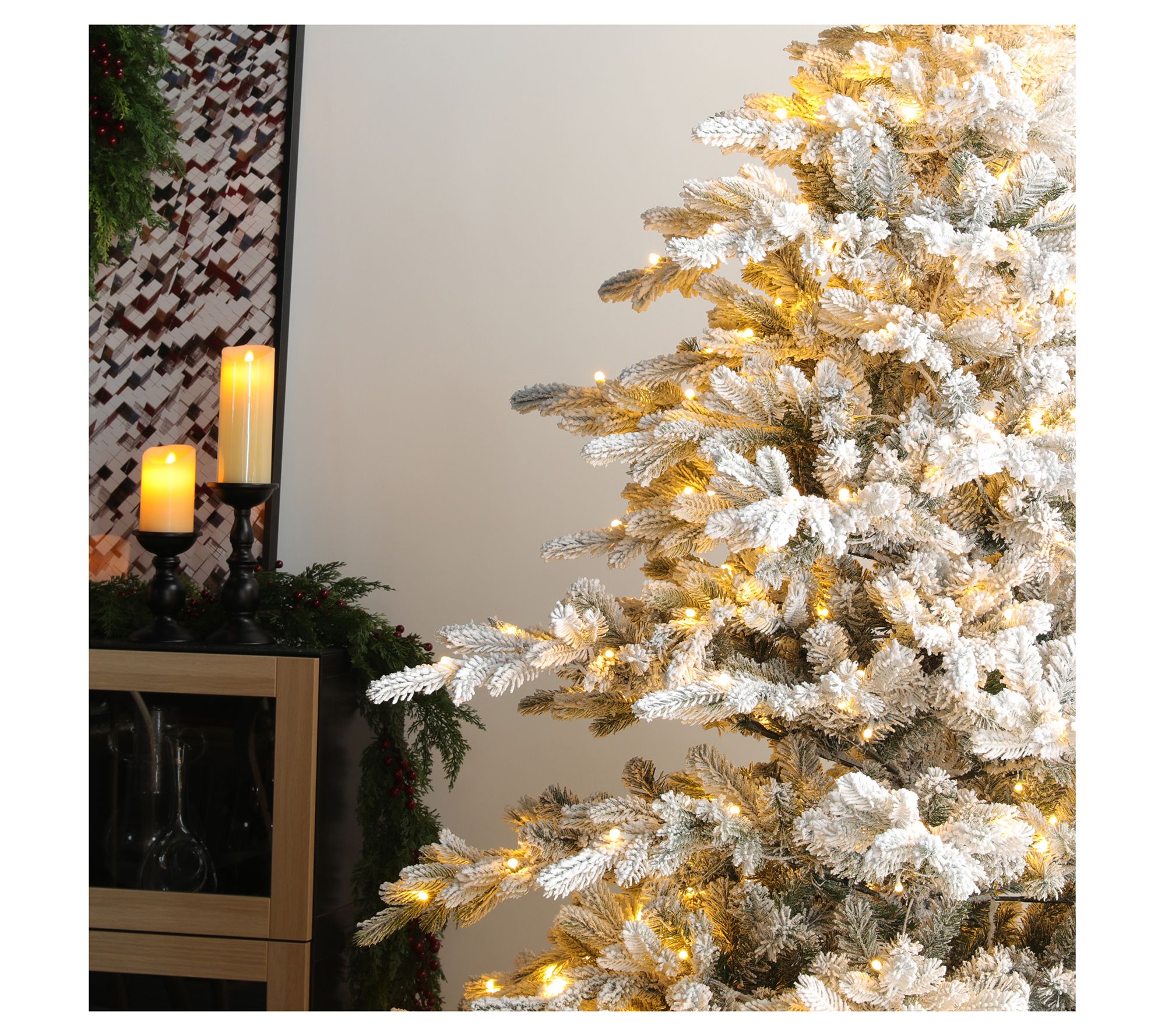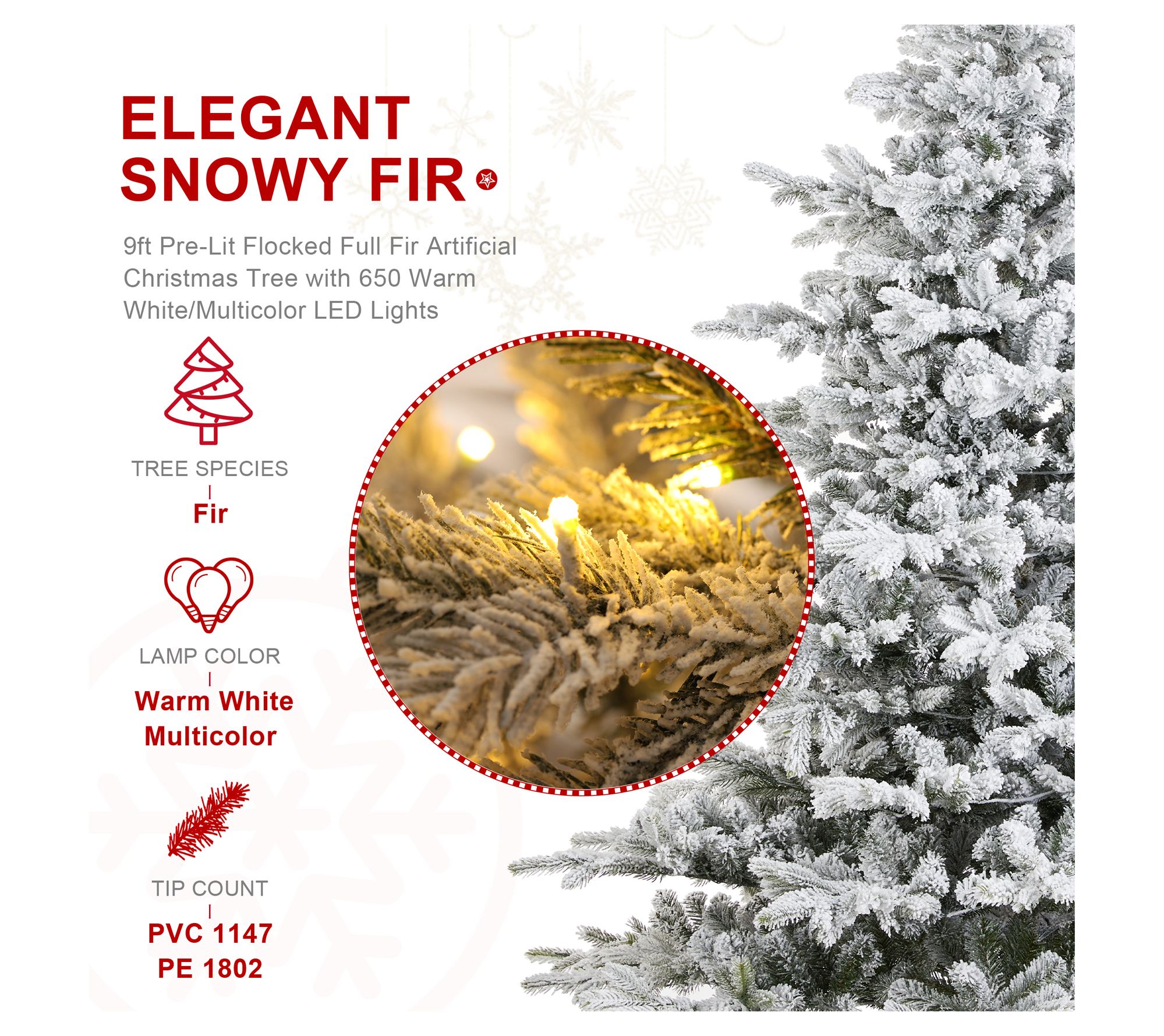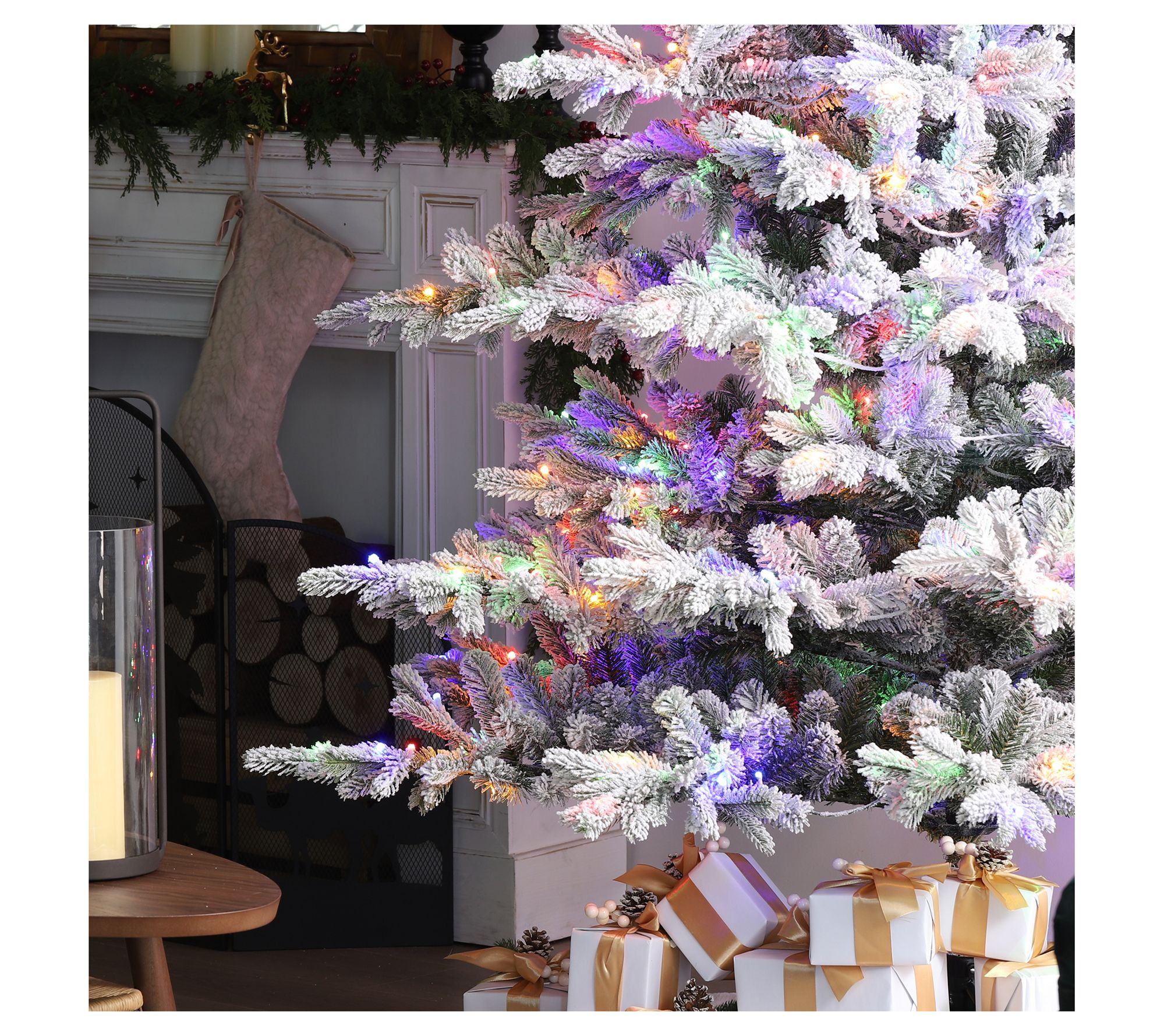 Transform your holiday space into a winter wonderland with this stunning flocked fir that effortlessly captures the magic of the season. Its lush faux branches and layered design offer a realistic appeal, making each day of your festivities unforgettable. The warm white and multicolor LED lights provide a gentle glow, illuminating gatherings and filling hearts with joy. Setup is made simple and quick, so you can focus on what truly matters -- enjoying precious moments with loved ones. From Glitzhome.