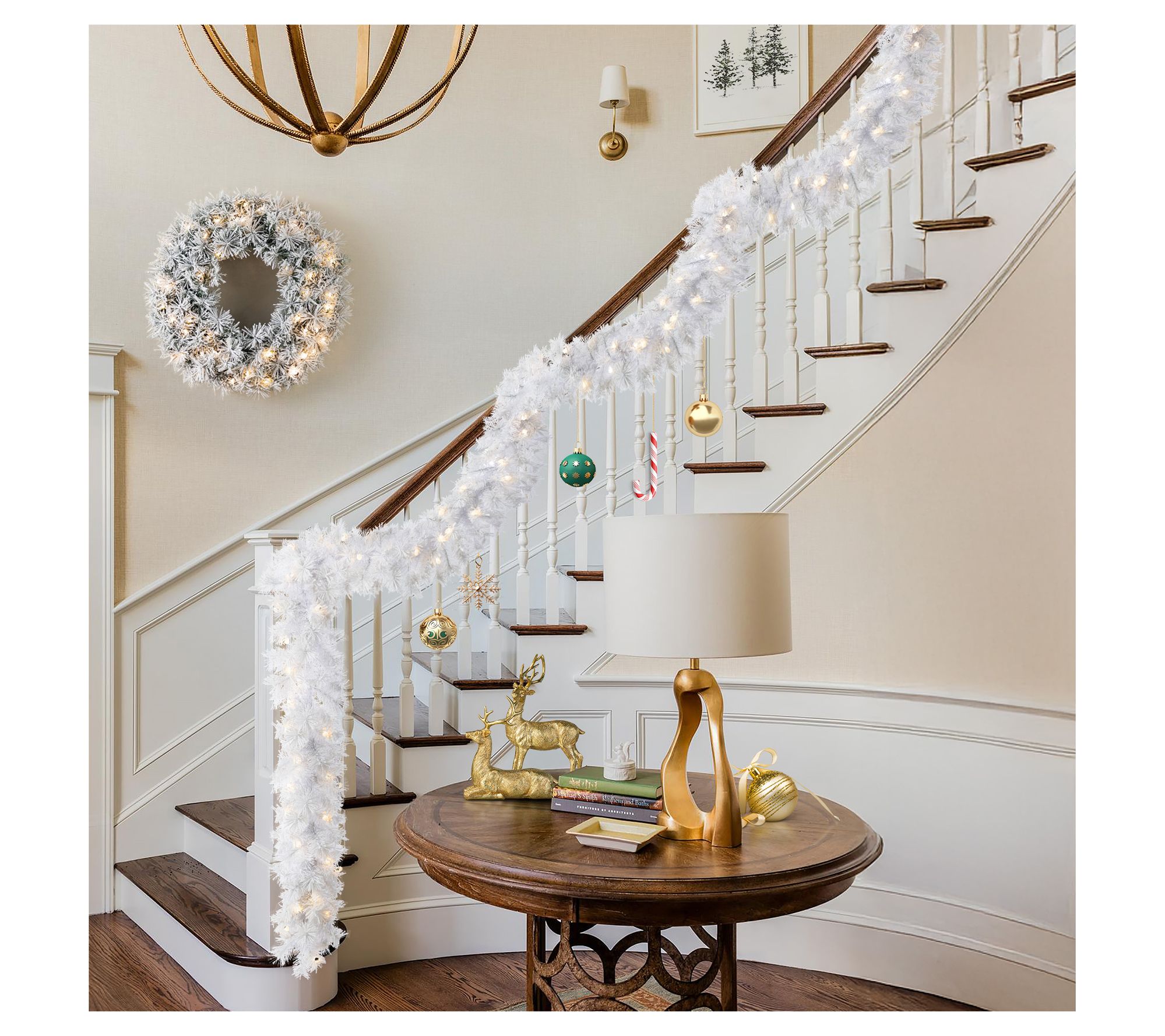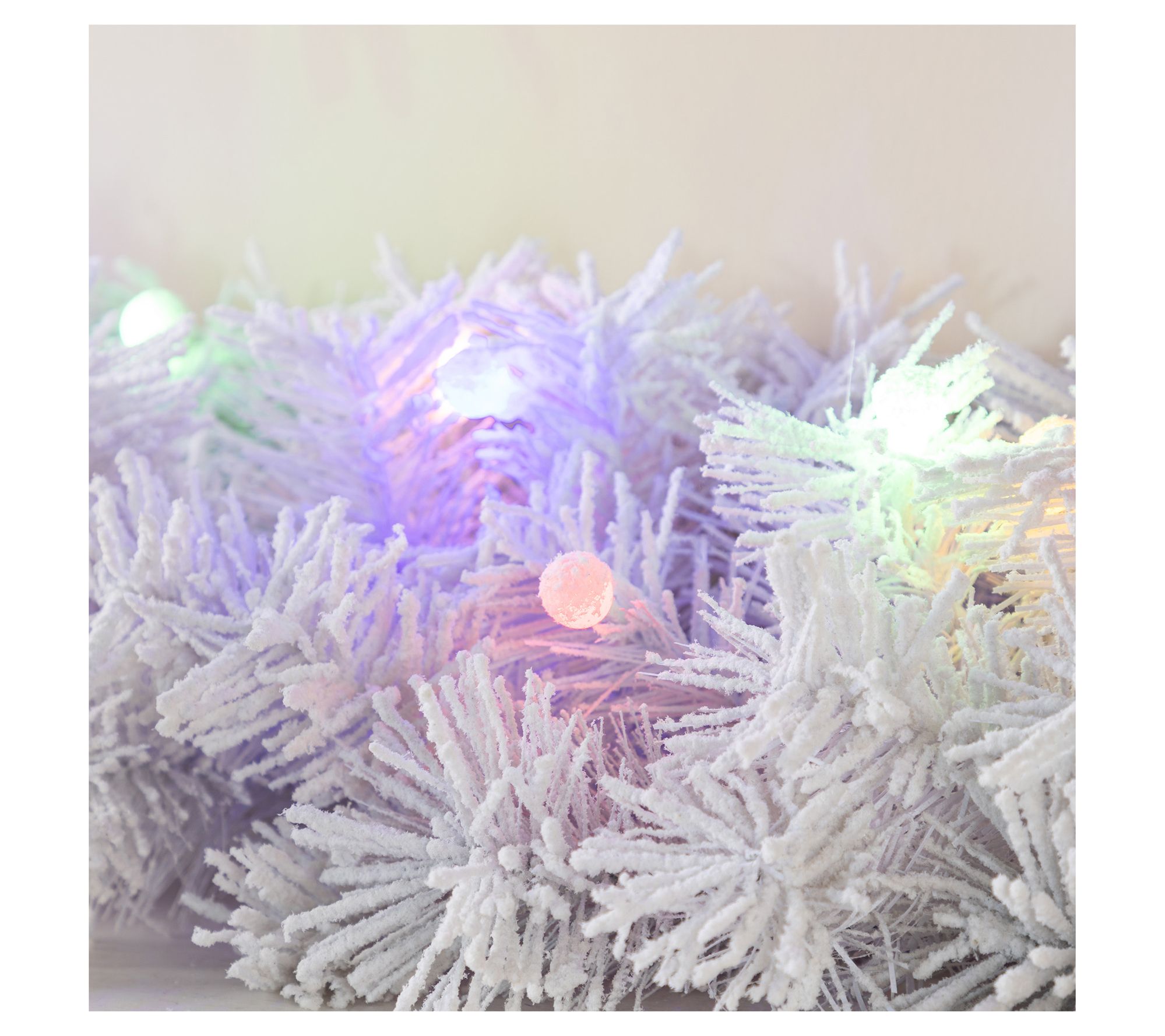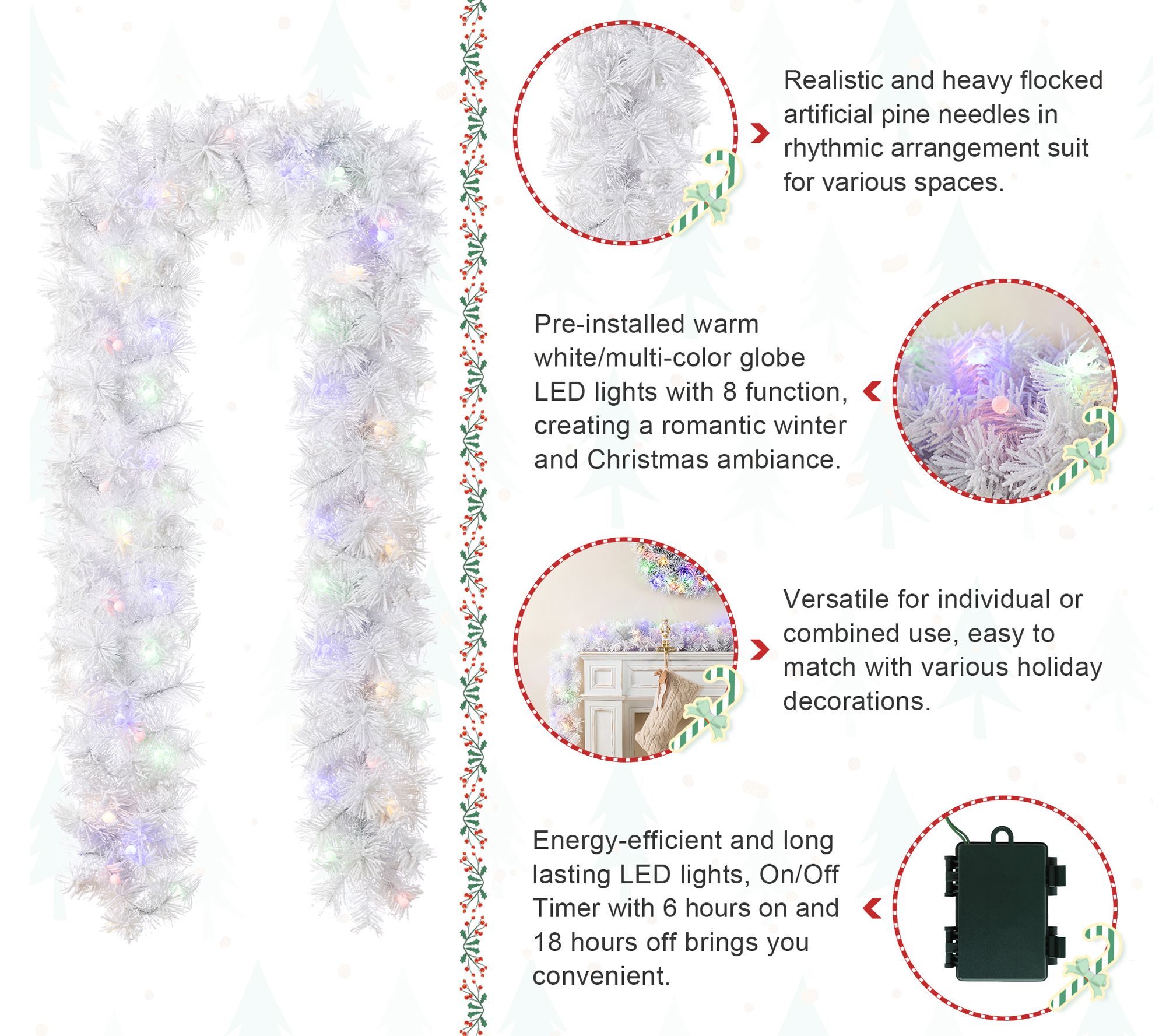 Transform your home into a winter wonderland with this festive snow-flocked white pine garland. Perfect for enhancing mantels or staircases, its pre-lit LED design provides a cozy glow throughout the holiday season. Create the holiday ambiance you've always envisioned by draping this charming accessory in various spaces around your home. From Glitzhome.