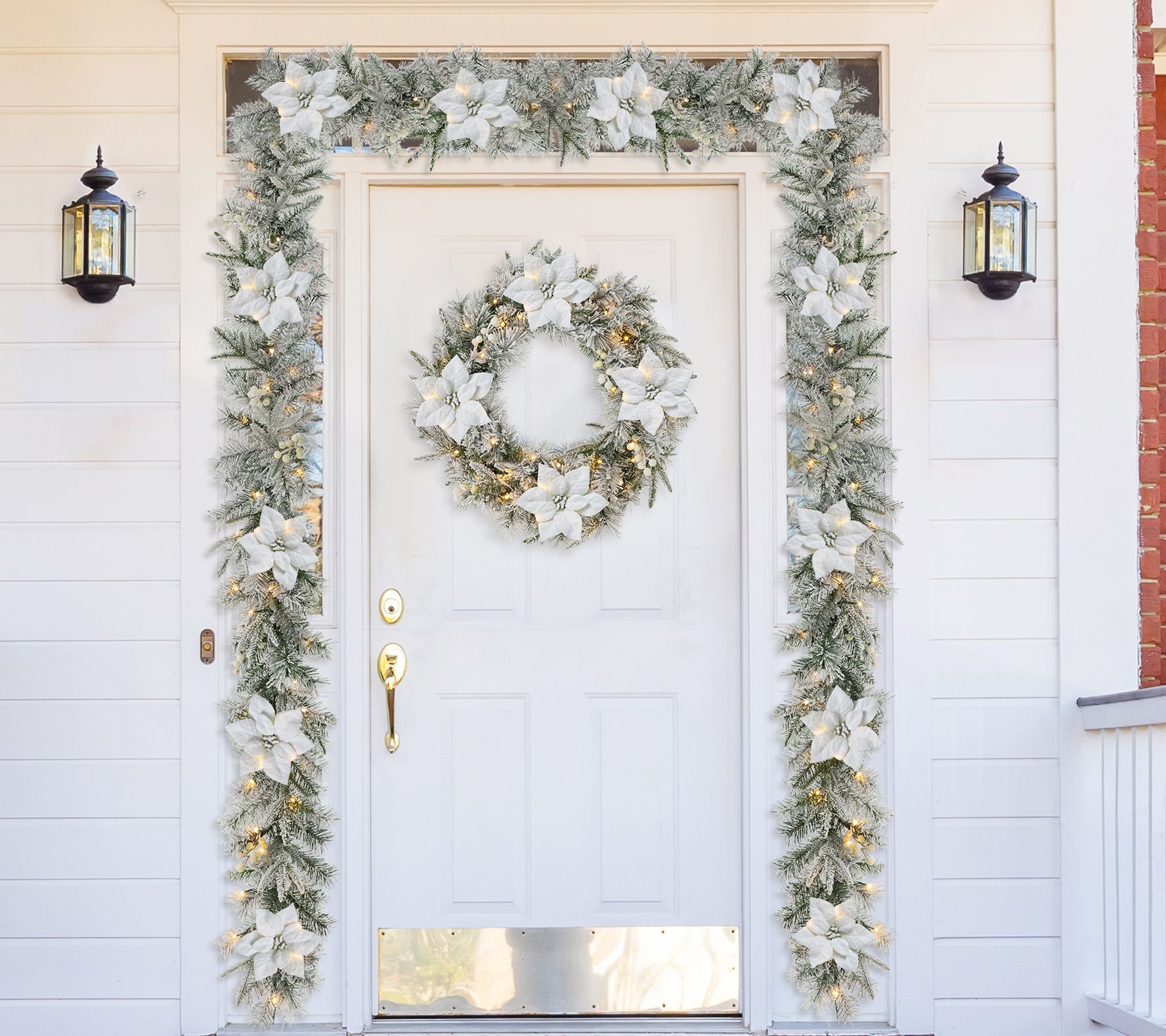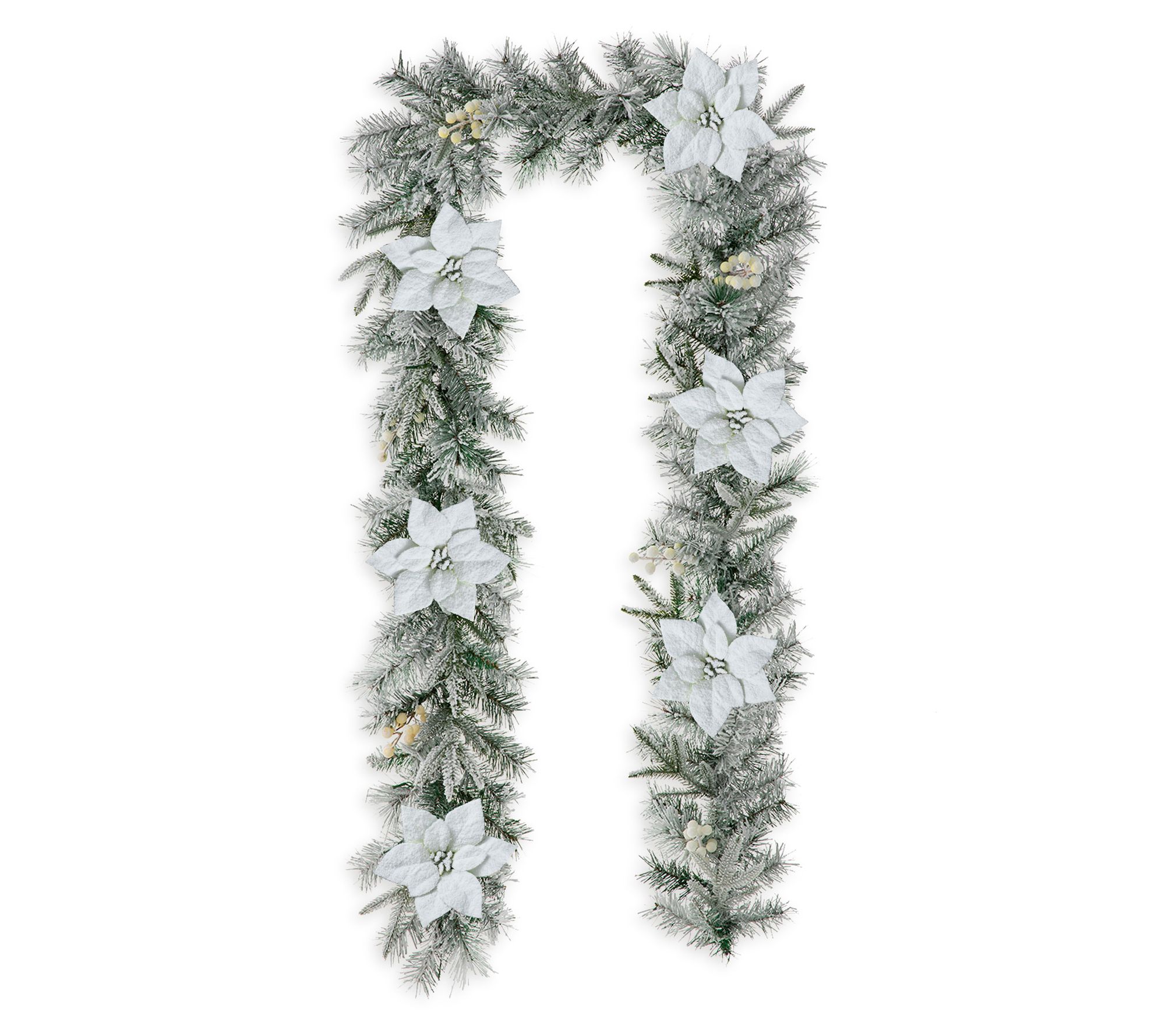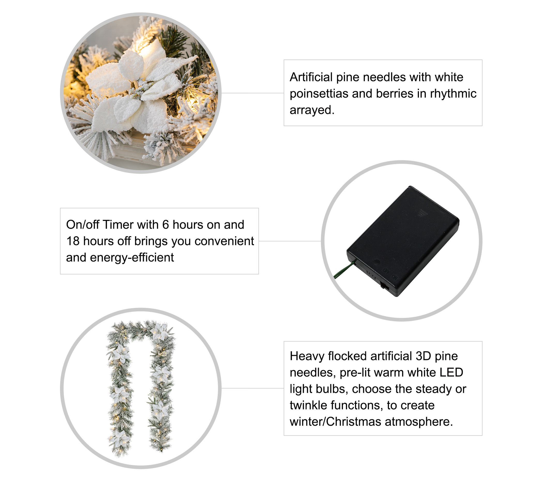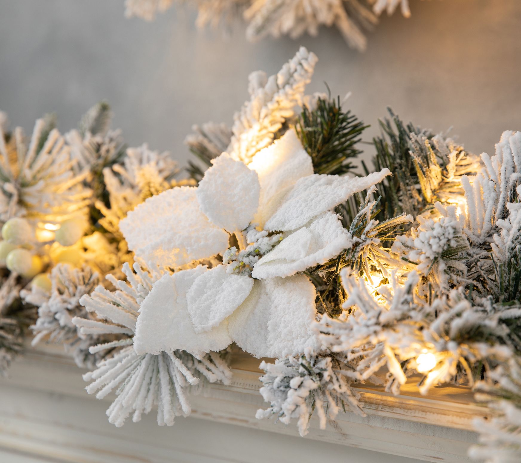Spread good tidings throughout your home by hanging this snowy garland along your bannister or your mantel. Featuring a bevy of twinkling lights and realistic poinsettia accents, it adds a touch of merriment and soft illumination wherever you place it. From Glitzhome.
