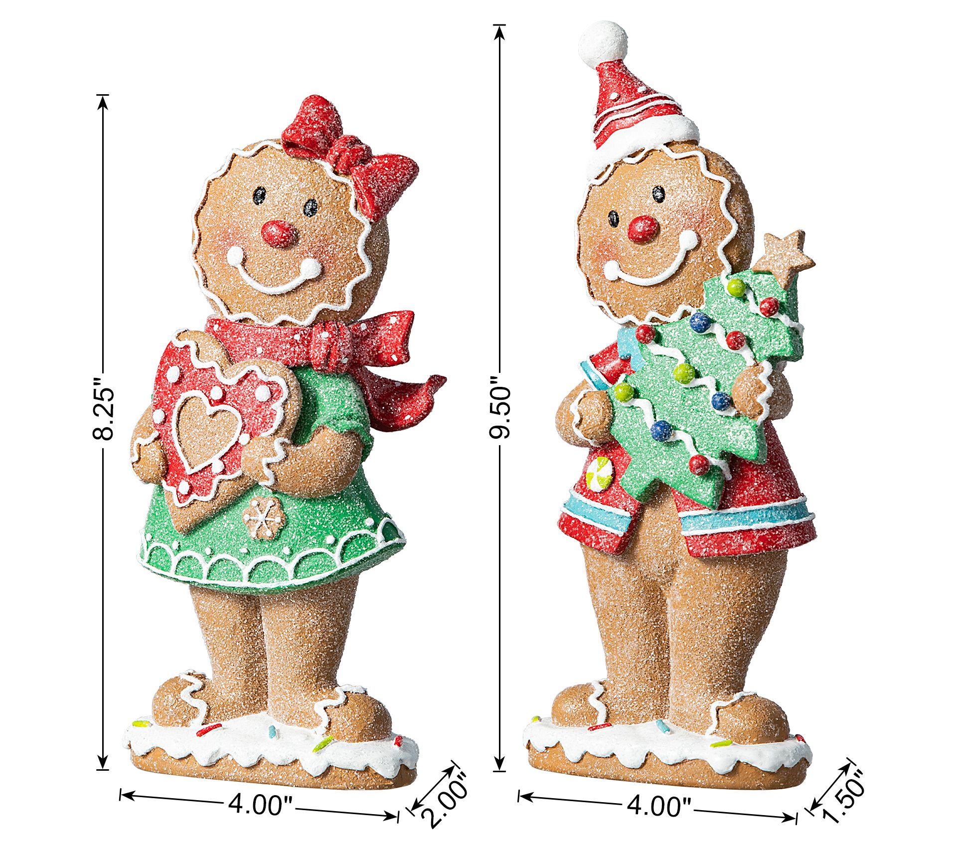• Approximate measurements: Gingerbread figure 1 4"L x 2"W x 8.25"H; Gingerbread figure 2 4"L x 1.5"W x 9.5"H
