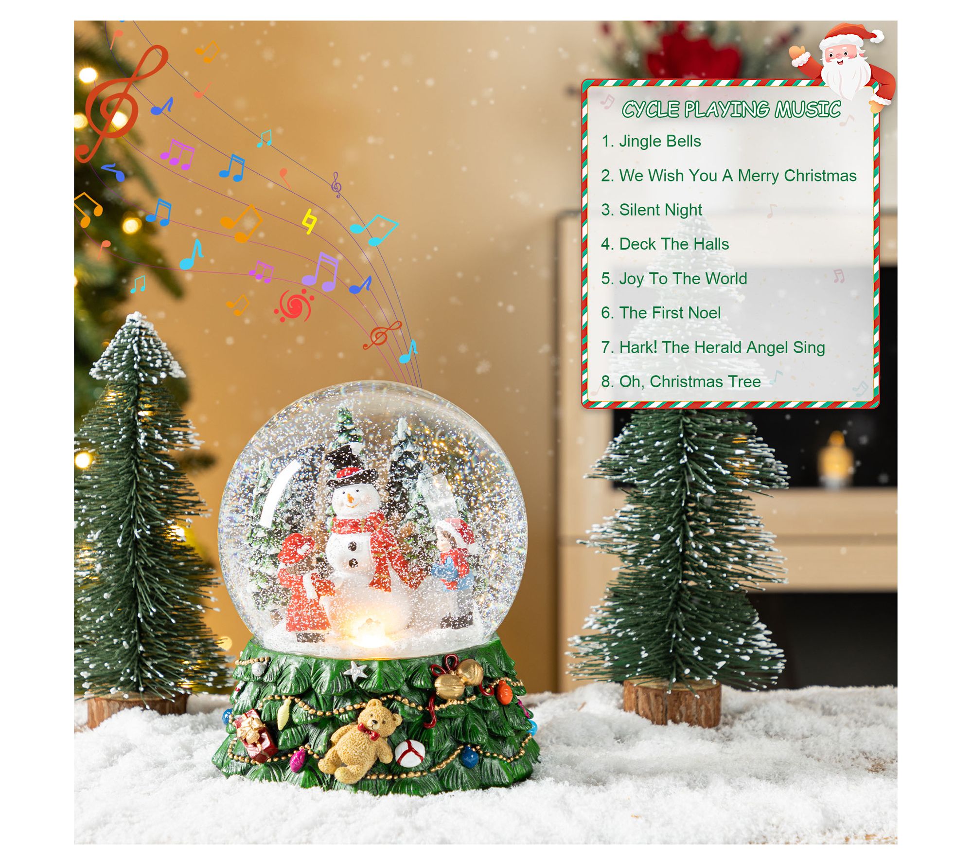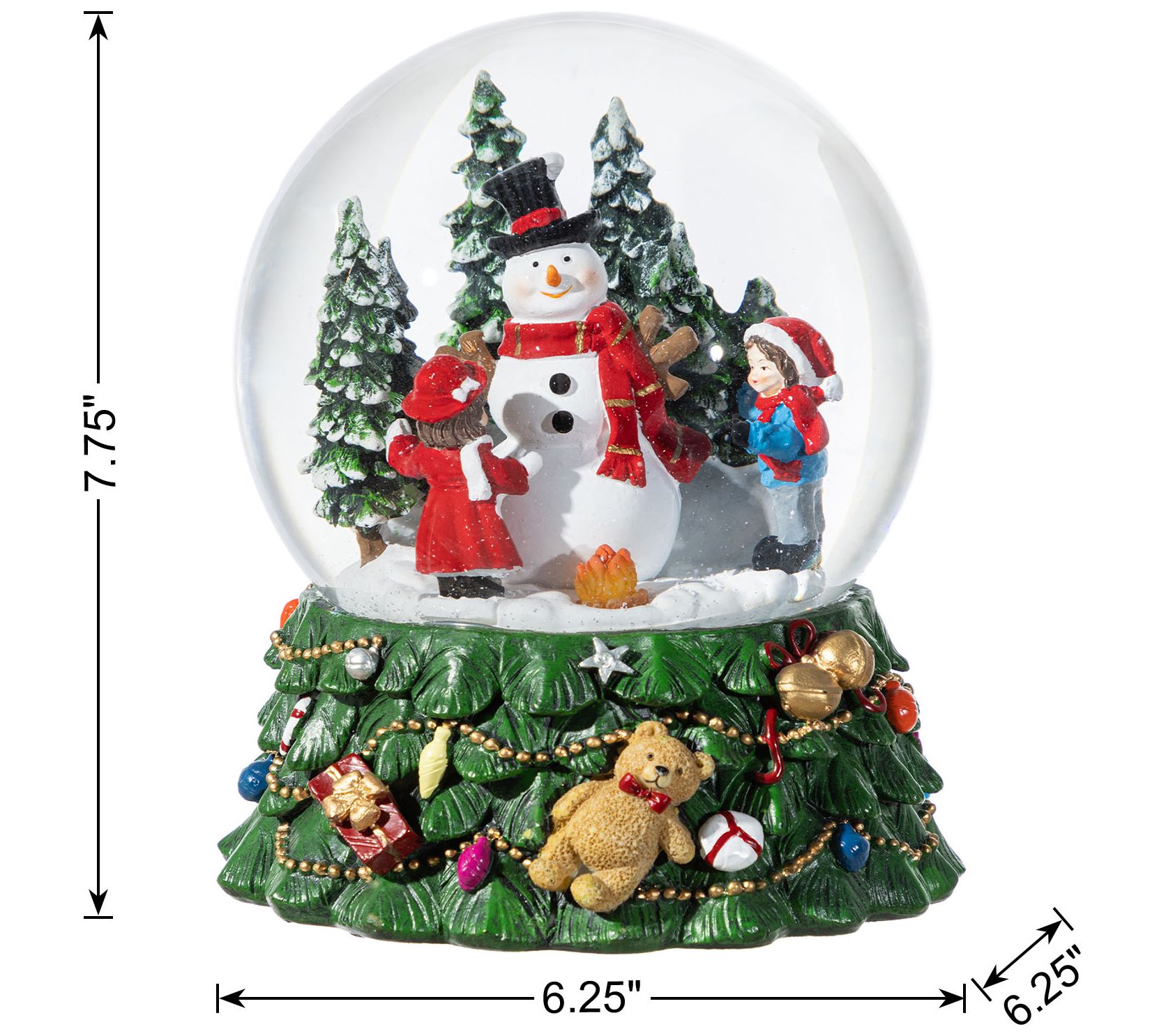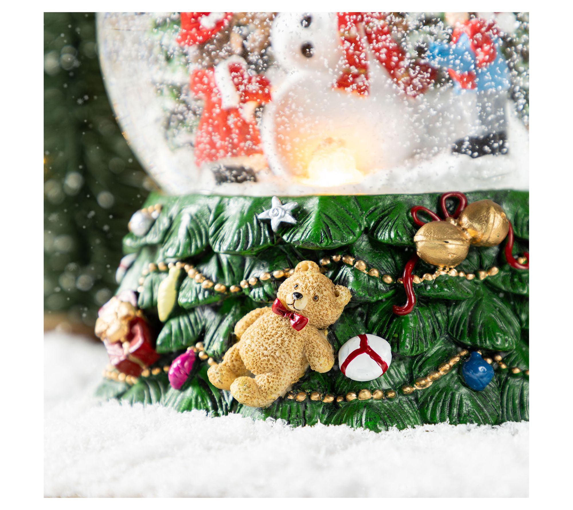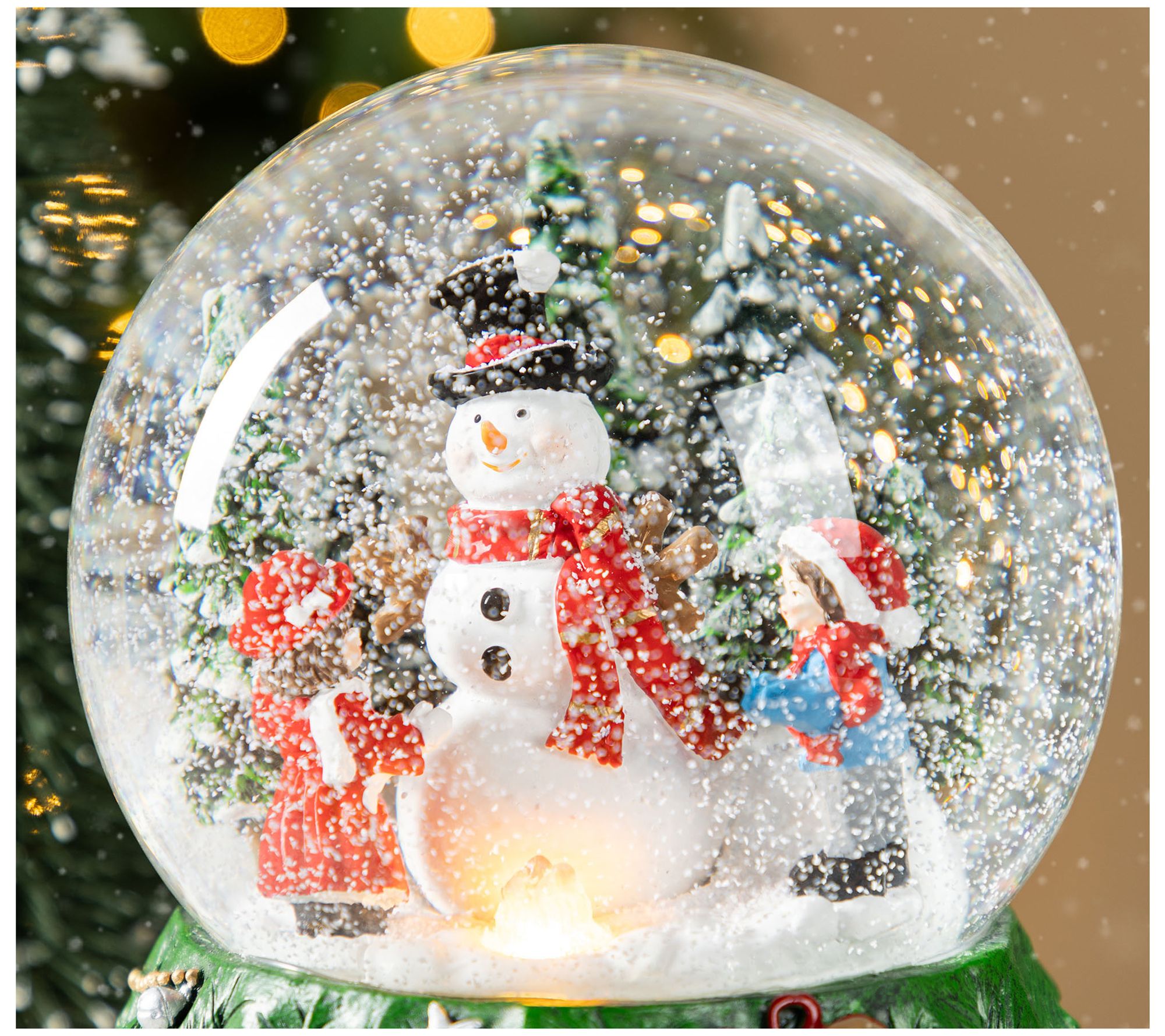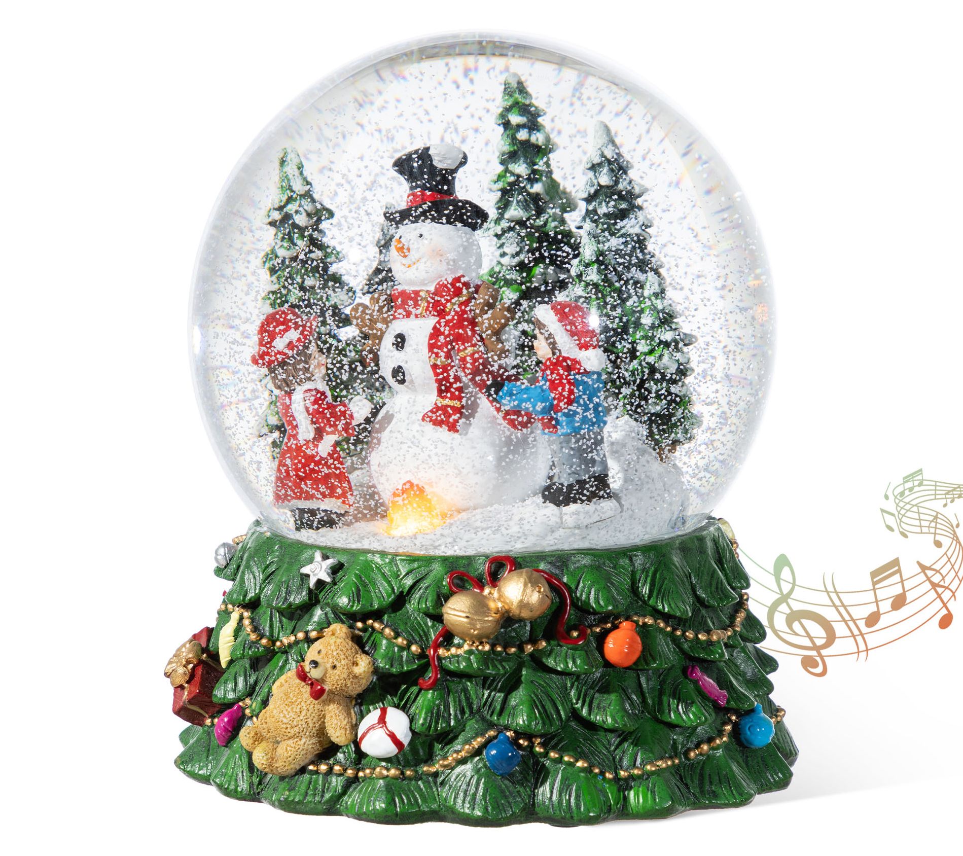 This charming globe reveals a playful snowman surrounded by children, captivated by a flurry of shimmering snow. Nestled on a vibrant base adorned with teddy bears and ornaments, it doubles as a melody-maker, playing joyful seasonal tunes. Perfect for adding festive magic to any table or shelf, this decoration radiates warmth with its LED feature and is sure to bring smiles to your holiday gatherings. From Glitzhome.