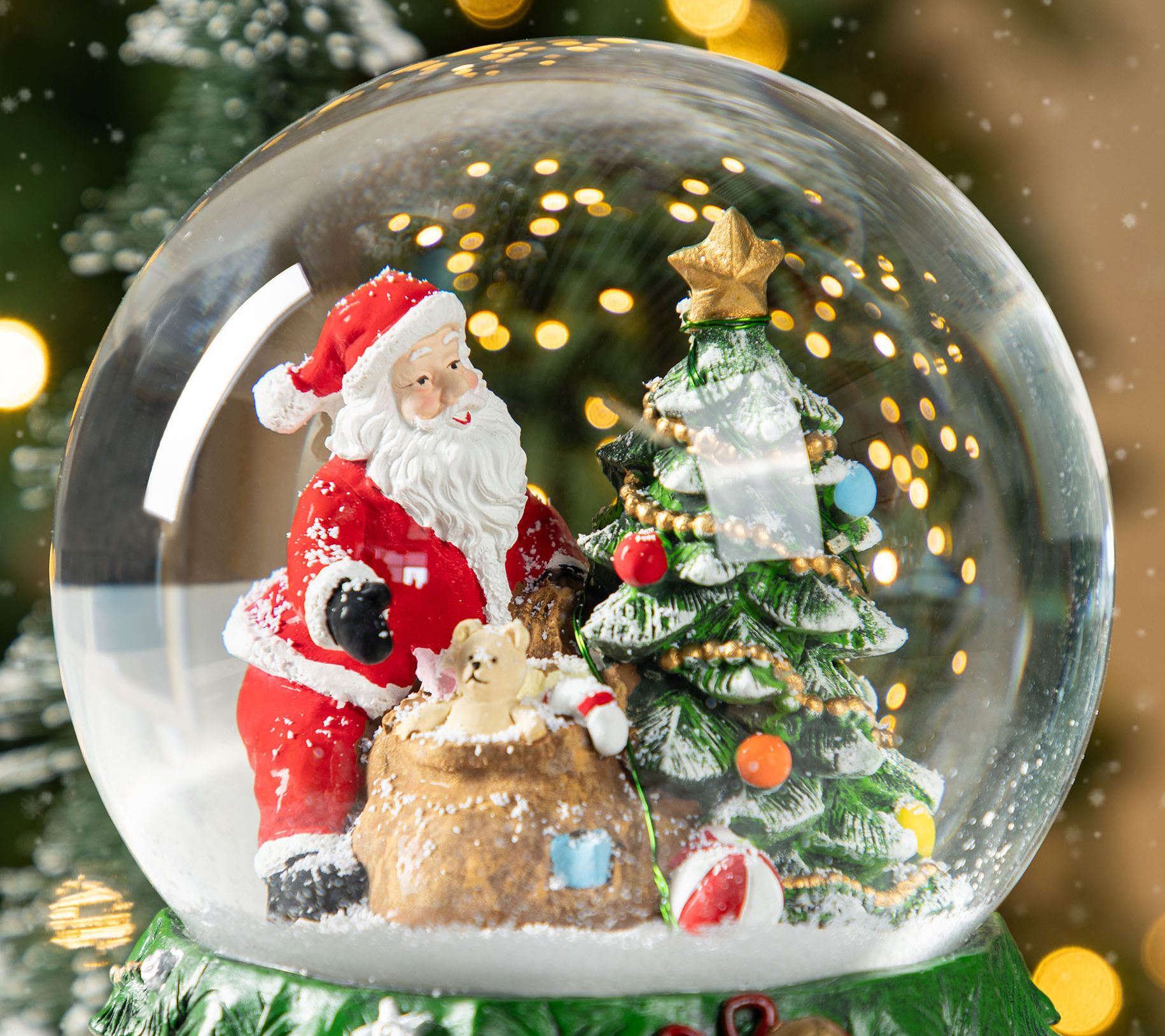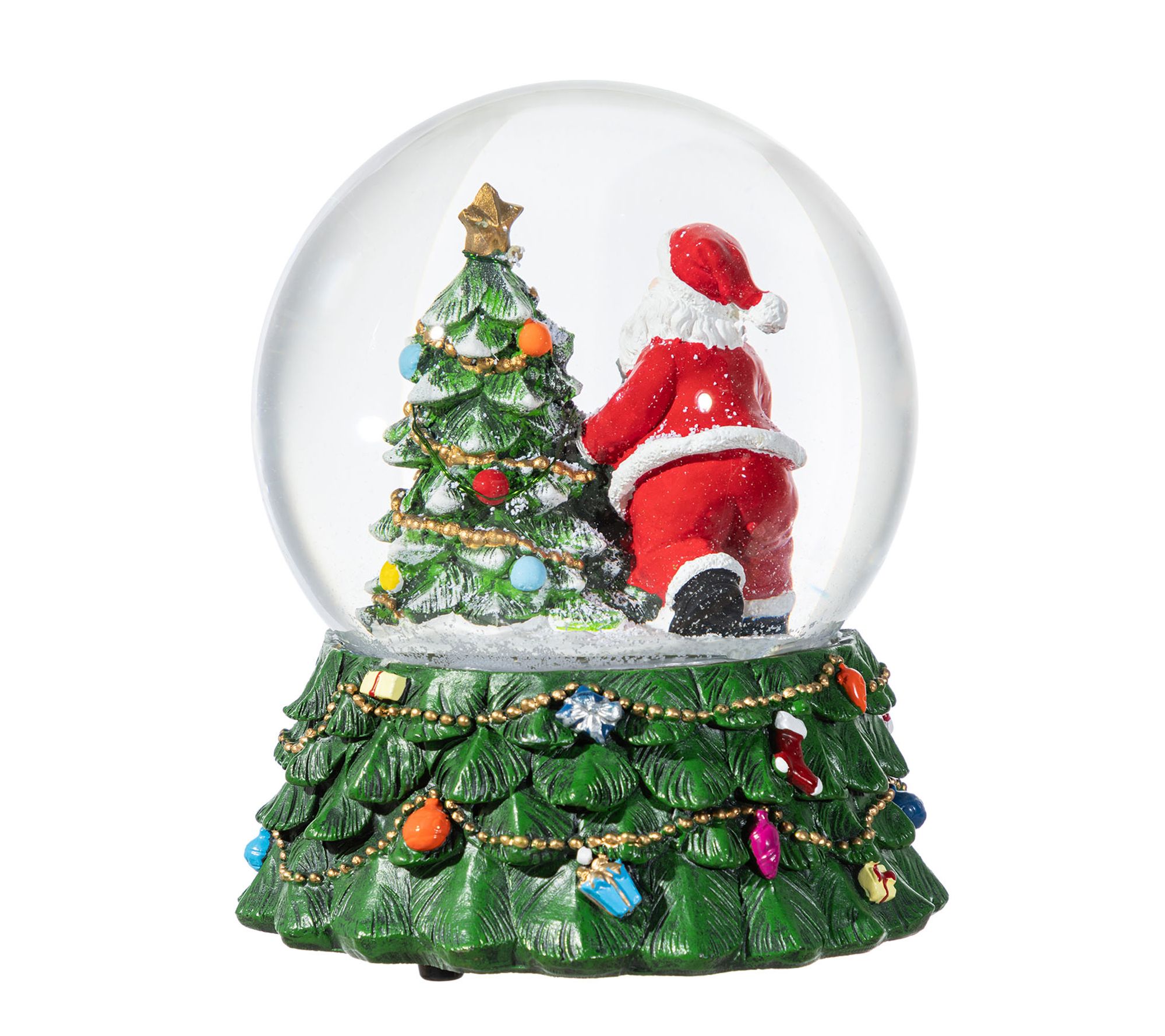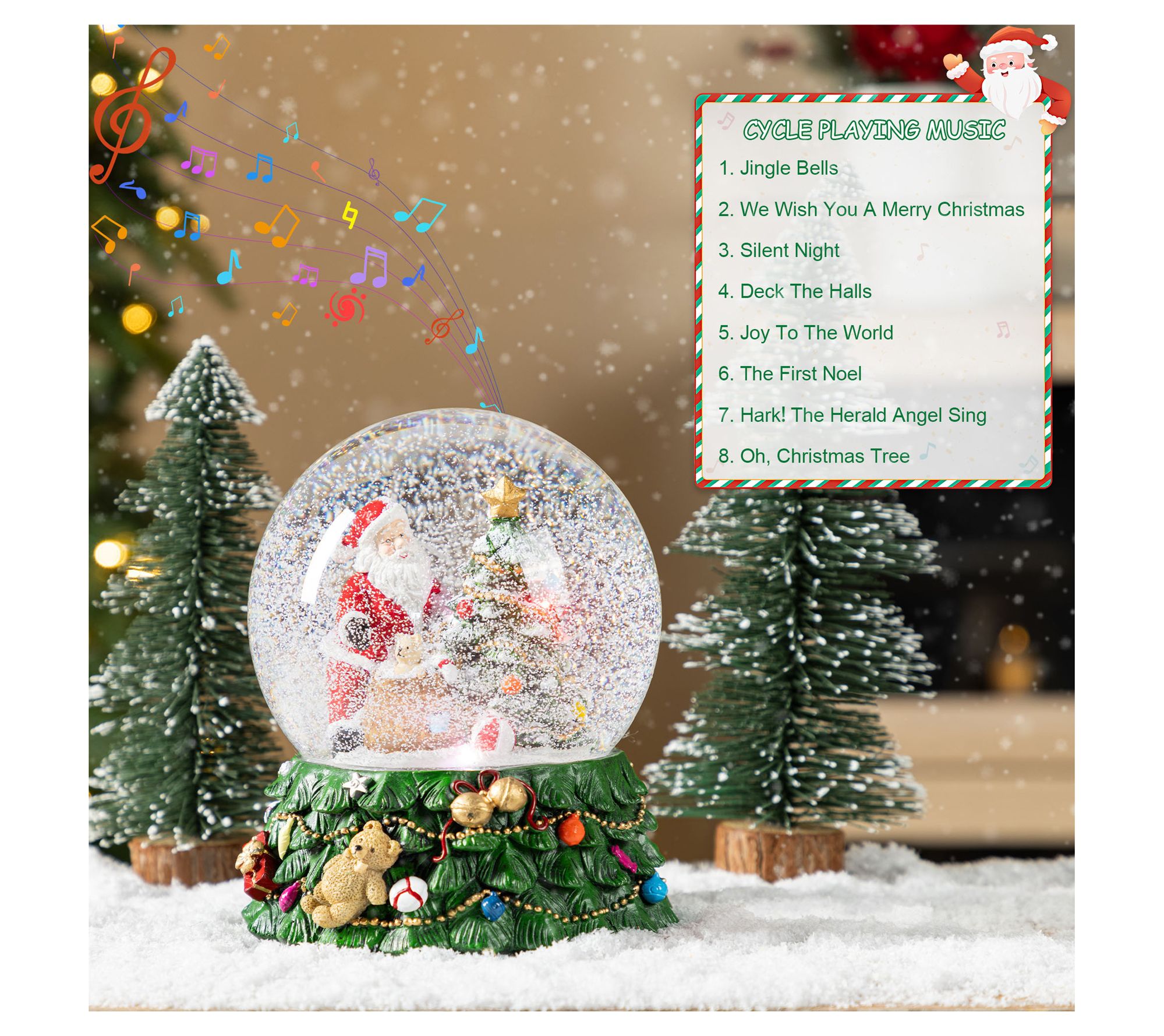 Transform your living space into a winter wonderland with a touch of musical magic. This delightful snow globe features Santa Claus beside a charmingly decorated Christmas tree, all within a glistening dome that swirls with glitter. Perched on a cheery base embellished with ornaments and a teddy bear, it plays eight classic carols, bringing the sound of the season into your home. Perfect for a mantel or tabletop display, this piece captures the spirit of the holidays. From Glitzhome.