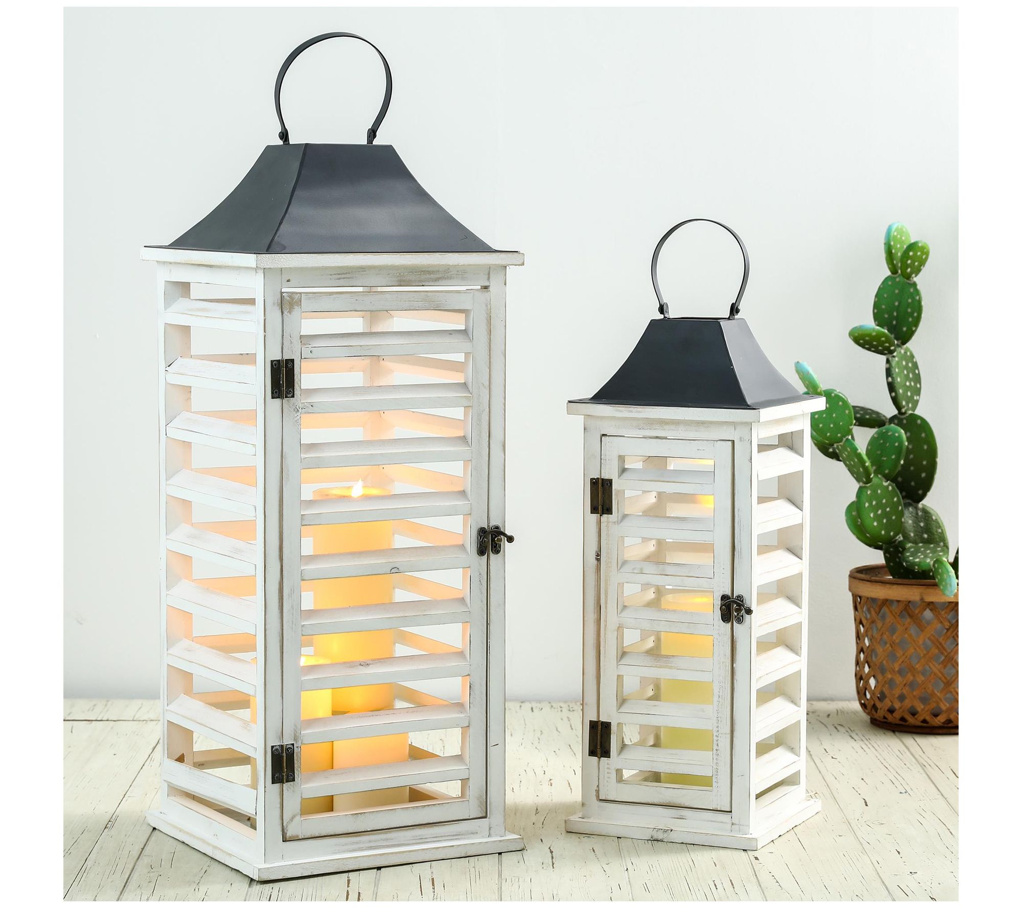 Inspired by plantation shutters, this set of distressed Contempo lanterns brings warmth and charm into any room of your home. From Glitzhome.