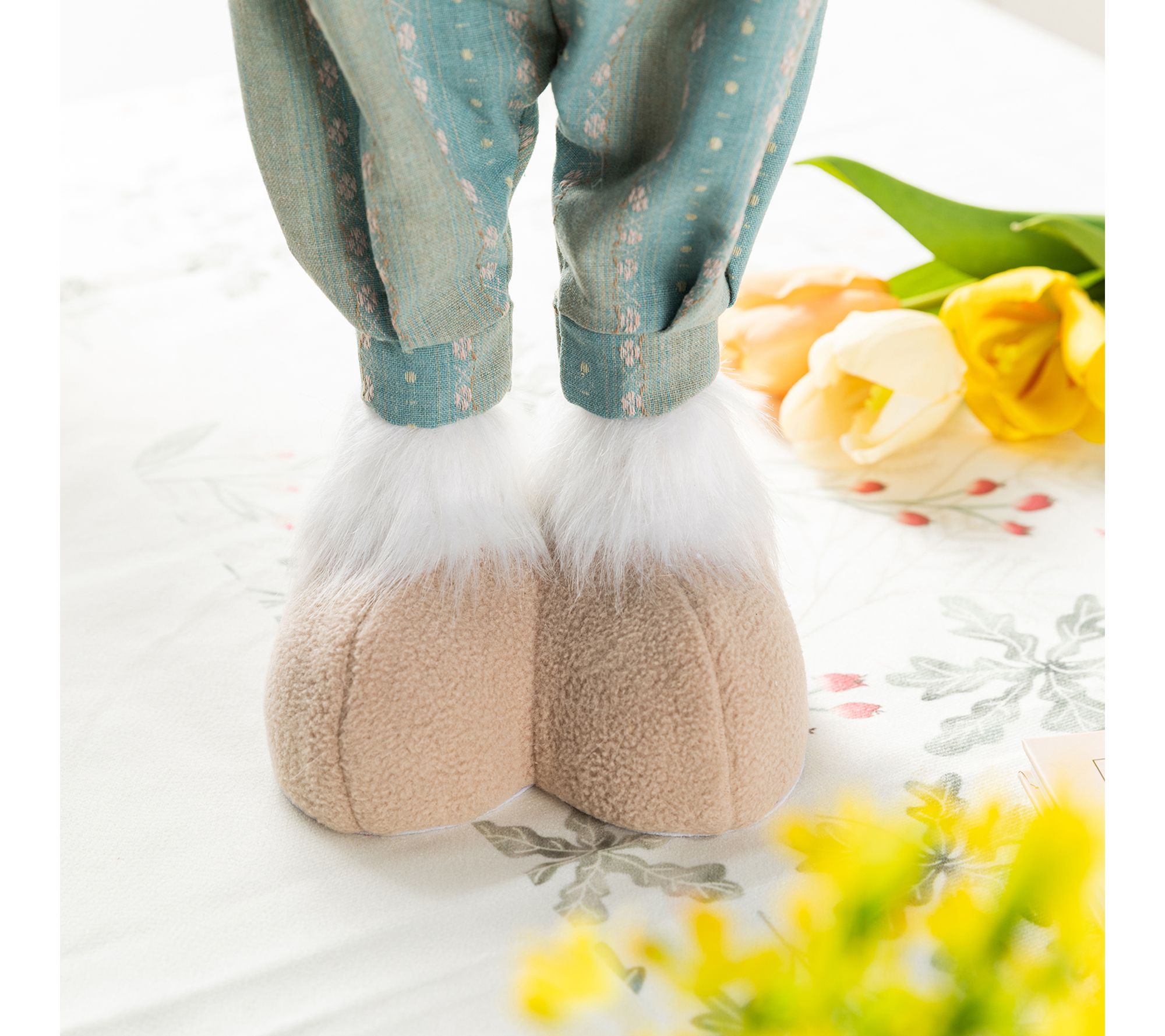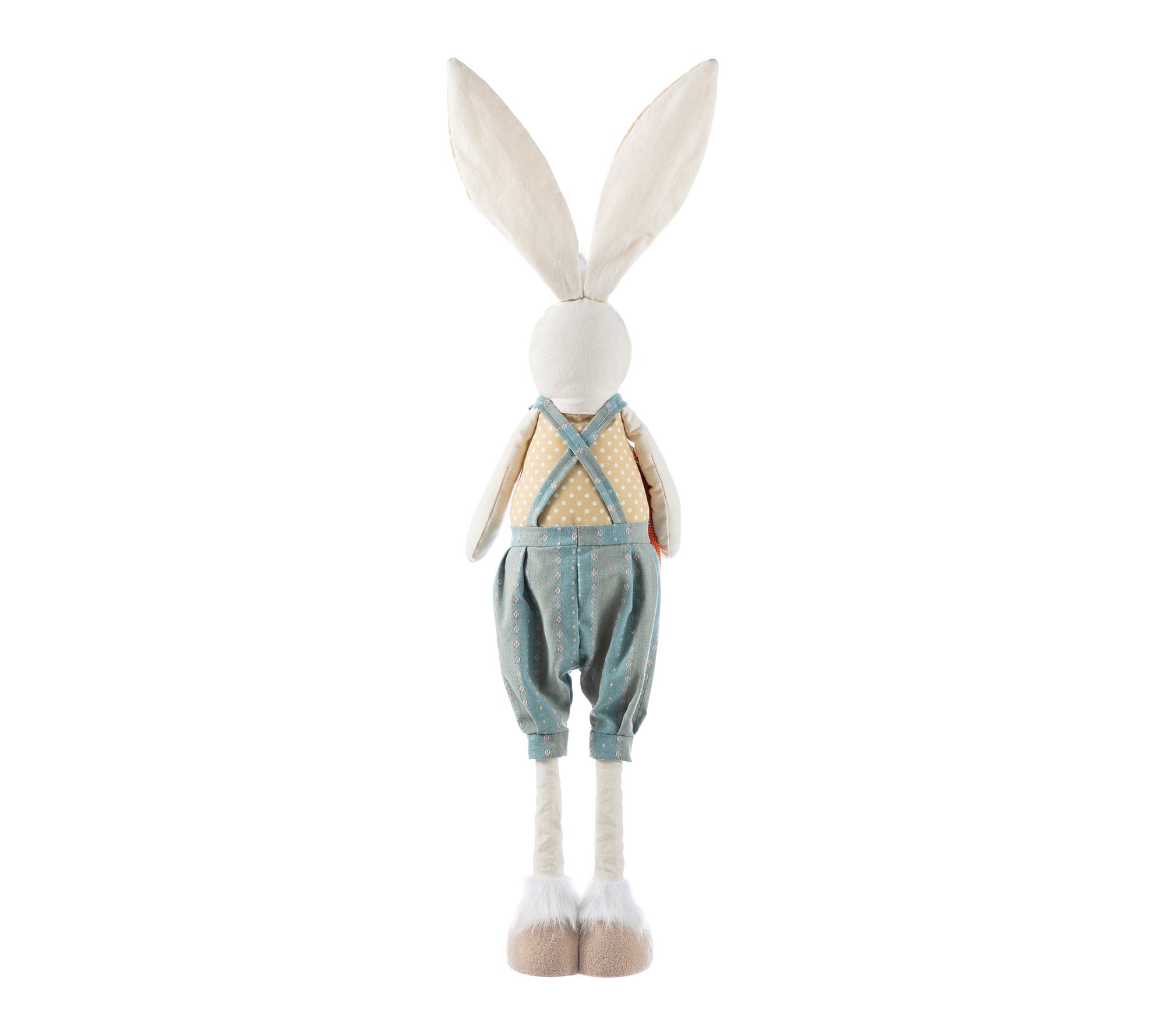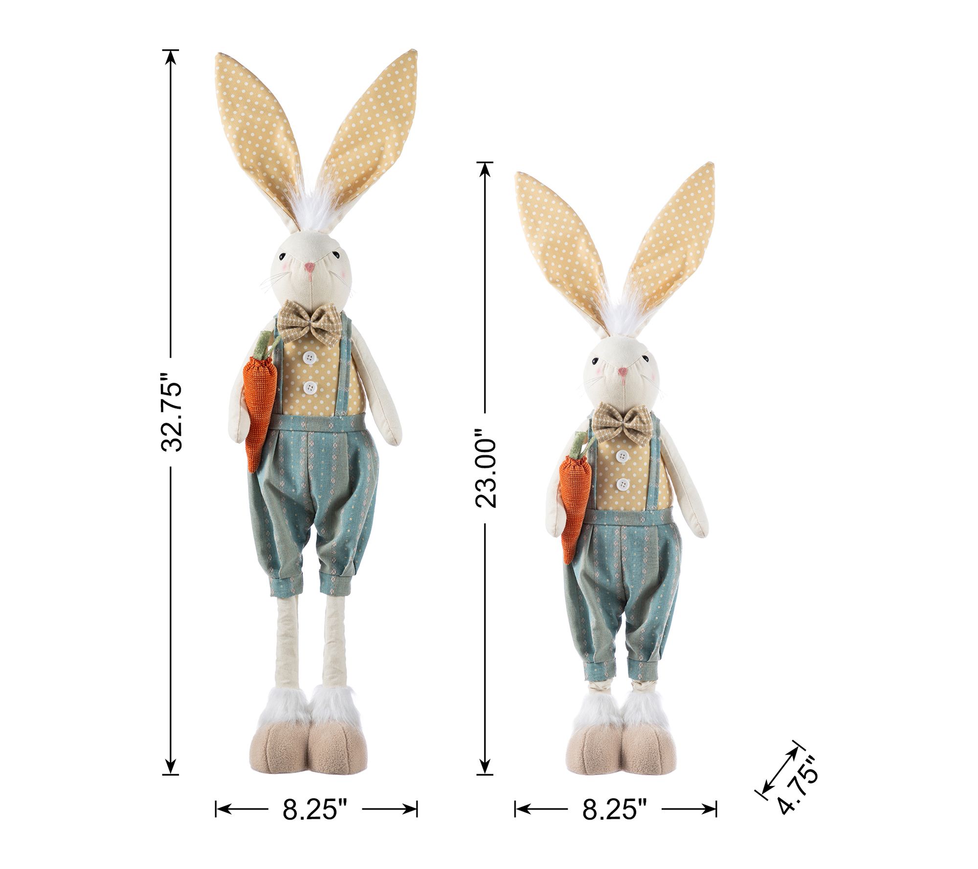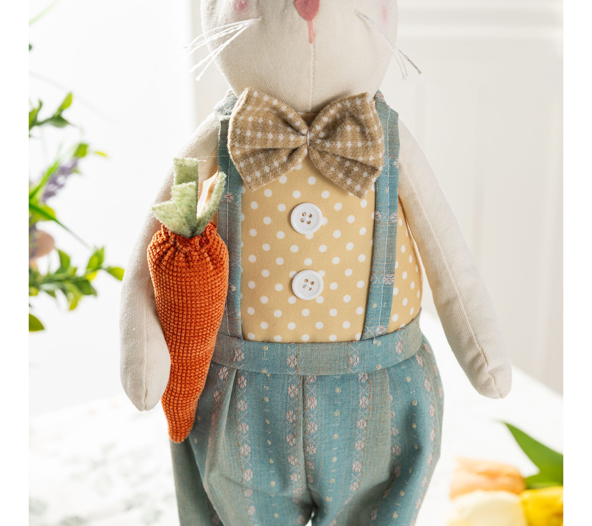 Welcome spring with this whimsical Easter fabric bunny figurine, designed to bring playful charm to your seasonal displays. Dressed in cheerful yellow and blue attire with a polka dot top, patterned overalls, and bow tie, this adorable bunny holds a carrot and features telescoping legs for customizable height. Add a fresh, festive vibe to your entryway or mantle with this delightful decoration. From Glitzhome.