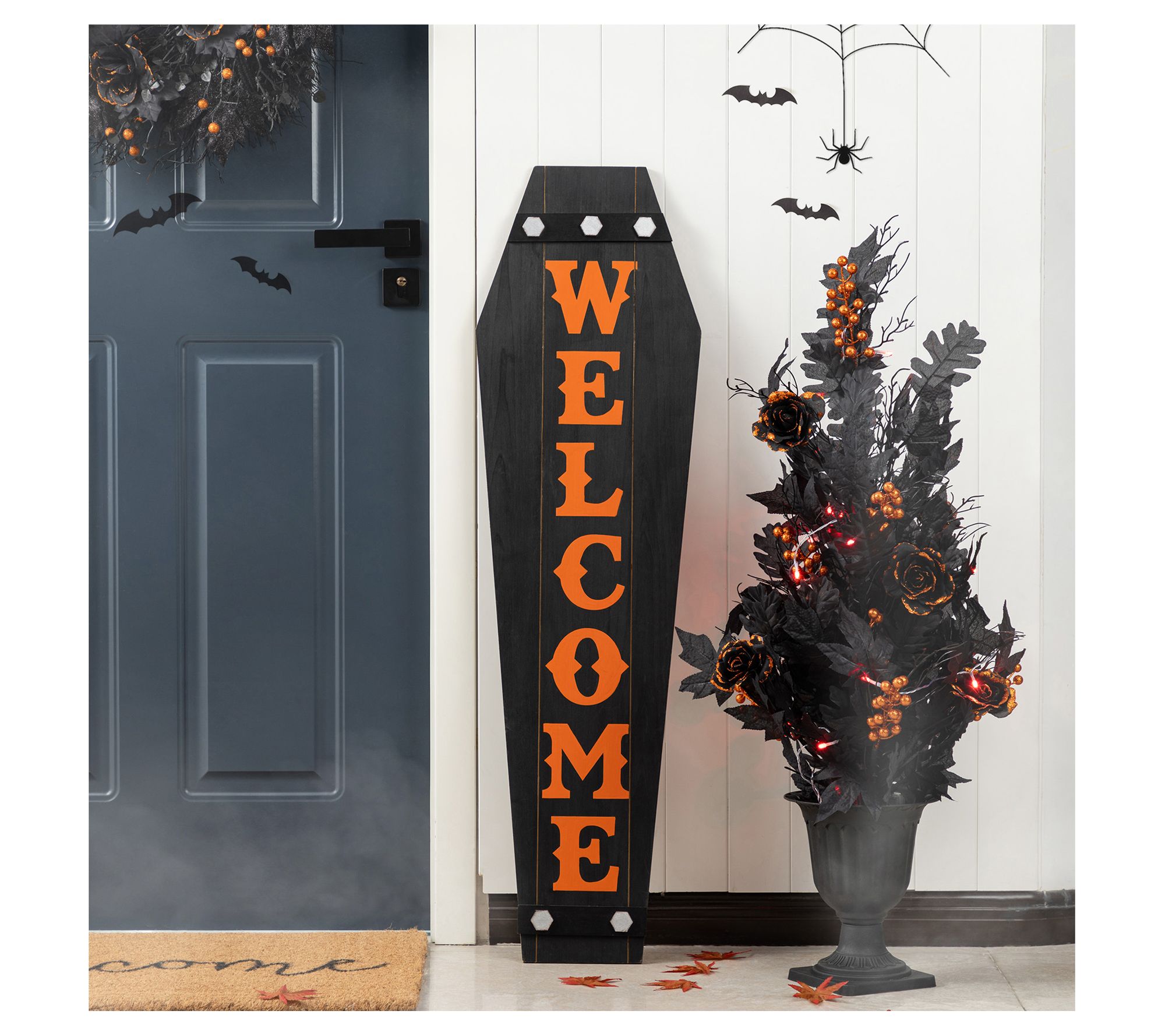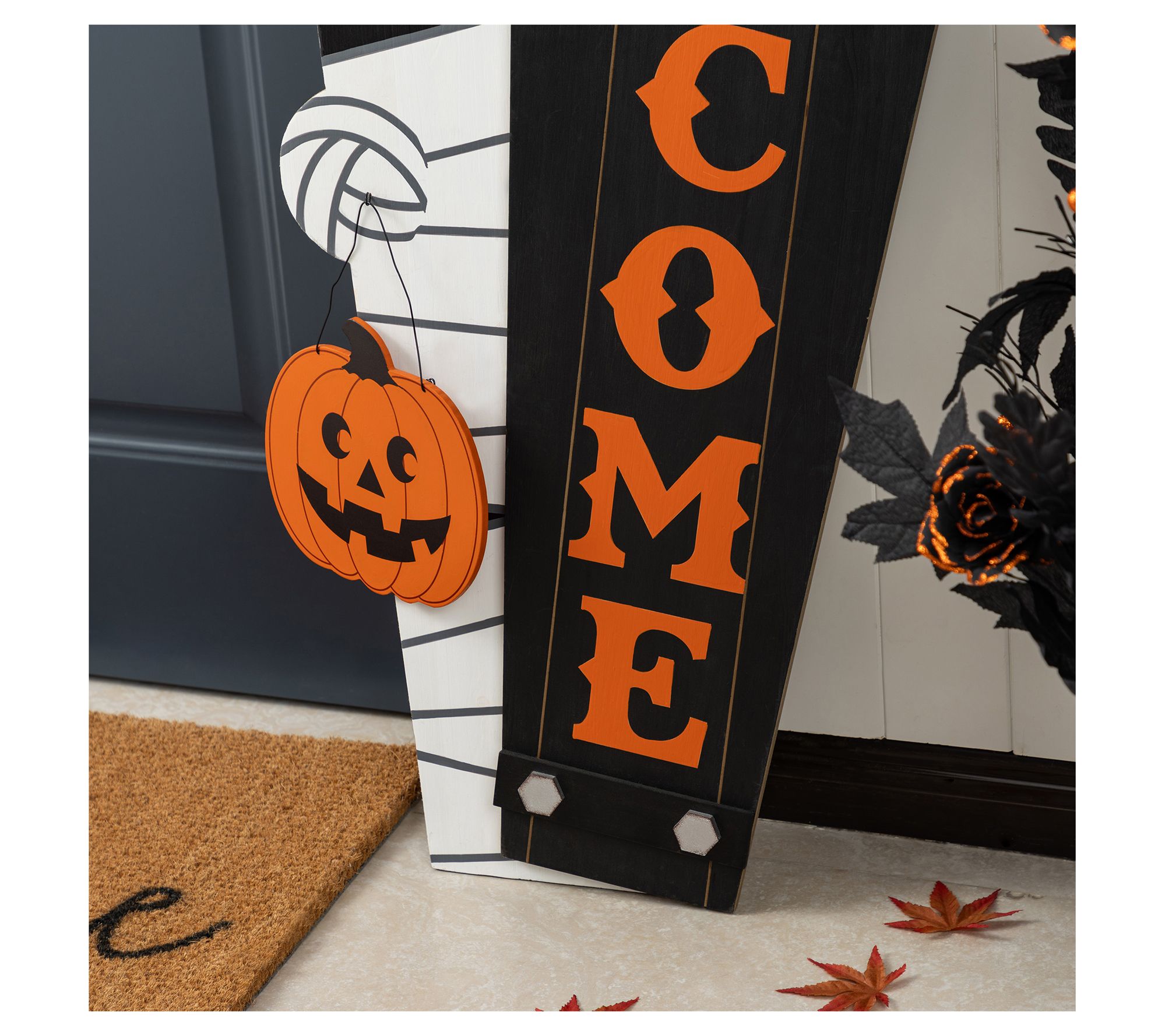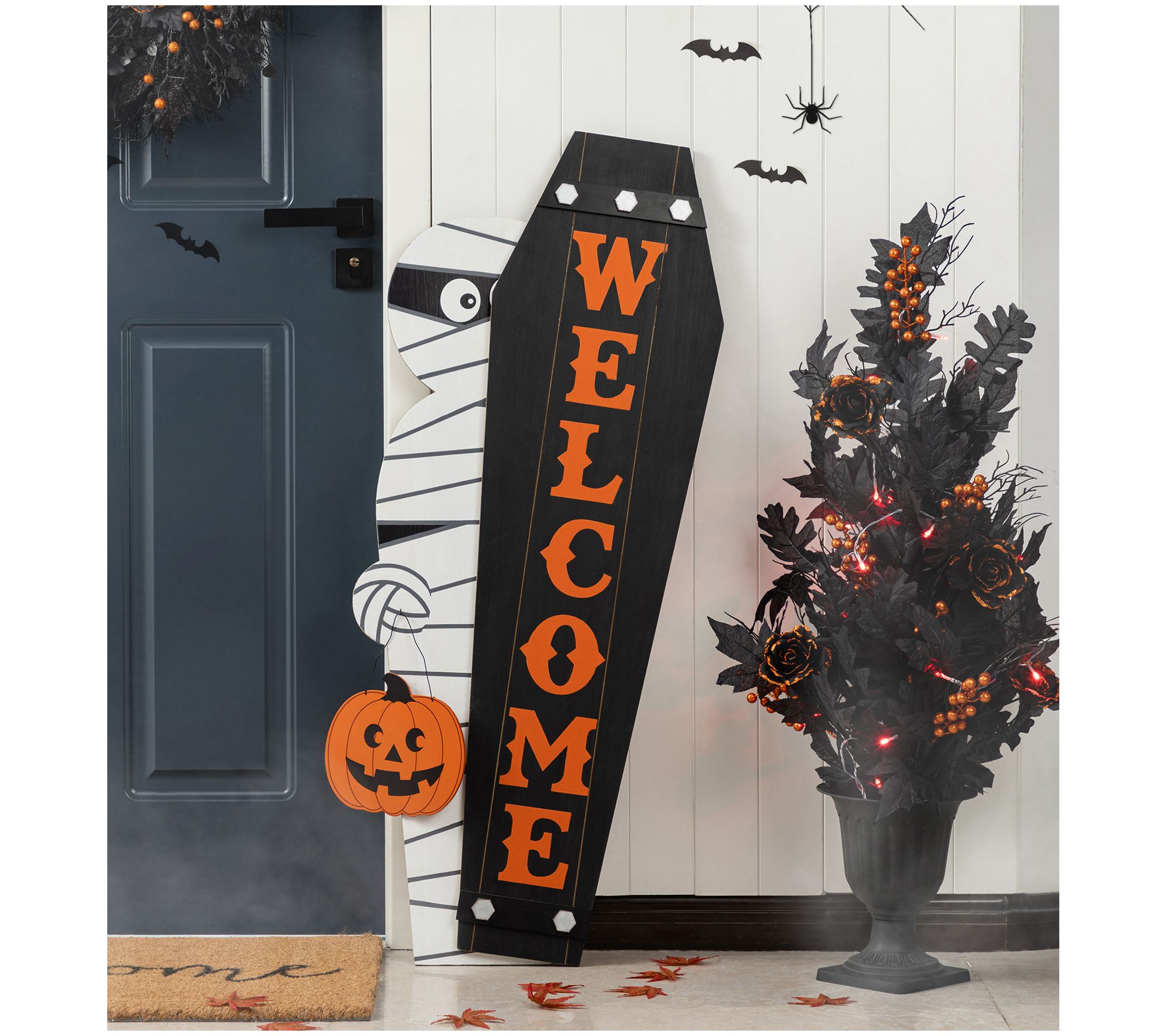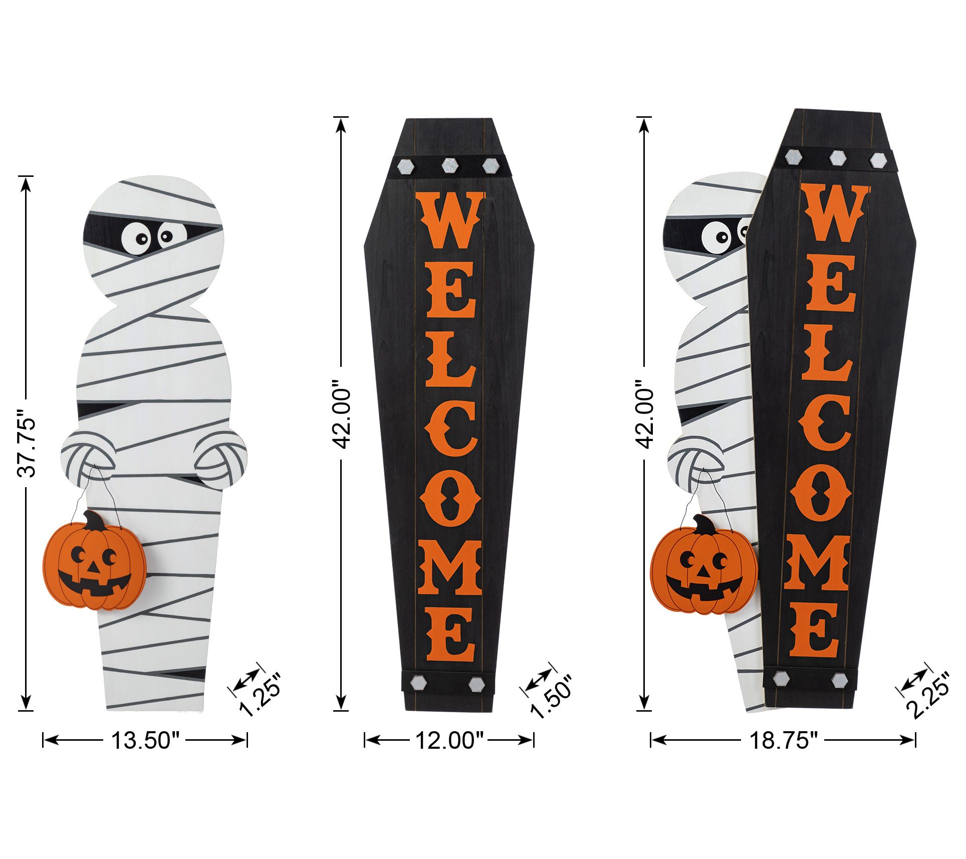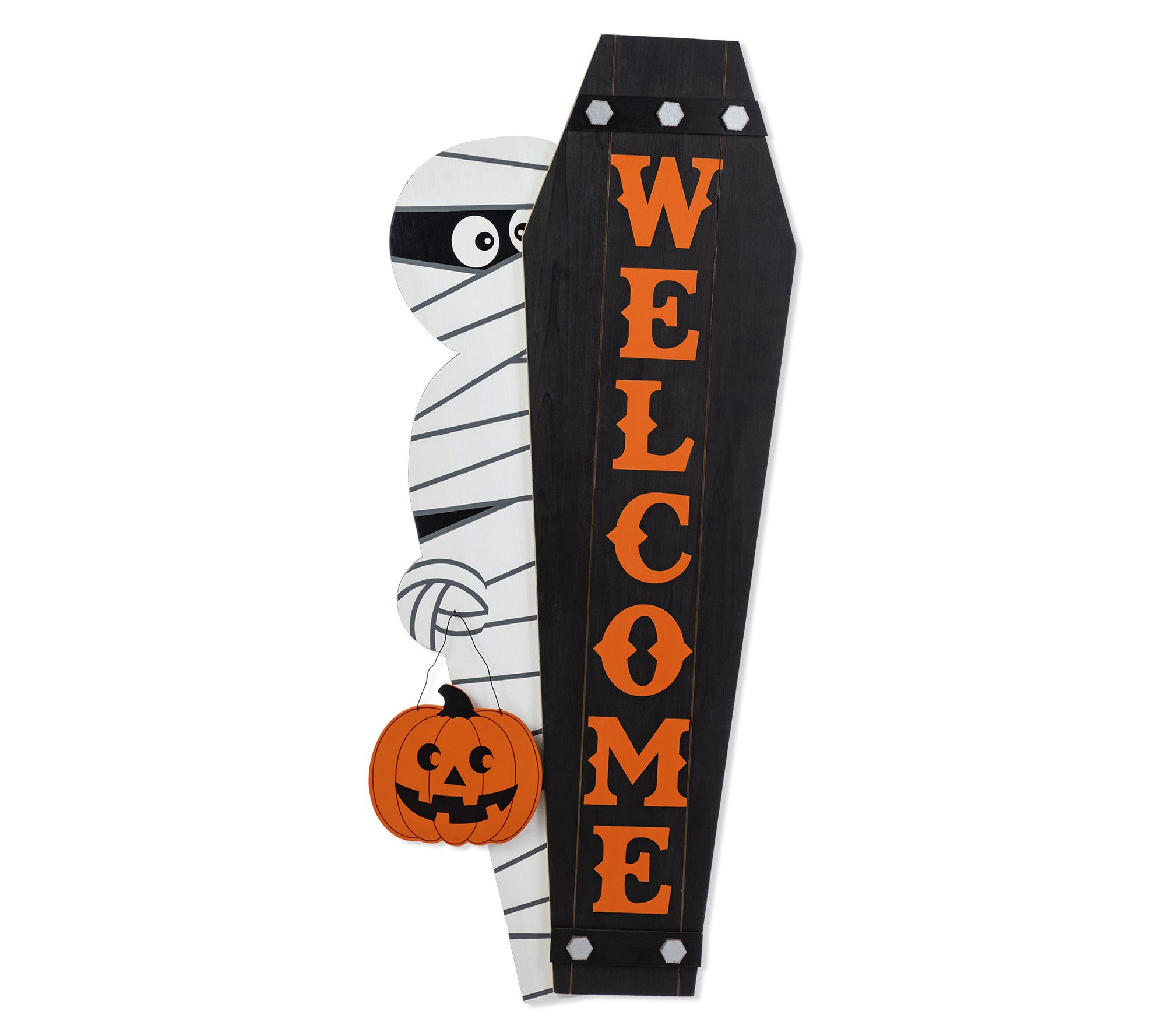 Halloween night feels a little more fun when guests are welcomed by playful porch decor. Set the scene for trick-or-treaters with this mummy holding a pumpkin and matching "WELCOME" coffin sign -- whether placed together or separately, each piece adds festive spirit to your entryway. Easy to assemble and crafted from solid wood, these decorations are ready to help create a memorable October display. From Glitzhome.
