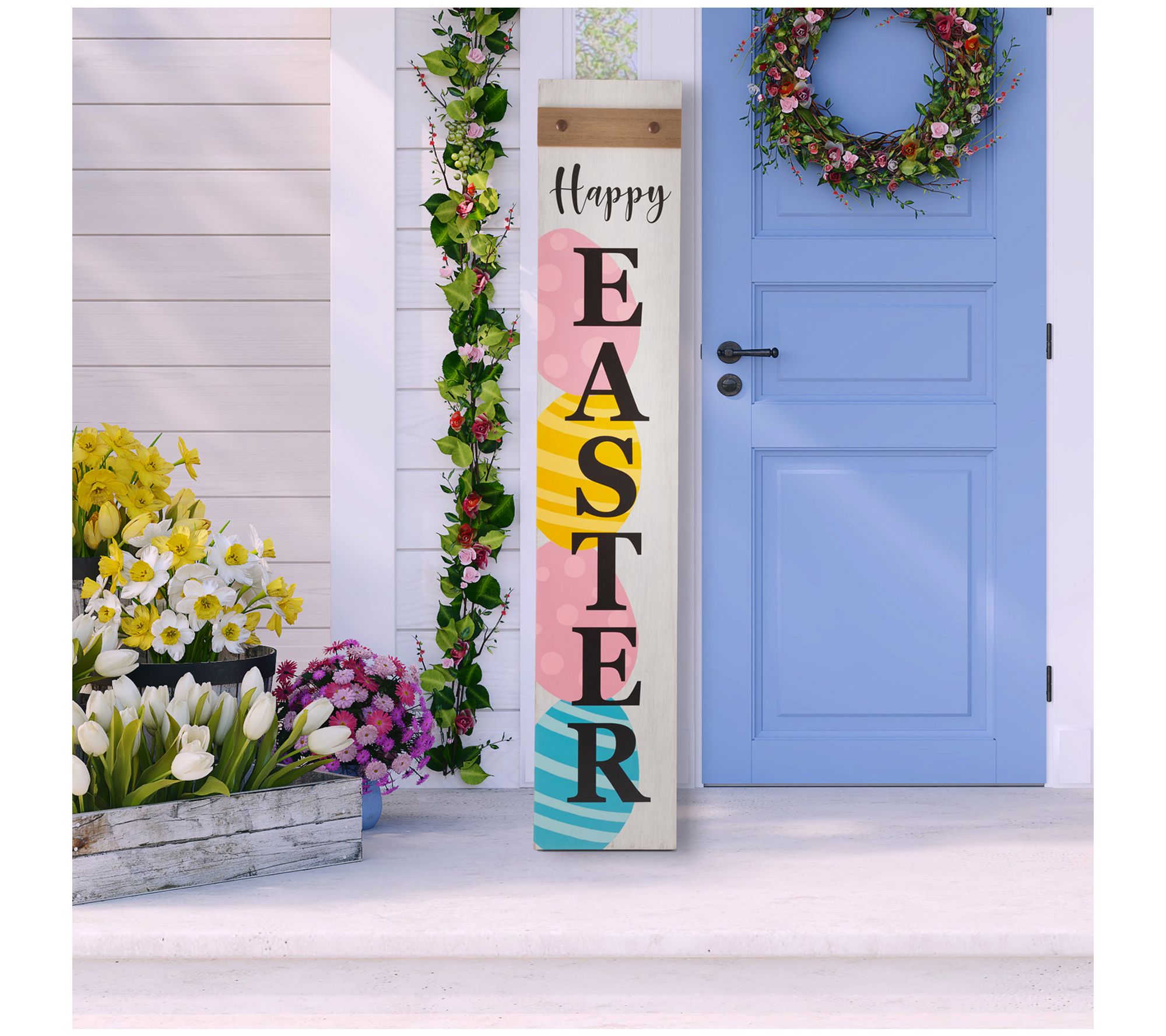 Greet your guests in colorful style with this Happy Easter porch sign. Adorned with vibrant Easter Eggs, it offers a warm welcome to any visitor. From Glitzhome.