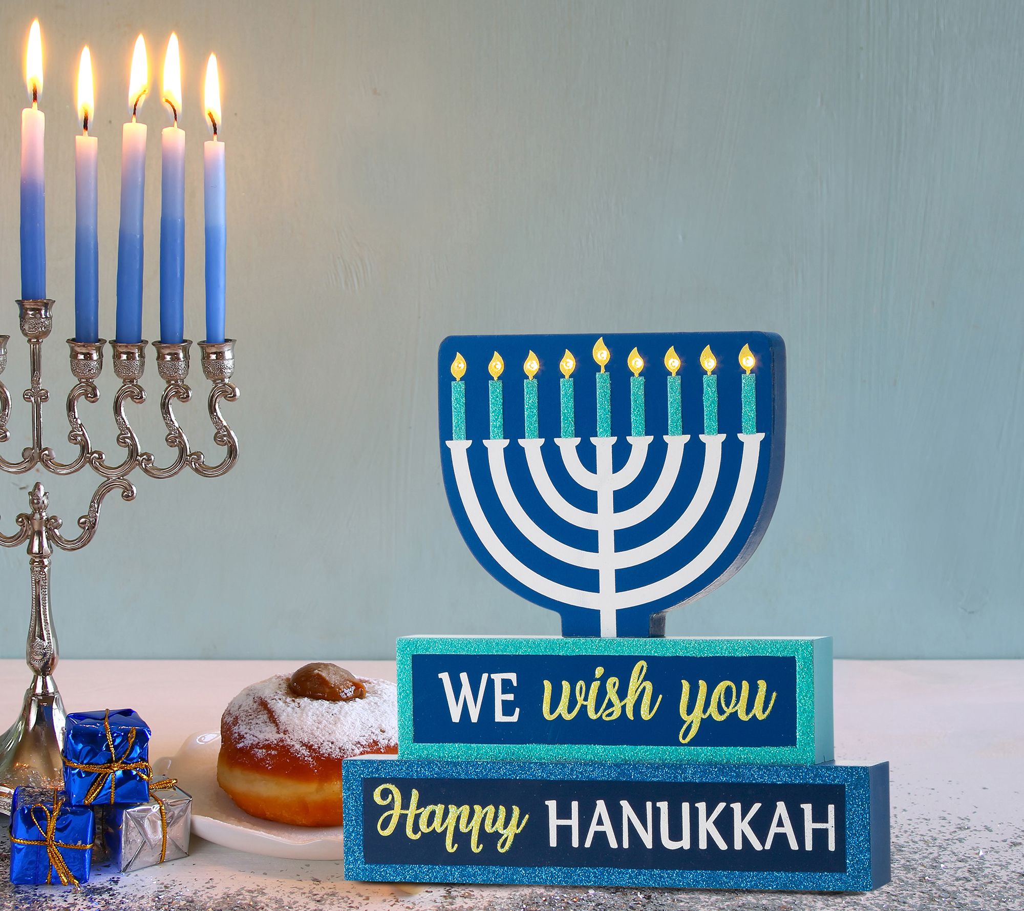 Glitzhome HAPPY HANUKKAH And Menorah LED Lighted Block Sign
