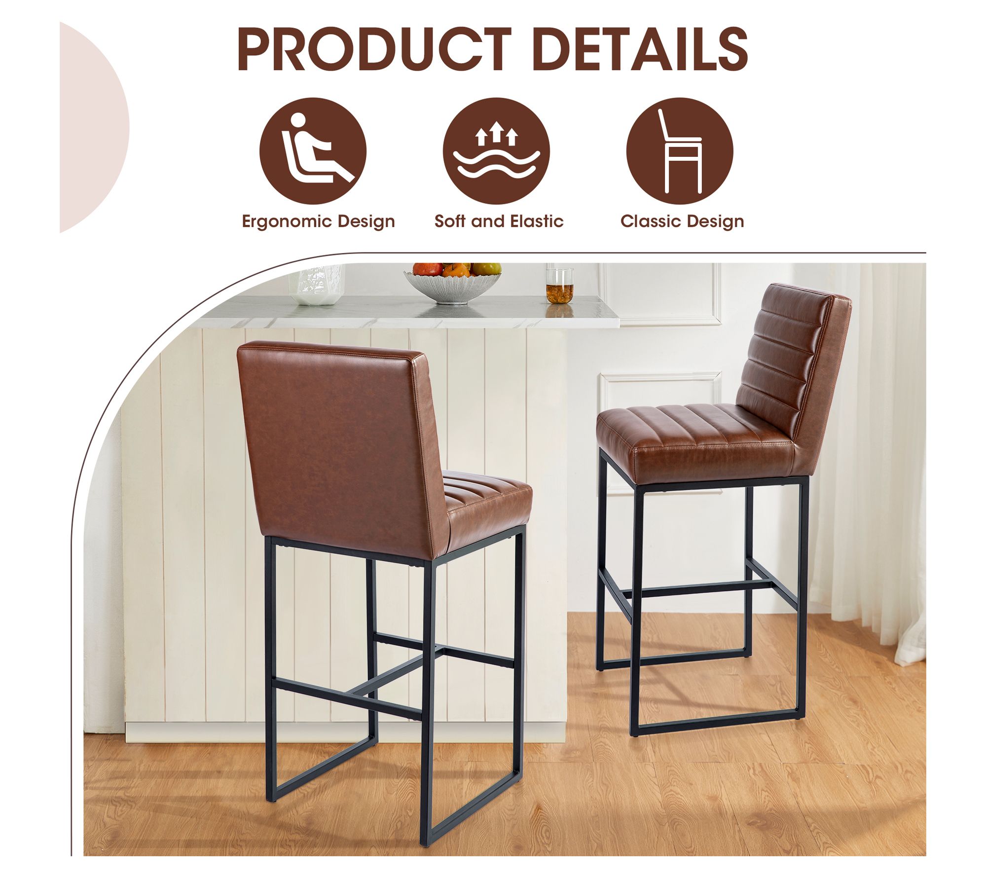 Evenings with friends or slow mornings at the kitchen island feel effortlessly chic when perched on this stylish set. Sleek faux leather, generous foam padding, and a supportive high back make every seat a comfortable spot to linger, while the sturdy metal sled base and integrated footrest keep you supported. Slide each armless stool under the counter with ease after meals. From Glitzhome.